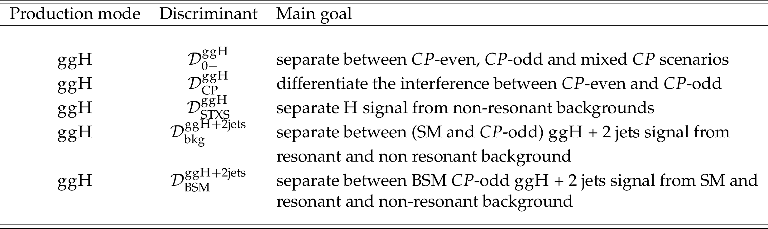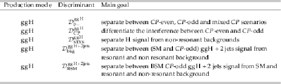 List of discriminants for separating anomalous couplings from the SM contribution in the $ \mathrm{H}\mathrm{g}\mathrm{g} $ analysis. The third column indicates the targeted discrimination for that specific observable. For the $ \mathcal{D}_{0-}^{\mathrm{g}\mathrm{g}\mathrm{H}} $ discriminant, the ``$ \mathrm{g}\mathrm{g}\mathrm{H} $" label indicates that this observable is constructed using matrix elements computed for the $ \mathrm{g}\mathrm{g}\mathrm{H} $ production process to differentiate it from the equivalent discriminant for the VBF process ($ \mathcal{D}^\mathrm{VBF}_\mathrm{0-} $). Discriminants in this table are only used for event categorization. |