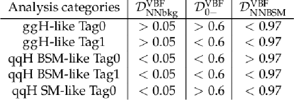 Definition of the $ \mathrm{VBF} $ categories based on the values of the discriminants $ \mathcal{D}^\mathrm{VBF}_\mathrm{NNbkg} $, $ \mathcal{D}^\mathrm{VBF}_\mathrm{0-} $ and $ \mathcal{D}^\mathrm{VBF}_\mathrm{NNBSM} $. |