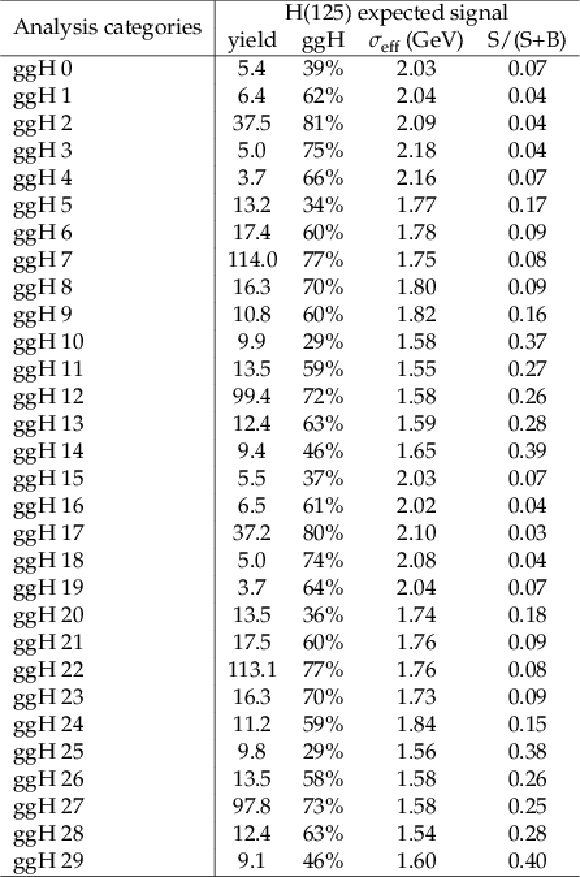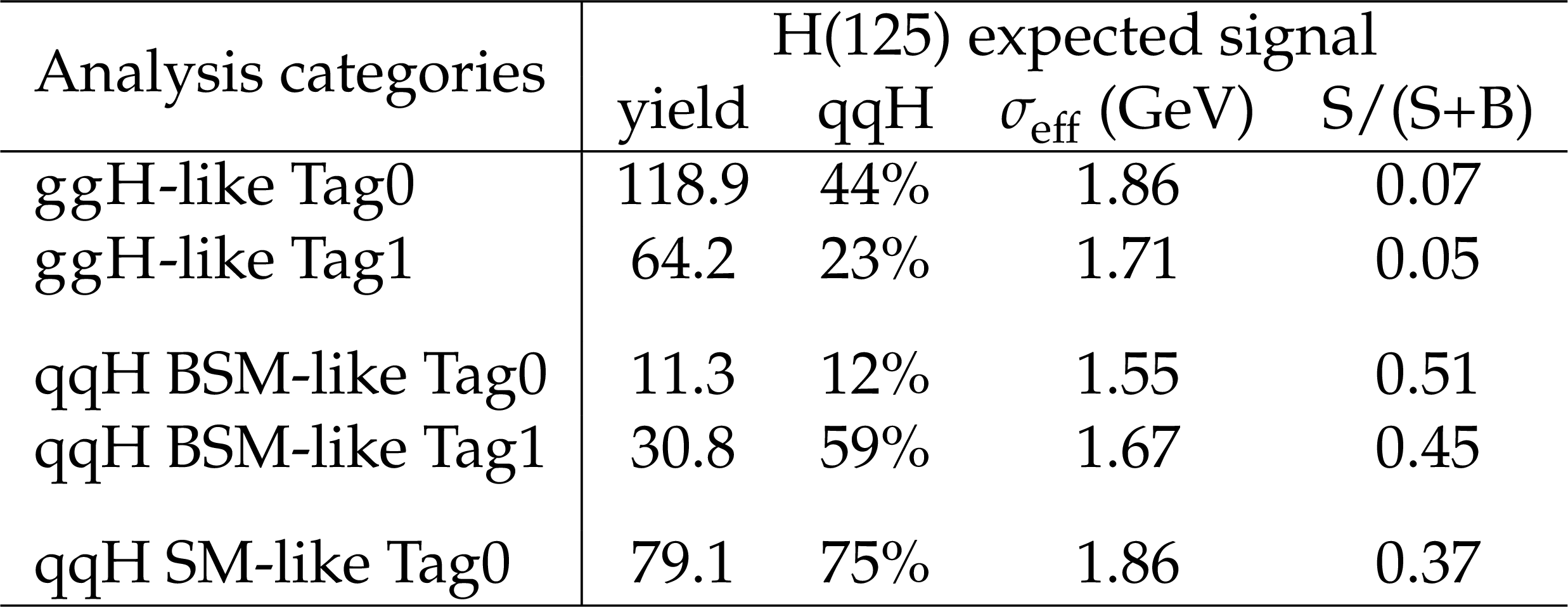The expected number of signal events in the case of SM H with $ m_\mathrm{H}= $ 125 GeV in analysis categories targeting $ \mathrm{g}\mathrm{g}\mathrm{H} $ production associated with two jets, shown for an integrated luminosity of 138 fb$ ^{-1} $. The fraction of the total number of events arising from the $ \mathrm{g}\mathrm{g}\mathrm{H} $ production mode in each analysis category is provided. The $ \sigma_{\text{eff}} $, defined as the smallest interval containing 68.3% of the $ m_{\gamma\gamma} $ distribution, is listed for each analysis category. The final column shows the expected ratio of signal to signal-plus-background, S/(S+B), where S and B are the numbers of expected signal and background events in a $ \pm1\sigma_{\text{eff}} $ window centered on $ m_\mathrm{H} $. |