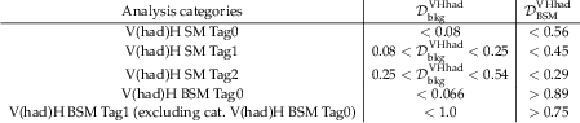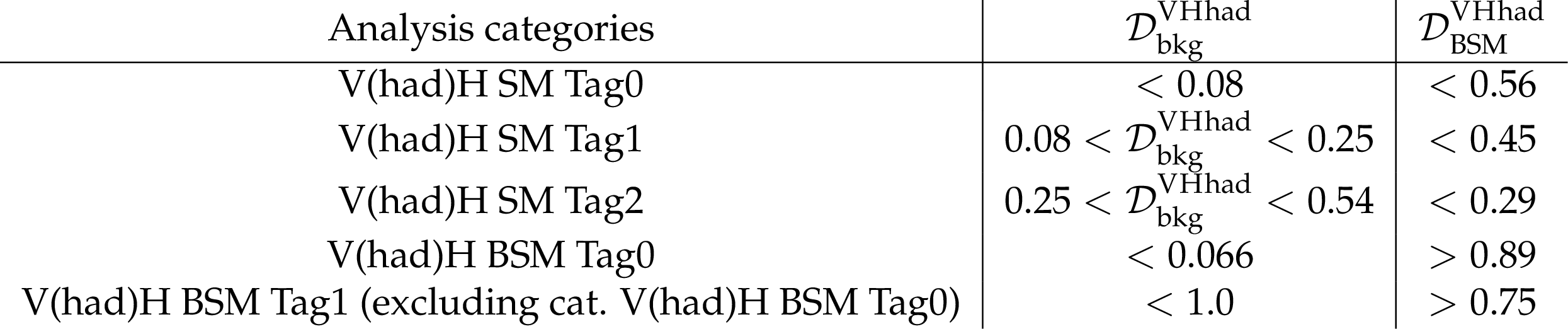 Definition of the V(had)H categories (i.e. VH events where the vector boson decays hadronically) based on the values of the discriminants $ \mathcal{D}^\mathrm{\mathrm{V}\mathrm{H} had}_\mathrm{bkg} $ and $ \mathcal{D}^\mathrm{\mathrm{V}\mathrm{H} had}_\mathrm{BSM} $. |