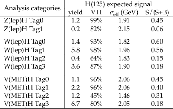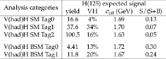 The expected number of signal events in the case of SM H with $ m_\mathrm{H}= $ 125 GeV in analysis categories targeting VH associated production in which the vector boson decays hadronically, shown for an integrated luminosity of 138 fb$ ^{-1} $. The fraction of the total number of events arising from the VH production mode in each analysis category is provided. Entries with values less than 0.1% are not shown. The $ \sigma_{\text{eff}} $, defined as the smallest interval containing 68.3% of the $ m_{\gamma\gamma} $ distribution, is listed for each analysis category. The final column shows the expected ratio of signal to signal-plus-background, S/(S+B), where S and B are the numbers of expected signal and background events in a $ \pm1\sigma_{\text{eff}} $ window centered on $ m_\mathrm{H} $. |