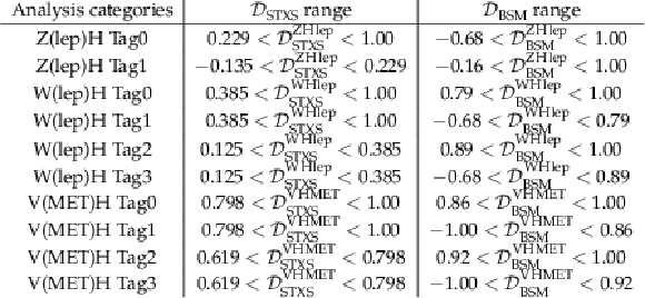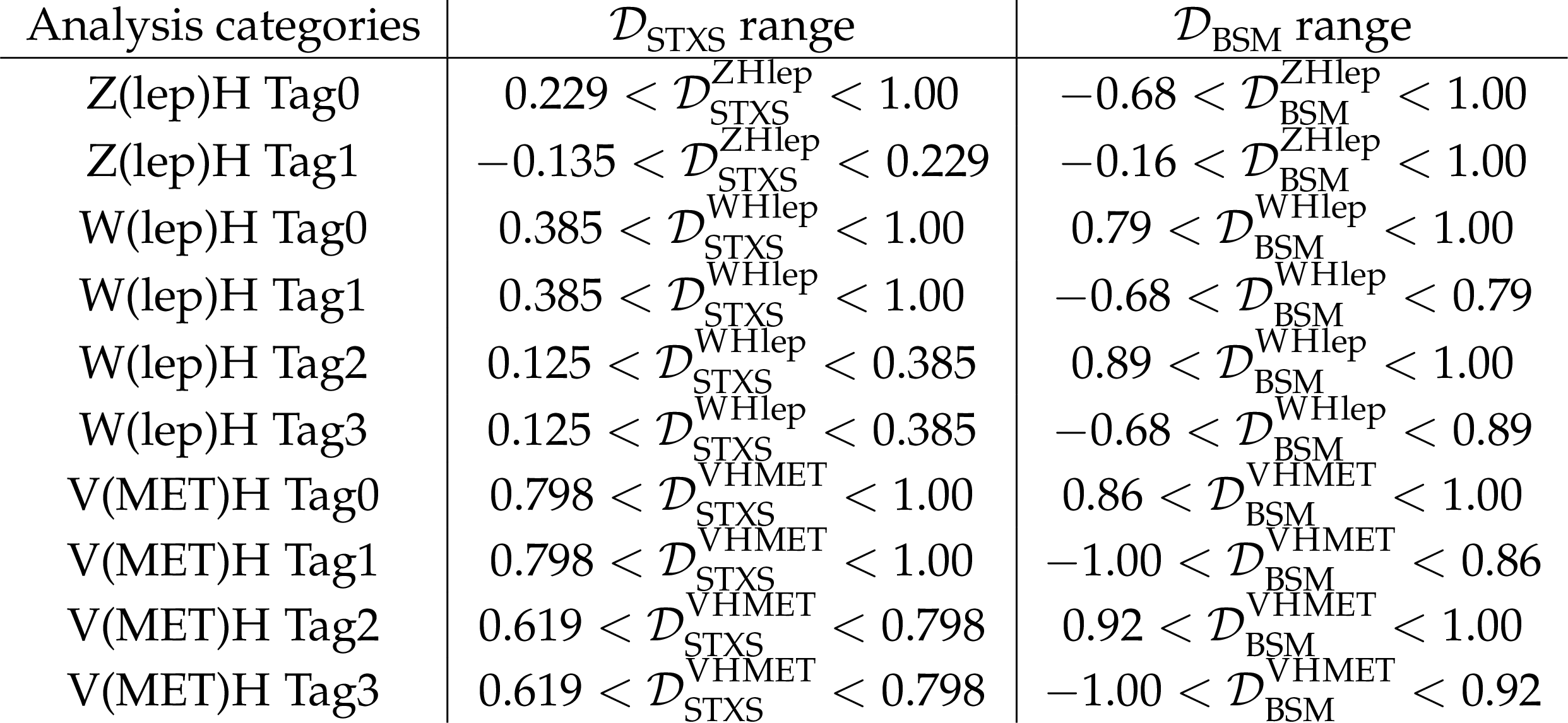 Definition of the V(lep)H categories based on the values of the discriminants $ \mathcal{D}_\mathrm{STXS} $ and $ \mathcal{D}_\mathrm{BSM} $. |