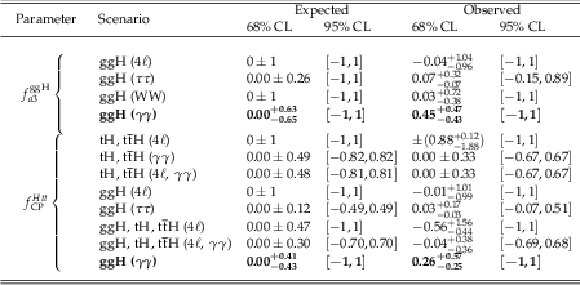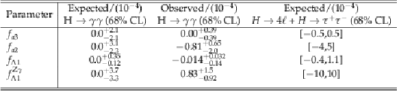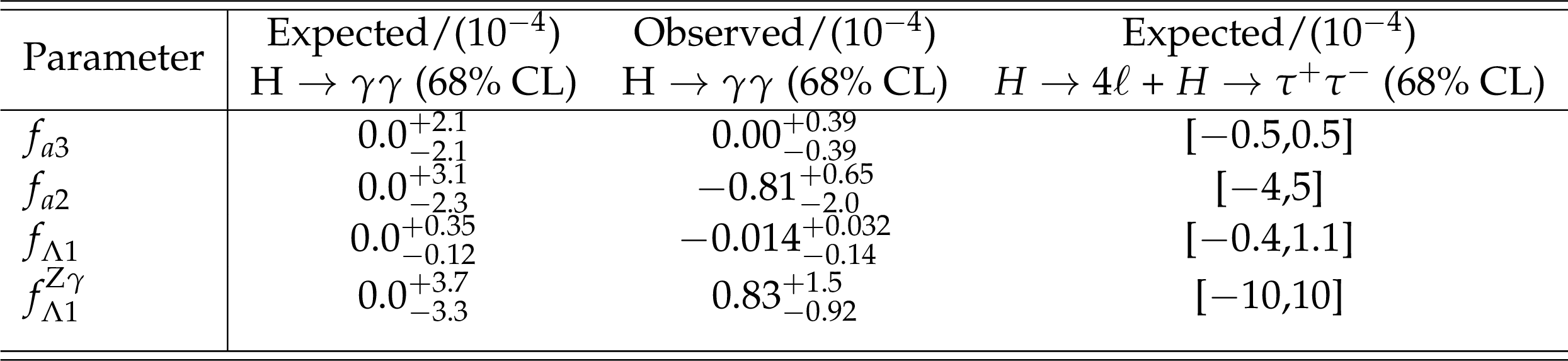 Summary of expected and observed allowed 68% CL intervals on $ \mathrm{H}\mathrm{V}\mathrm{V} $ anomalous coupling parameters, for the $ \mathrm{H}\mathrm{V}\mathrm{V} $ analysis described in this document and, for comparison, for the combination of $ \mathrm{H}\to4\ell $ + $ \mathrm{H}\to\tau\tau $ channels in [none-none-none]. |