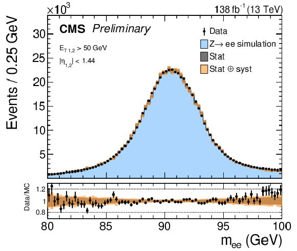 Comparison of the dielectron invariant mass distribution in data and simulation for $ \mathrm{Z}\rightarrow\mathrm{e}\mathrm{e} $ events after applying only the electron energy corrections. Both electrons are required to have $ E_\mathrm{T} > $ 50 GeV and to be reconstructed in the ECAL barrel region. The error bands account for the statistical uncertainty and the systematic uncertainty associated with the energy scale corrections. |
