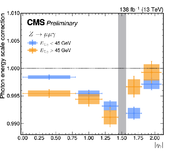 Photon energy scale corrections as a function of $ |\eta_\gamma| $ in two $ E_{\mathrm{T}} $ bins, using $ \mathrm{Z}\rightarrow\mu\mu\gamma $ events, after applying the electron energy scale and uniformity corrections. The shaded bands indicate the statistical uncertainties from the simulation, while the error bars show the total statistical uncertainties. |