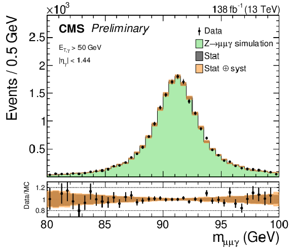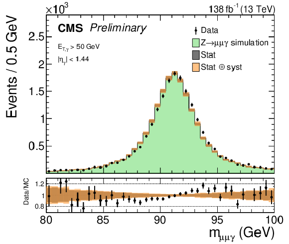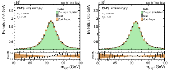 Comparison of the three-body invariant mass distribution in data and simulation for $ \mathrm{Z}\rightarrow\mu\mu\gamma $ events in the ECAL barrel region ($ |\eta_\gamma| < $ 1.44) with $ E_{\mathrm{T},\gamma} > $ 50 GeV. The left panel shows the distribution after the first two calibration stages, without the final photon energy scale correction derived from FSR photons. The right panel shows the same distribution after applying the final photon energy scale corrections. |