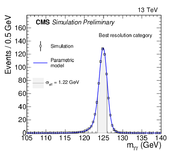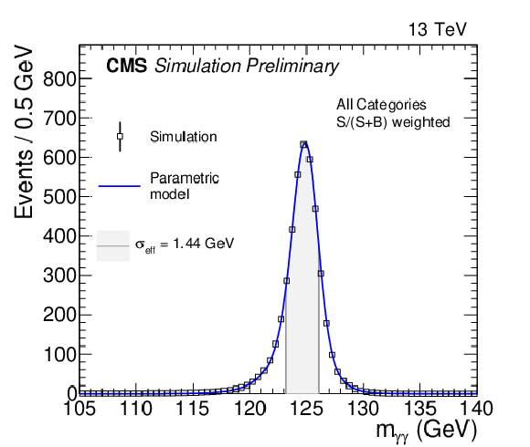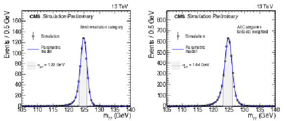 Signal model for the analysis category with the best mass resolution (left), and for all categories combined after scaling by their corresponding $ \textrm{S/(S+B)} $ ratios (right), for a simulated $ \mathrm{H}\rightarrow\gamma\gamma $ signal sample with $ m_{\textrm{H}} = $ 125 GeV. All Higgs boson production modes are summed. |