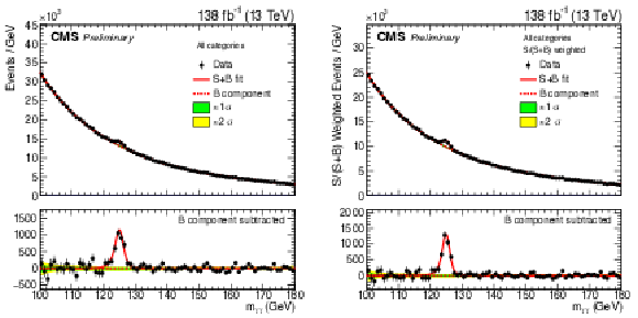Data and combined signal and background model fit for all analysis categories, unweighted (left) and weighted by their sensitivity (right). The one (green) and two (yellow) standard deviation bands include the uncertainties in the background component of the fit. The lower panel shows the residuals after the background is subtracted. |