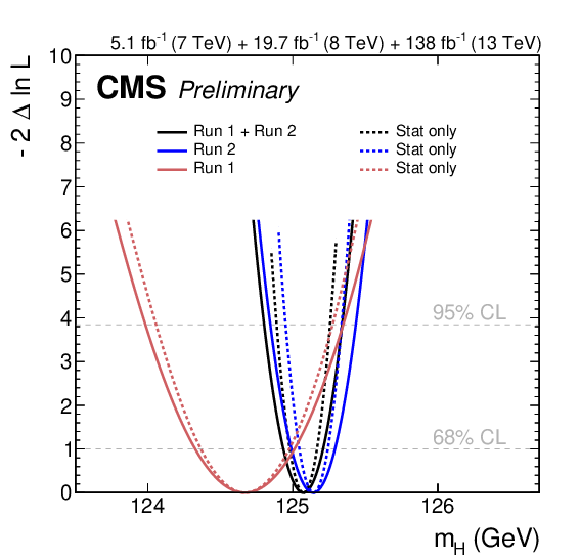 Likelihood scans of the Higgs boson mass measured in the $ \mathrm{H}\rightarrow\gamma\gamma $ decay channel for the Run 1 and Run 2 datasets, and their combination. Solid lines show the full likelihood scan including systematic uncertainties, while dashed lines correspond to the statistical-only case. |