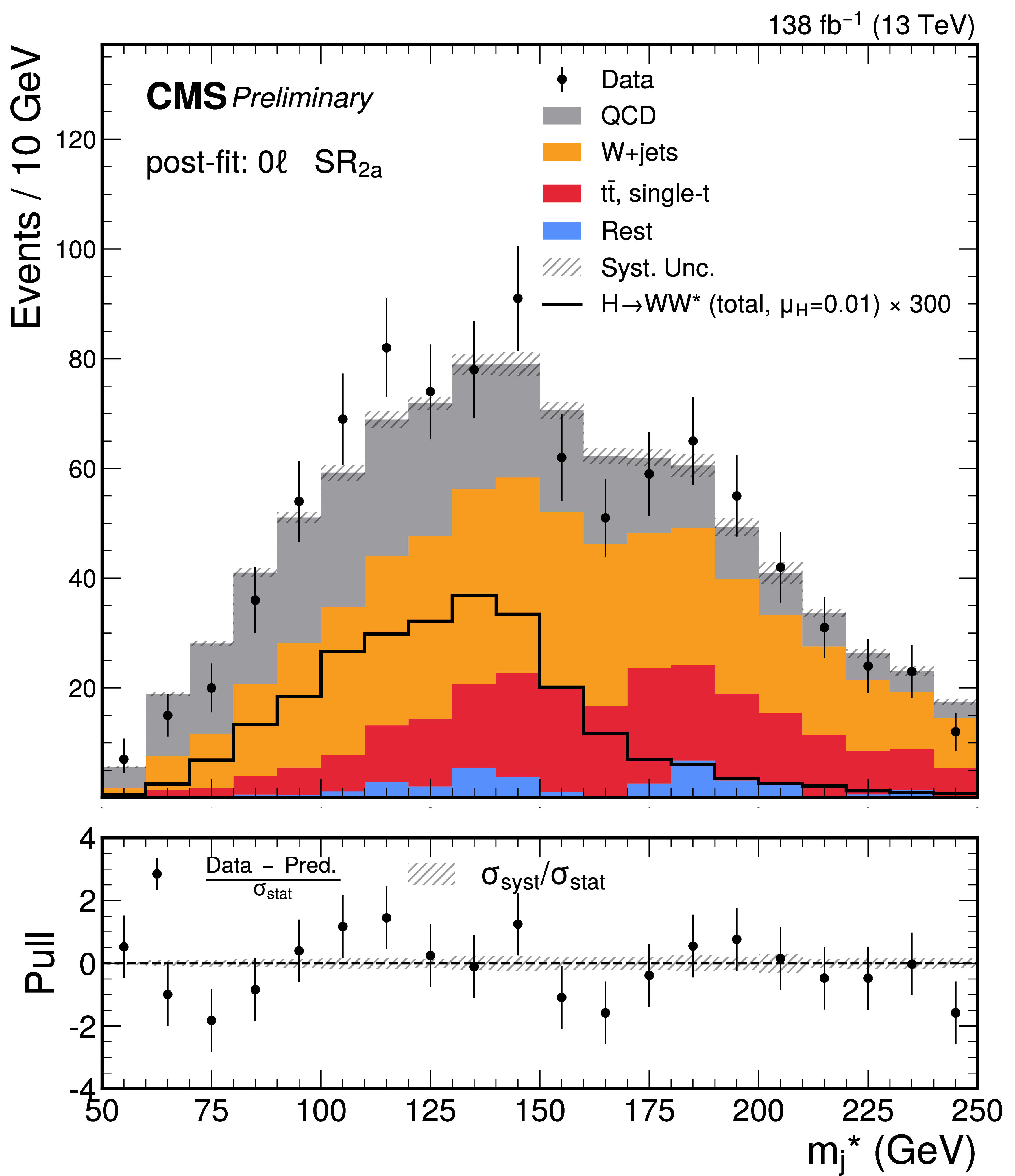 Post-fit $ m^*_{\text{j}} $ distributions for the predicted background, observed data, and signal in the SRs of the 0 $ \ell $ channel. From upper to lower and left to right, the plots correspond to $ \text{SR}_\text{1a} $, $ \text{SR}_\text{2a} $, $ \text{SR}_\text{1b} $, and $ \text{SR}_\text{2b} $, respectively. The lower panel of each plot presents the pull distribution, as well as the $ \sigma_\text{syst} $ normalized to the $ \sigma_\text{stat} $. The signal is scaled by its best-fit value, $ \mu_\mathrm{H} = $ 0.01, from the combined 0 $ \ell $ and 1 $ \ell $ channels, and by an additional factor (as labeled) for visibility. |