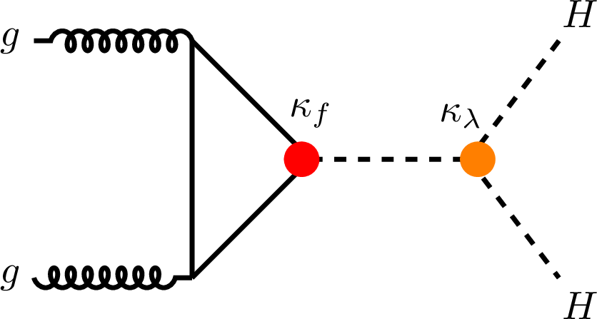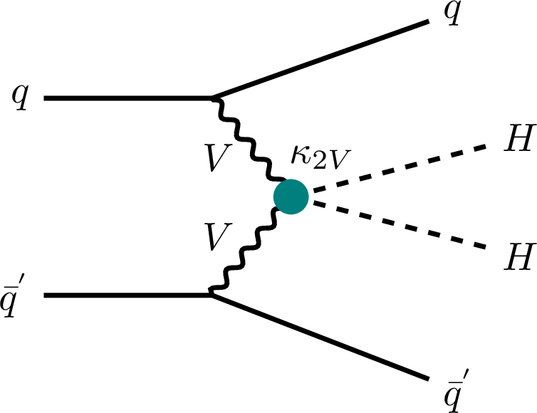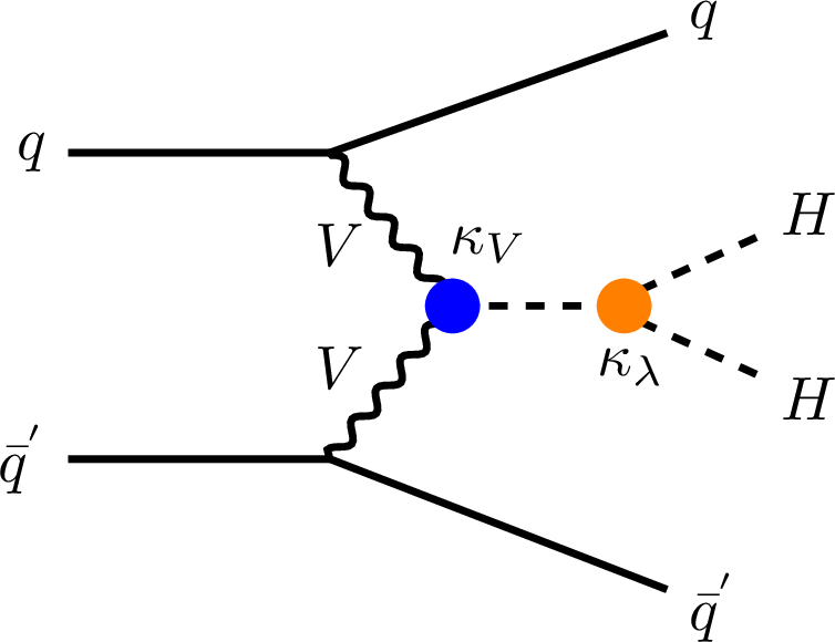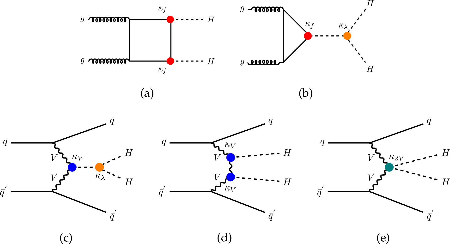 Feynman diagrams that contribute to ggF and VBF HH production at leading order with coupling modifiers affecting the Higgs-to-fermion coupling $ \kappa_f $, to vector-boson coupling $ \kappa_{\text{V}} $, to two-vector-boson vertices $ \kappa_{\text{2V}} $ and self-coupling $ \kappa_{\lambda} $. |