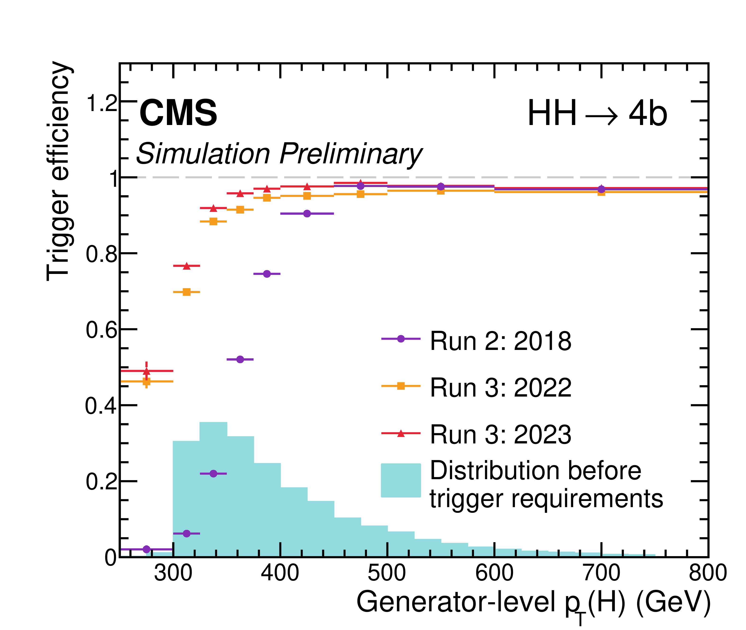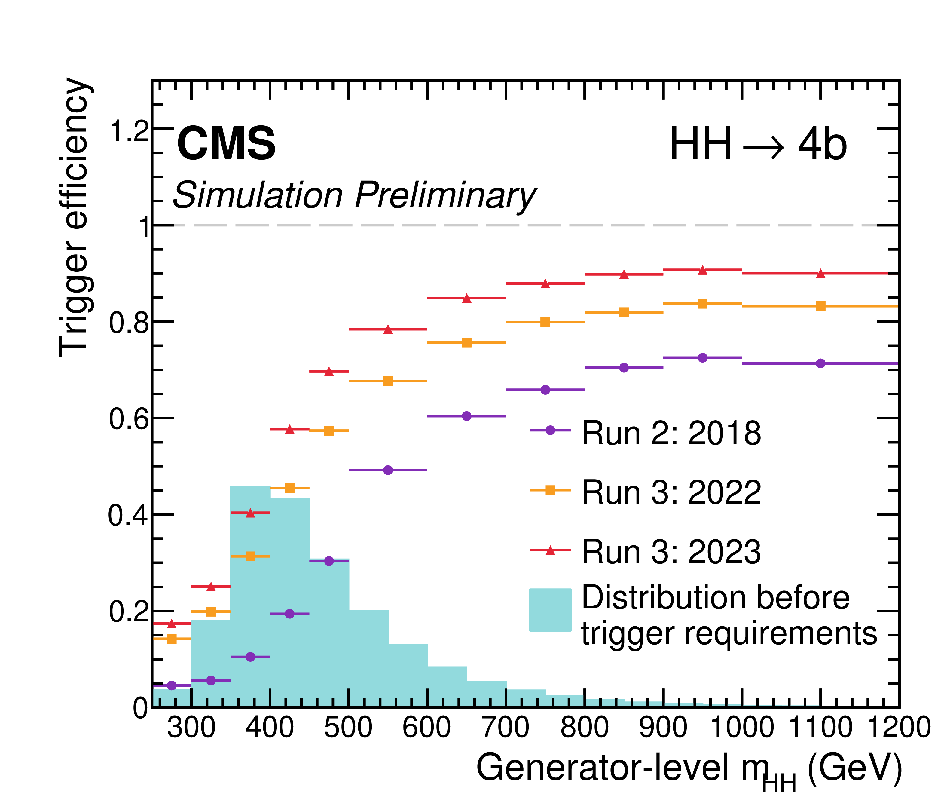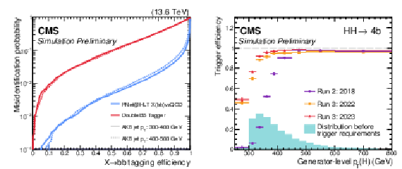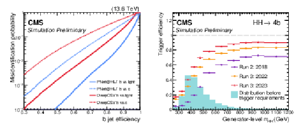 Left: the b tagging performance of the Run 3 PNET@HLT algorithm (in blue) compared to the best-performing algorithm deployed at HLT in Run 2 (DEEPCSV, in red), as evaluated from $ \mathrm{t} \overline{\mathrm{t}} $ simulation on trigger-level AK4 jets with $ p_{\mathrm{T}} > $ 30 GeV and $ {|\eta| < 2.5} $. Right: efficiency of the triggers targeting the resolved $ \mathrm{H}\mathrm{H} \to 4\mathrm{b} $ topology as a function of the generator-level $ m_{\mathrm{H}\mathrm{H}} $ in simulated SM $ \mathrm{H}\mathrm{H} \to 4\mathrm{b} $ signal events in which the generator-level jets from the b quarks produced by $ \mathrm{H}\to \mathrm{b}\overline{\mathrm{b}} $ decays have $ p_{\mathrm{T}} $ larger than 25 GeV and $ {|\eta| < 2.5} $. The teal histogram shows the expected distribution for the SM $ \mathrm{g}\mathrm{g}\mathrm{H}\mathrm{H} $ signal prior to any trigger selections. |