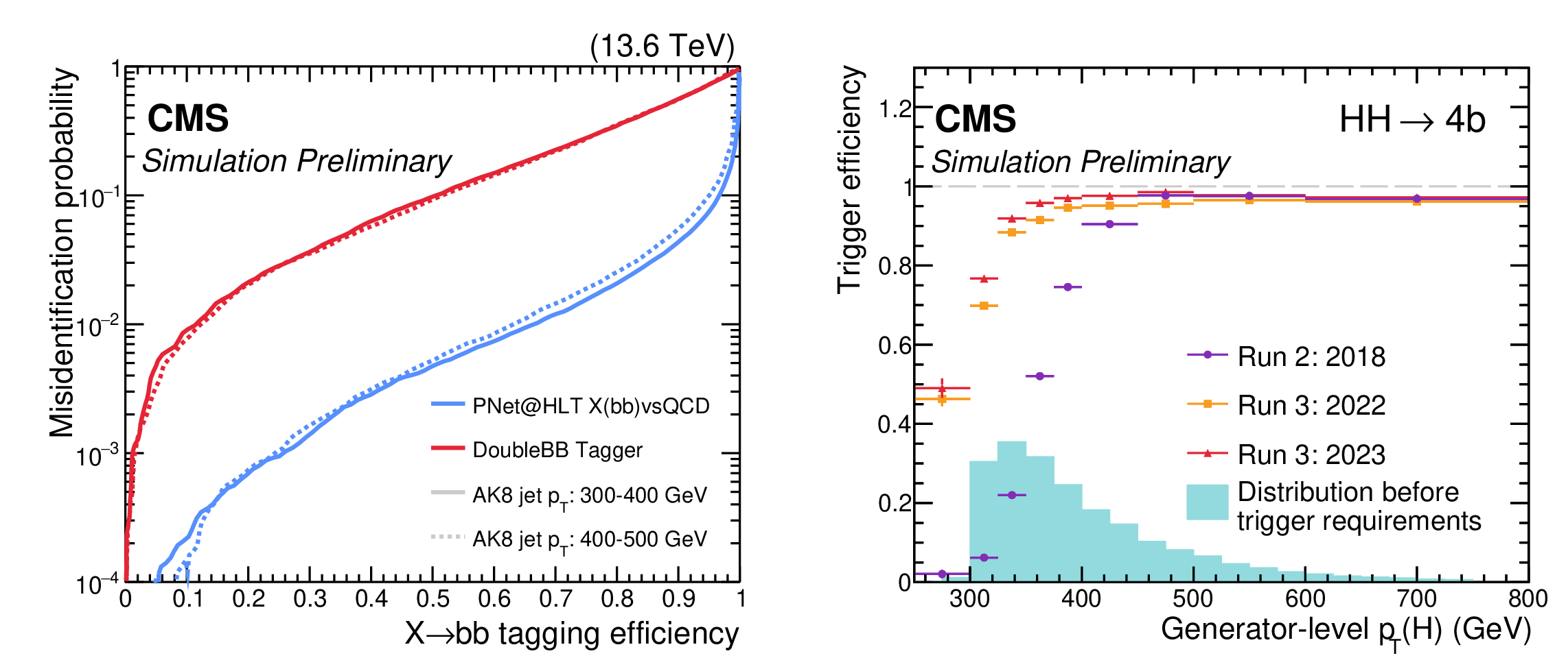 Left: the $ \mathrm{b}\overline{\mathrm{b}} $ tagging performance of the PNET@HLT algorithm (in blue) compared to the highest-performing Run 2 algorithm (DOUBLEBB, in red), as evaluated on AK8 jets in the HLT from simulated $ \mathrm{H}\mathrm{H} \to 4\mathrm{b} $ and QCD multijet events with $ p_{\mathrm{T}} > $ 300 GeV and $ {|\eta| < 2.5} $. Right: efficiency of the logical or of the trigger paths developed for the merged topology, as a function of the generator-level leading H candidate $ p_{\mathrm{T}} $ in simulated SM $ \mathrm{H}\mathrm{H} \to 4\mathrm{b} $ events in which $ {\Delta R(\mathrm{b},\overline{\mathrm{b}}) < 0.8} $. The teal histogram shows the expected distribution for the SM $ \mathrm{g}\mathrm{g}\mathrm{H}\mathrm{H} $ signal prior to any selections. |