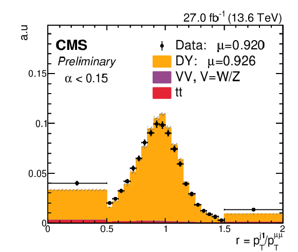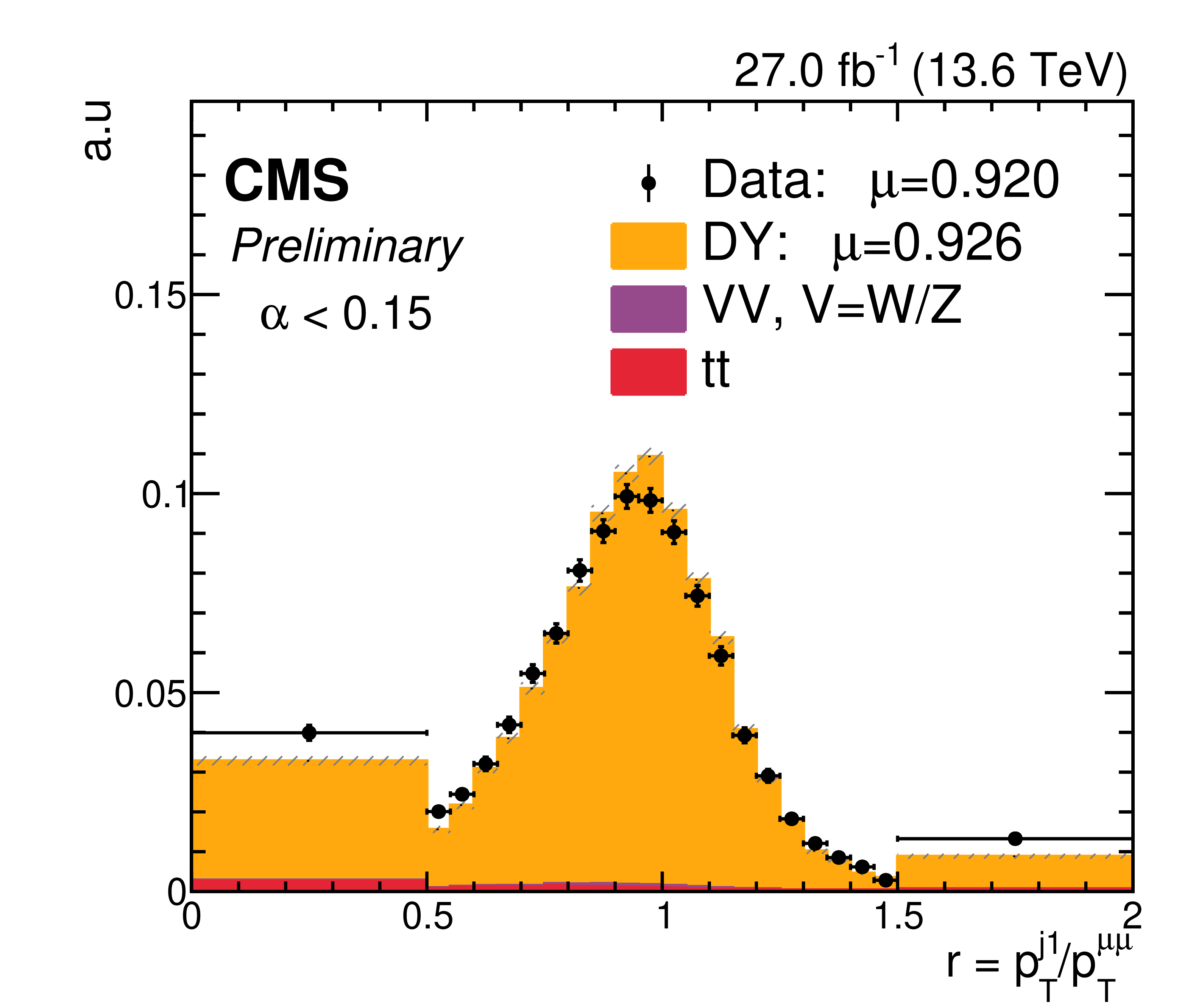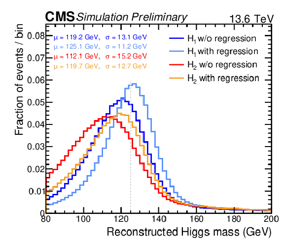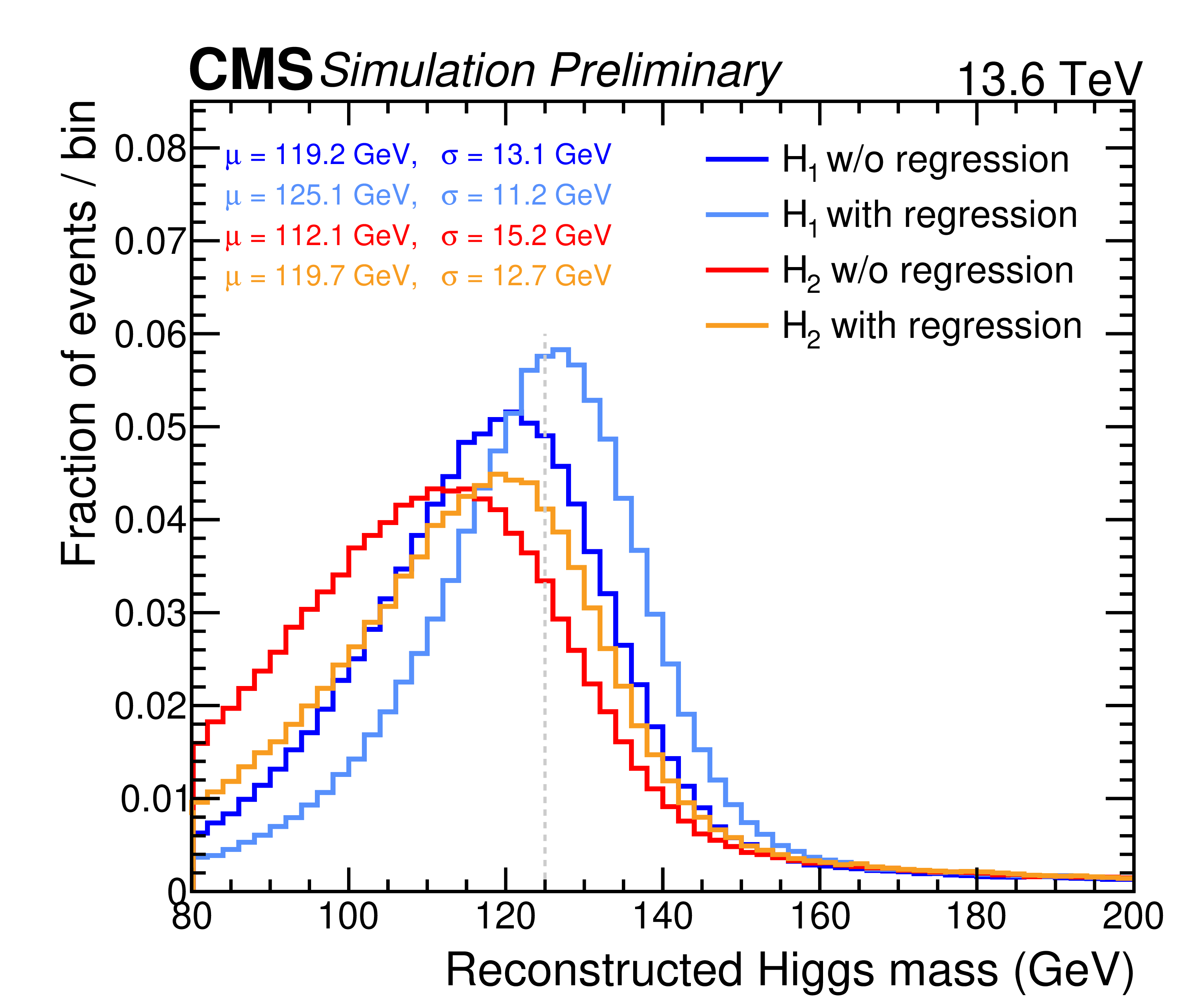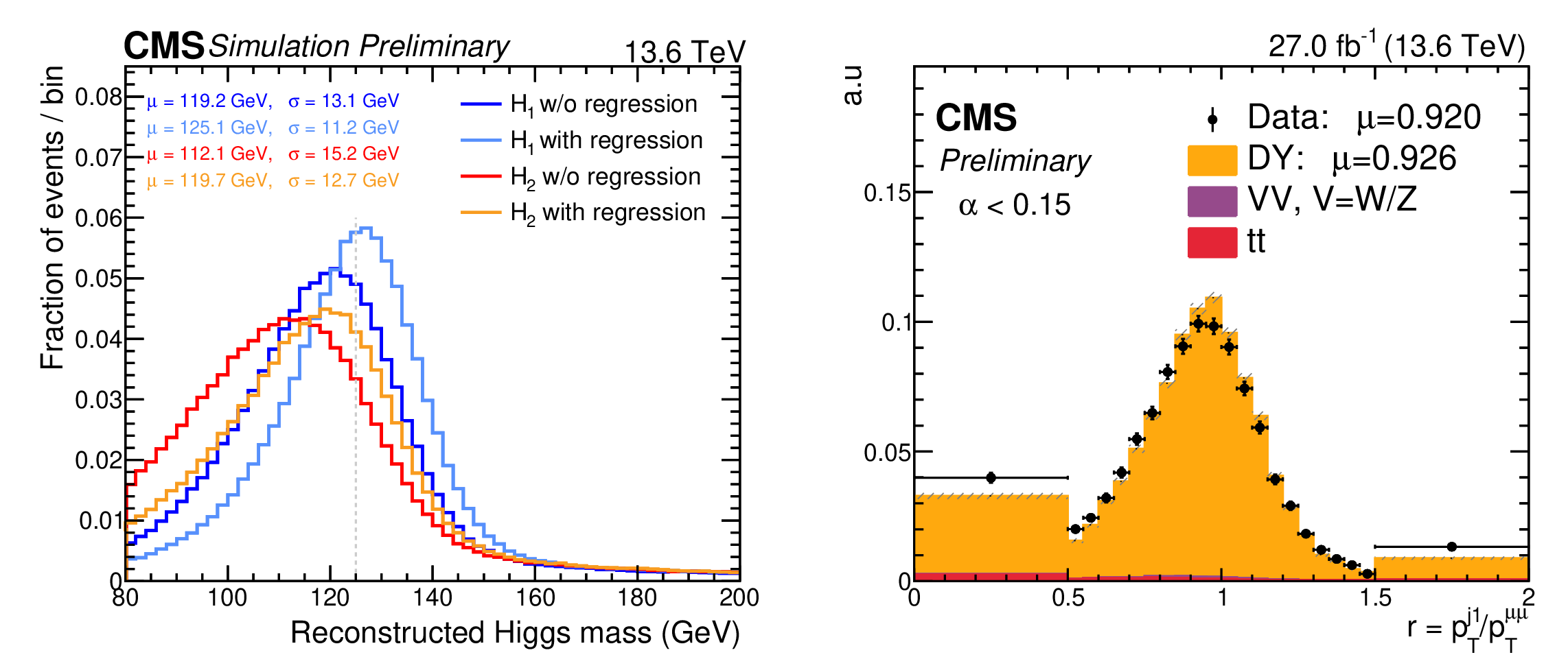 Left: invariant mass distributions for the leading ($ m_{\mathrm{H}_1} $) and subleading ($ m_{\mathrm{H}_2} $) $ p_{\mathrm{T}} \mathrm{H} $ candidates in SM $ \mathrm{H}\mathrm{H} \to 4\mathrm{b} $ events obtained before and after the application of the PNET jet $ p_{\mathrm{T}} $ regression. Right: distribution of the $ p_{\mathrm{T}} $ balance, $ r=p_{\mathrm{T}}^{\mathrm{j_{1}}}/p_{\mathrm{T}}^{\mu\mu} $, in 2023 data and simulated events for the selected $ \mathrm{Z}(\mu\mu)+\mathrm{b}\text{-jet} $ region with $ \alpha=p_{\mathrm{T}}^{\mathrm{j_{2}}}/p_{\mathrm{T}}^{\mu\mu} < $ 0.15, obtained after applying the PNET jet $ p_{\mathrm{T}} $ regression. The $ \mu $ values quoted in the legend correspond to the mean of the distributions. |