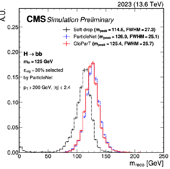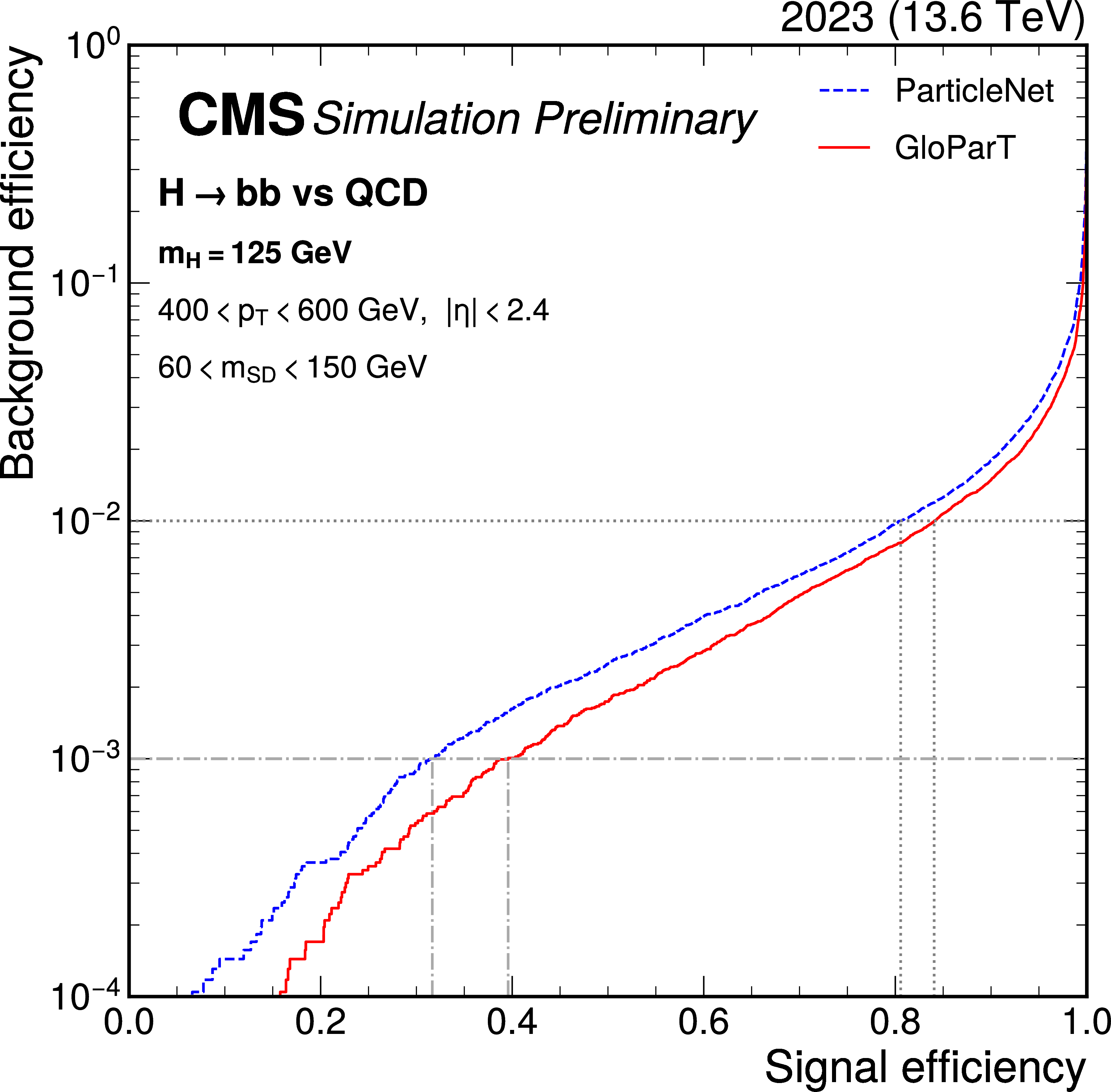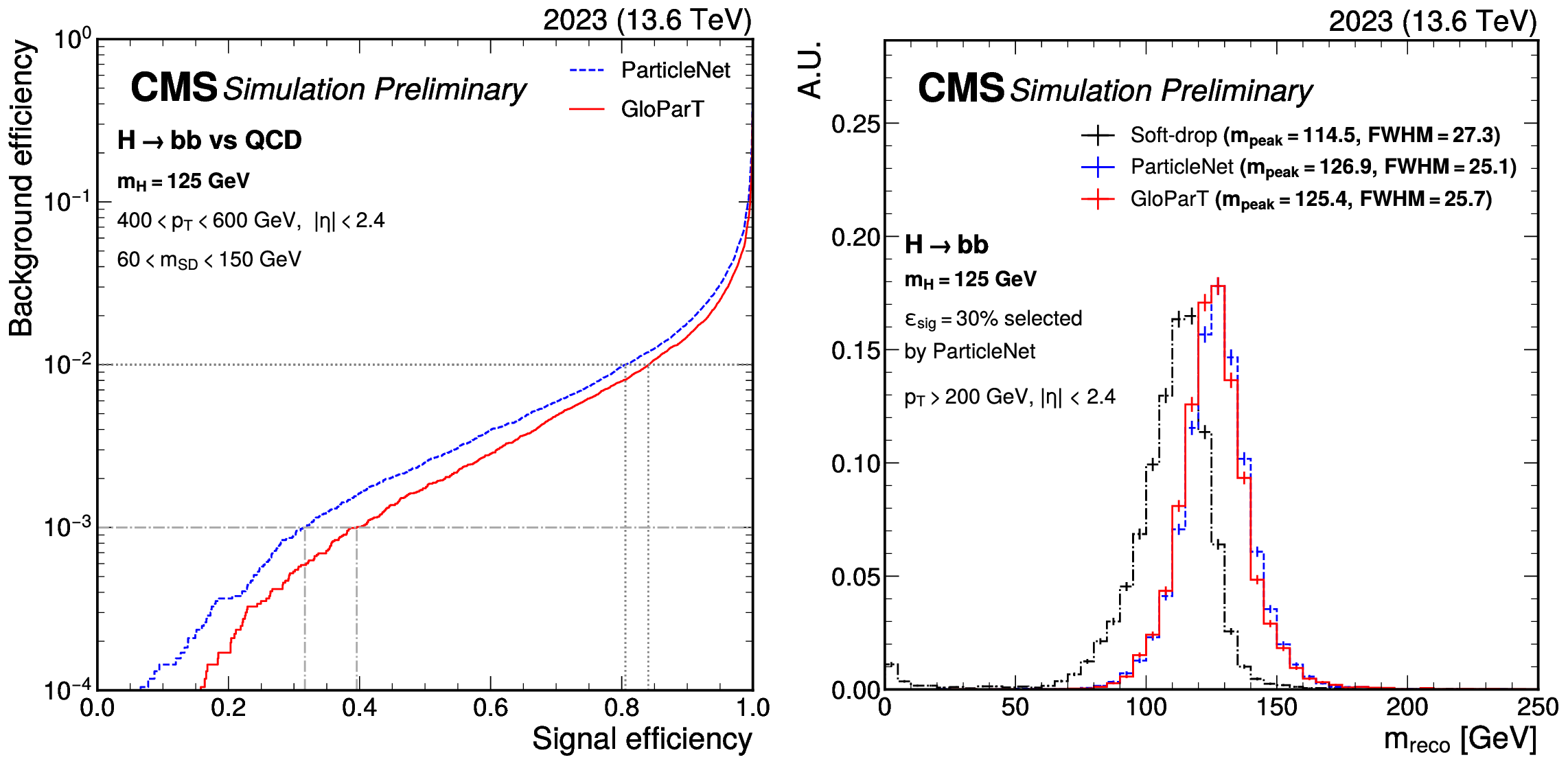 The ROC curve for GLOPART and PNET for discriminating $ \mathrm{H}\to\mathrm{b}\overline{\mathrm{b}} $ from QCD jets with 400 $ < p_{\mathrm{T}} < $ 600 GeV, $ |\eta| < $ 2.4, and 60 $ < m_\text{SD} < $ 150 GeV (left). The mass regression performance for GLOPART and PNET for jets with $ p_{\mathrm{T}} > $ 200 GeV, $ |\eta| < $ 2.4, and satisfying a PNET selection corresponding to 30% signal efficiency (right). The conditions correspond to those during data collection in 2023. |