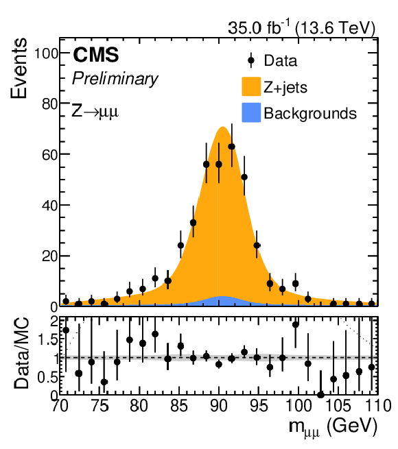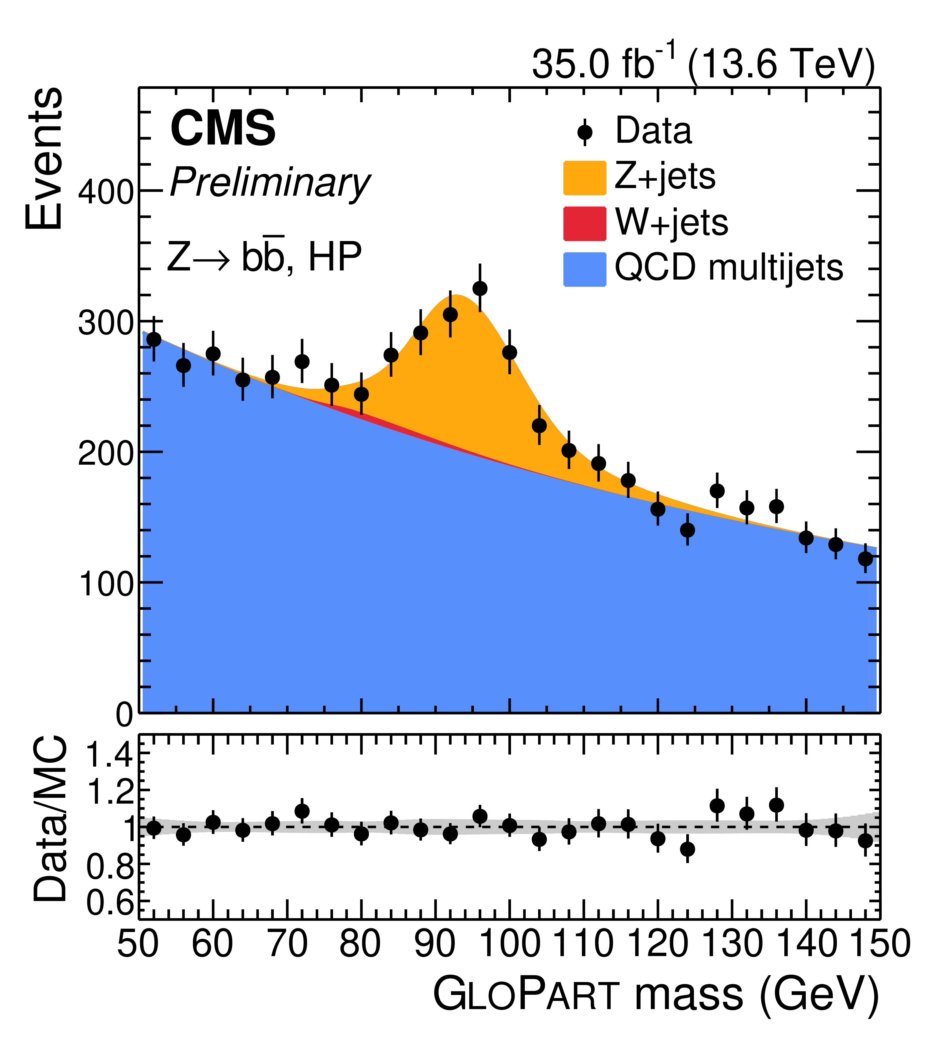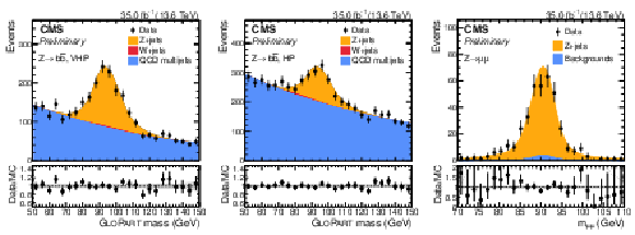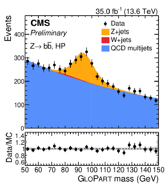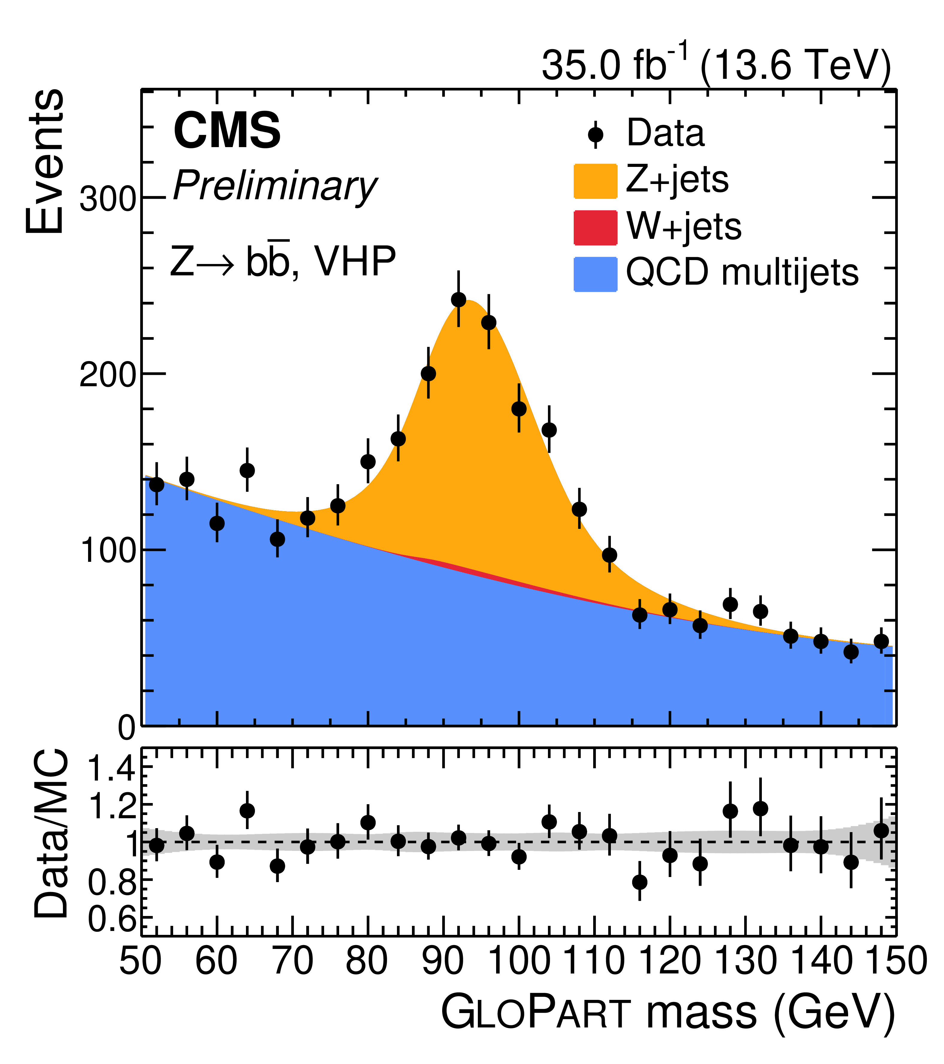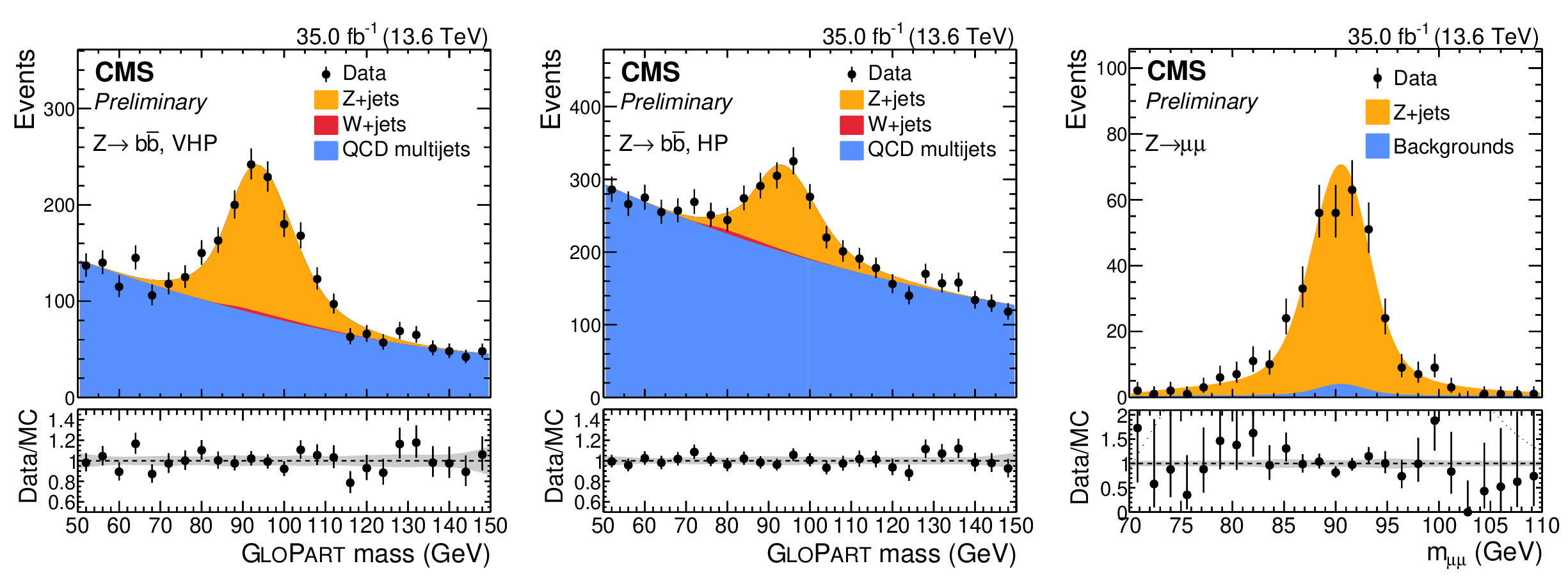 Comparison between data and fit prediction from a simultaneous signal-plus-background fit to the GLOPART regressed jet mass distributions in $ \mathrm{Z} \to \mathrm{b}\overline{\mathrm{b}} $ VHP (left) and HP (middle) categories. Data corresponds to the full integrated luminosity collected by the CMS detector in 2022. The same comparison is performed for the $ m_{\mu\mu} $ distributions in the $ \mathrm{Z} \to \mu\mu $ region (right). Each process considered in the fit is modeled via a parametric function as described in the text. |