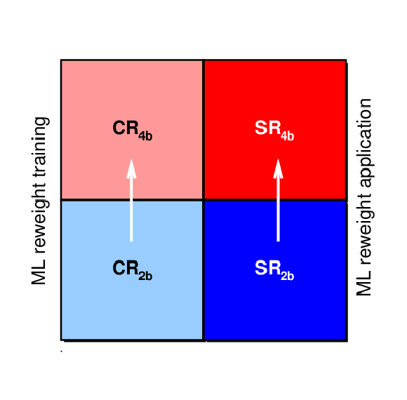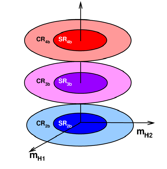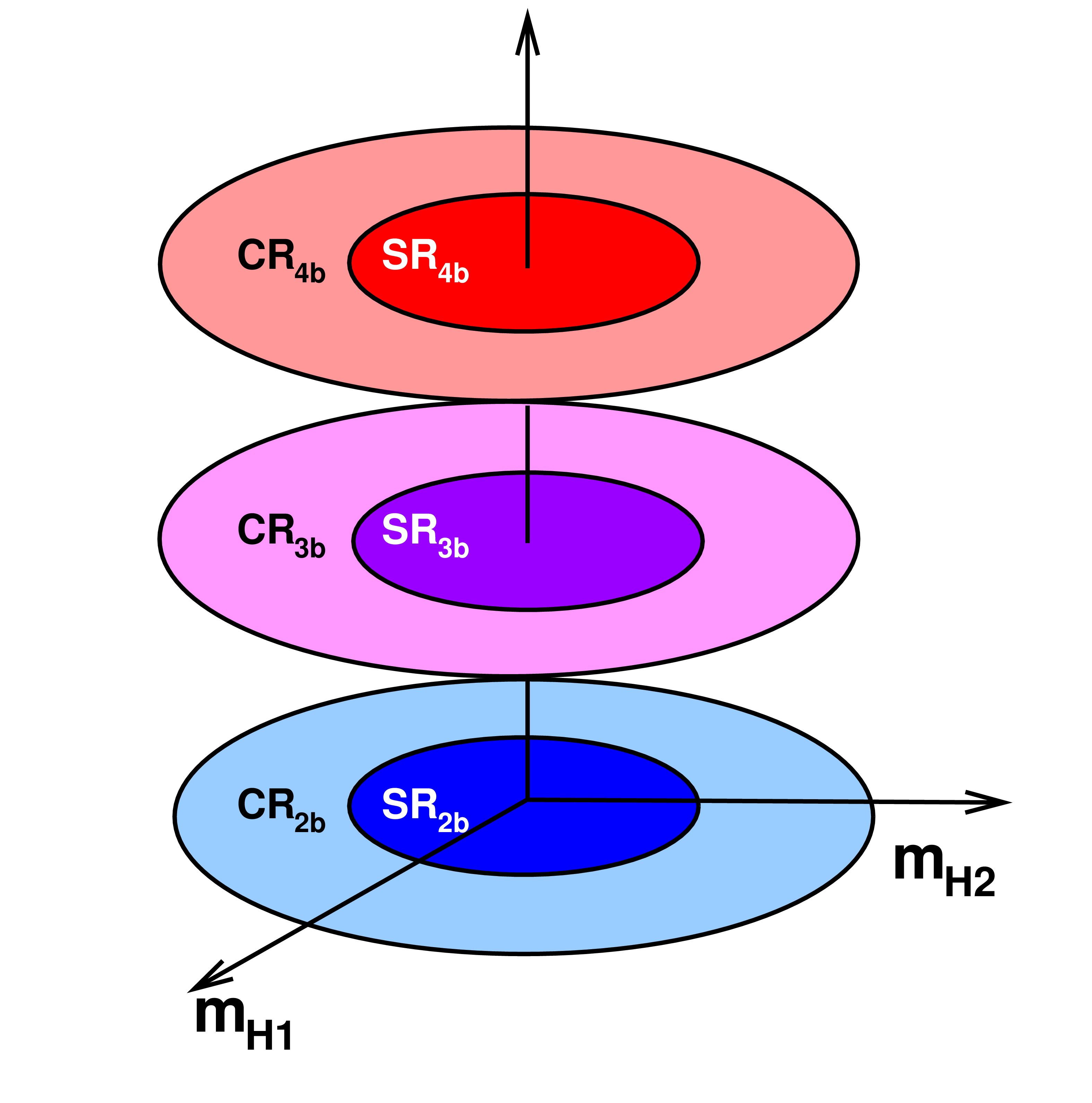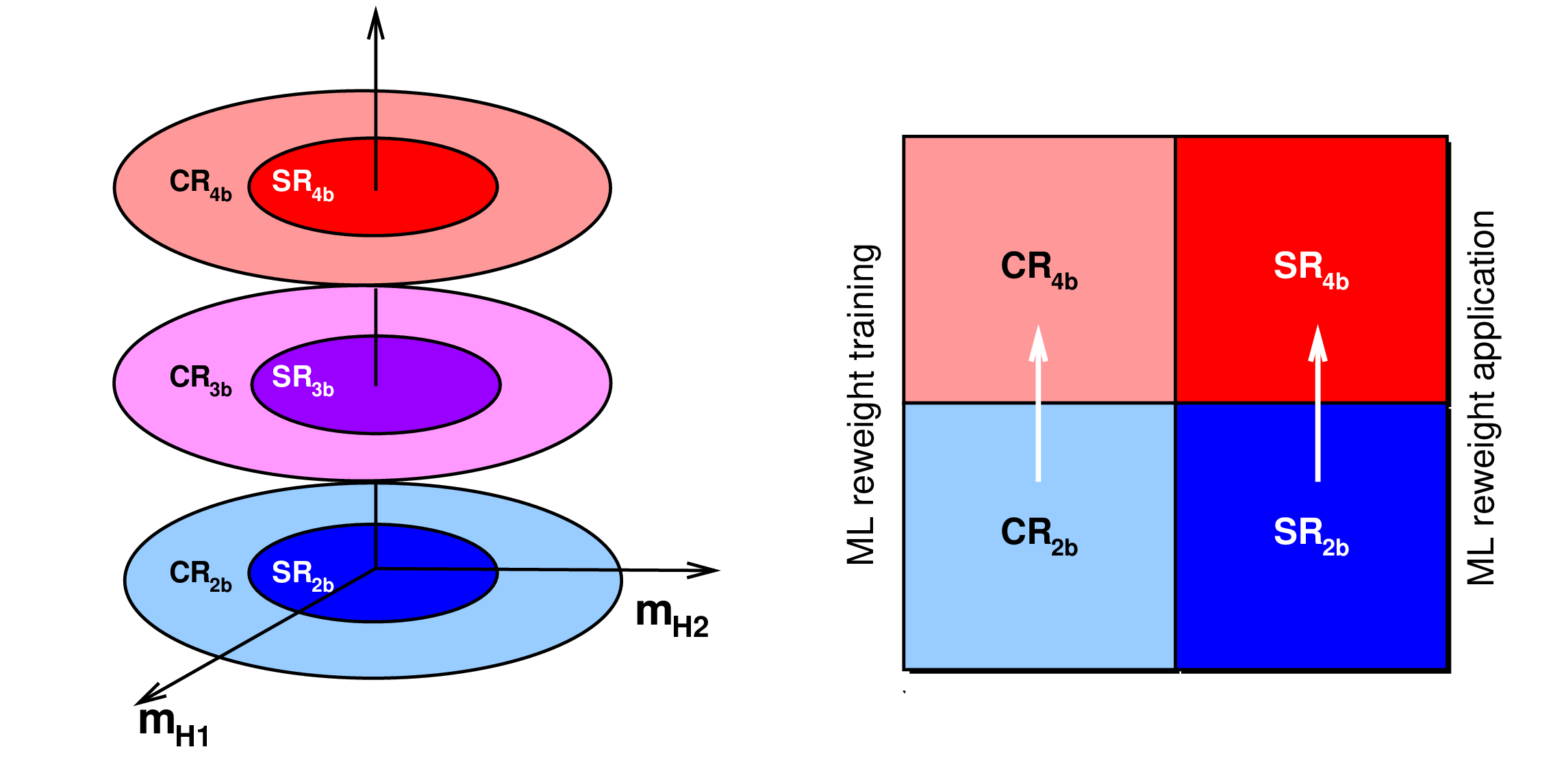 Left: schematic diagram of the signal regions (dark shaded circles) and control regions (annular regions) in the $ m_{\mathrm{H}_1} $--$ m_{\mathrm{H}_2} $ mass plane as a function of $N_{\mathrm{b jet}}$. Right: schematic diagram showing the background estimation strategy, which applies a multidimensional reweighting of events from $ \mathrm{SR_{2\mathrm{b}}} $ to $ \mathrm{SR_{4\mathrm{b}}} $. |