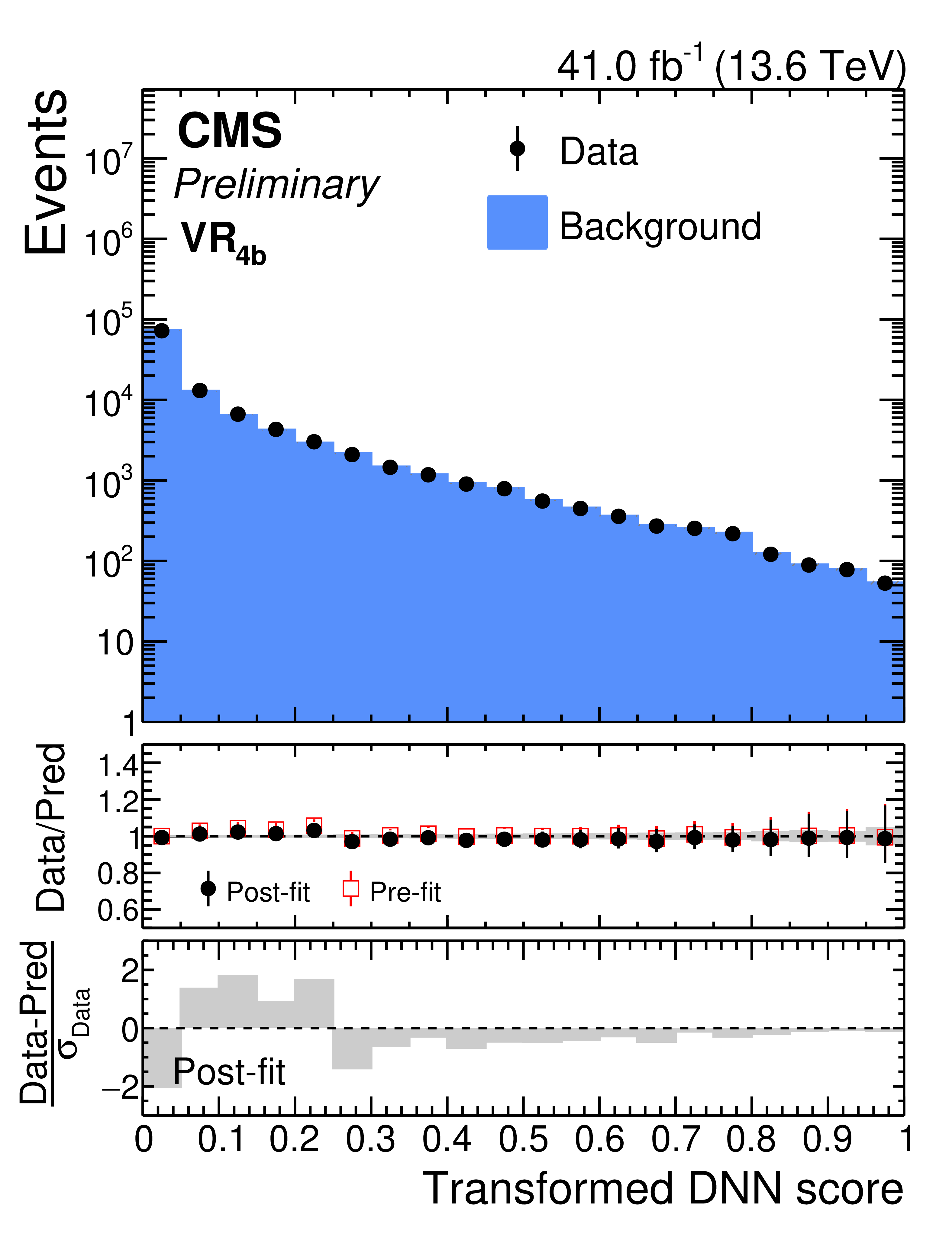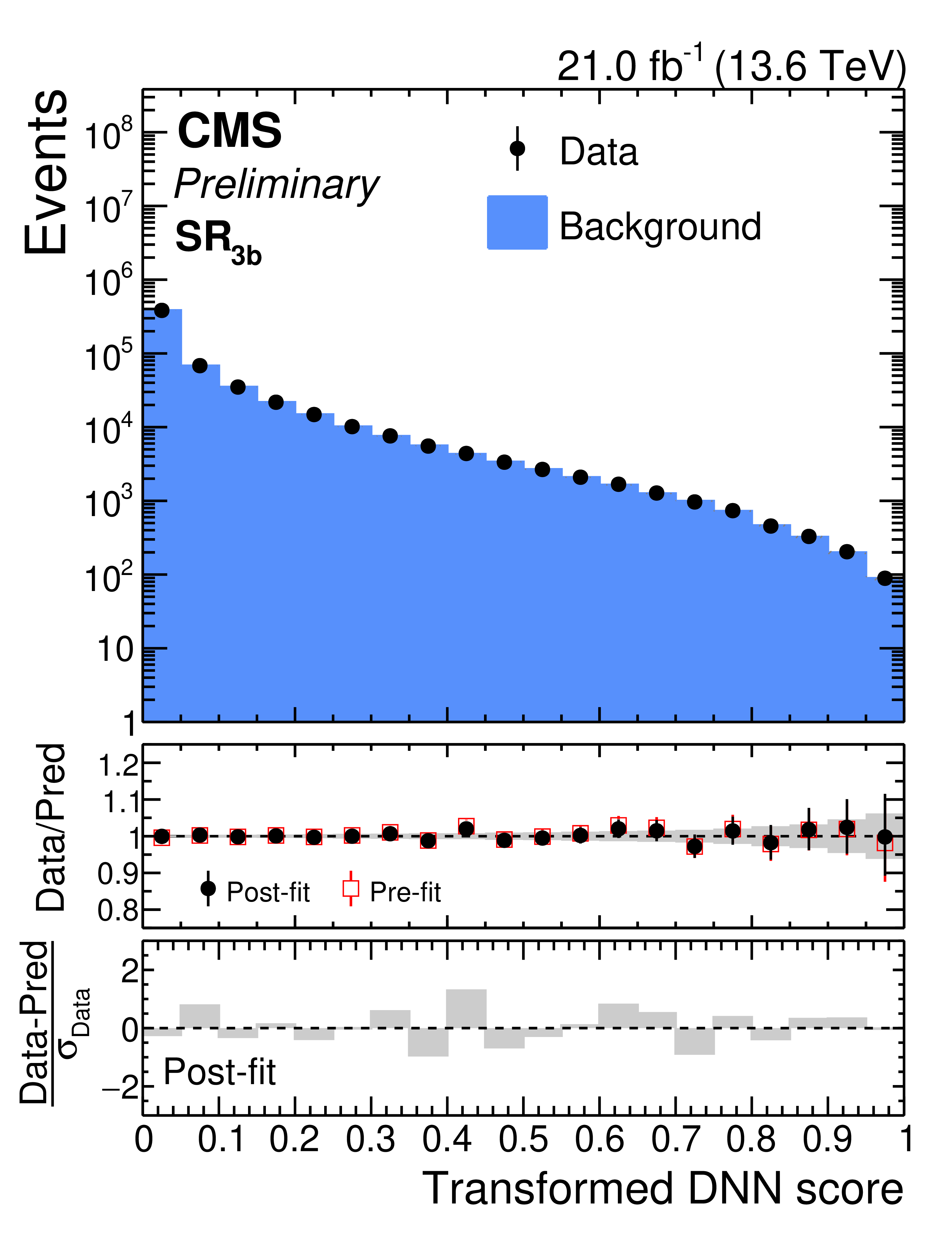 Distribution of the SvsB classifier score in the $ \mathrm{g}\mathrm{g}\mathrm{H}\mathrm{H} $ category for $ \mathrm{SR_{3\mathrm{b}}} $ data (black points) compared to the data-driven background prediction (blue histogram), for the pre-ParkingHH (left) and post-ParkingHH (right) data sets. The middle panel shows the ratio of data to the pre-fit (red open markers) and post b-only fit (black solid markers) background prediction, with the gray band indicating the background post-fit uncertainty. The lower panel show the distribution of the pulls, defined as the difference between the data and the post-fit background prediction, divided by the statistical uncertainty in the data. |
