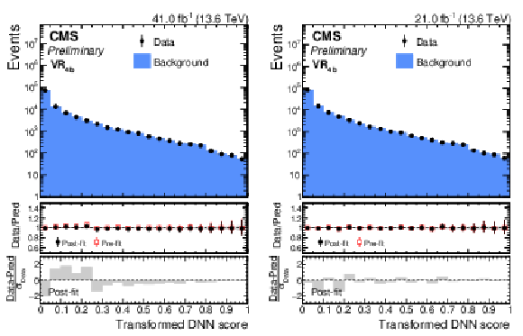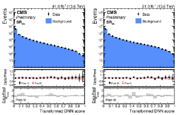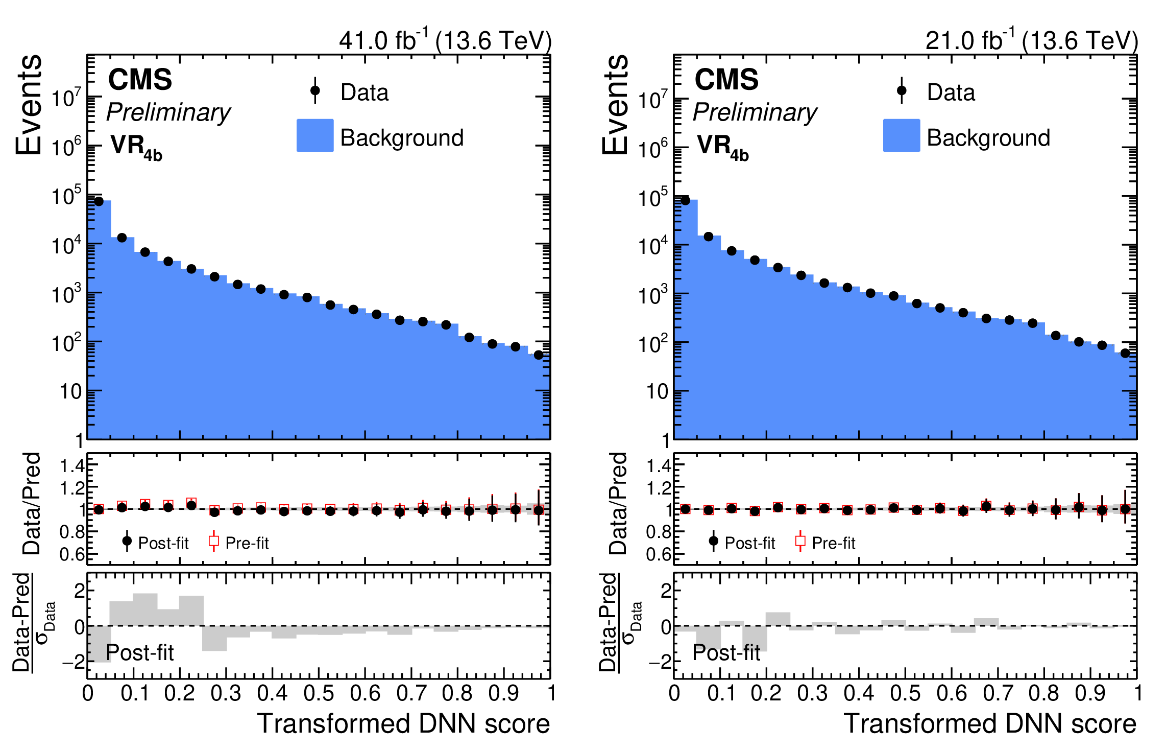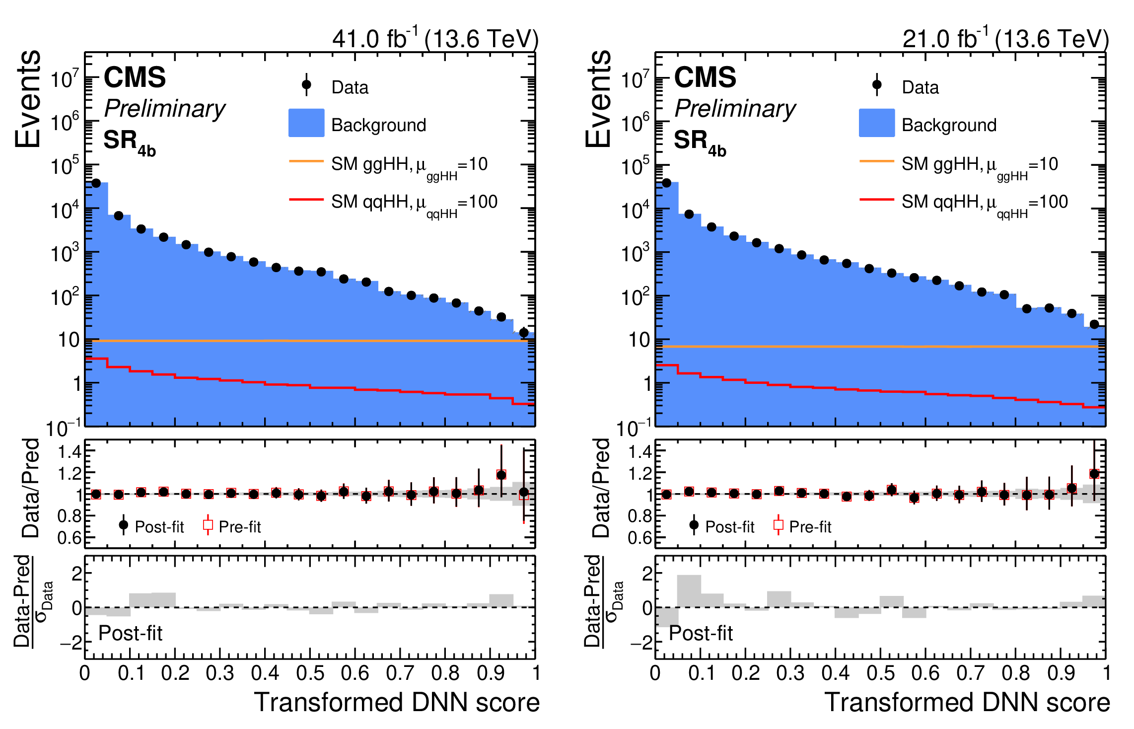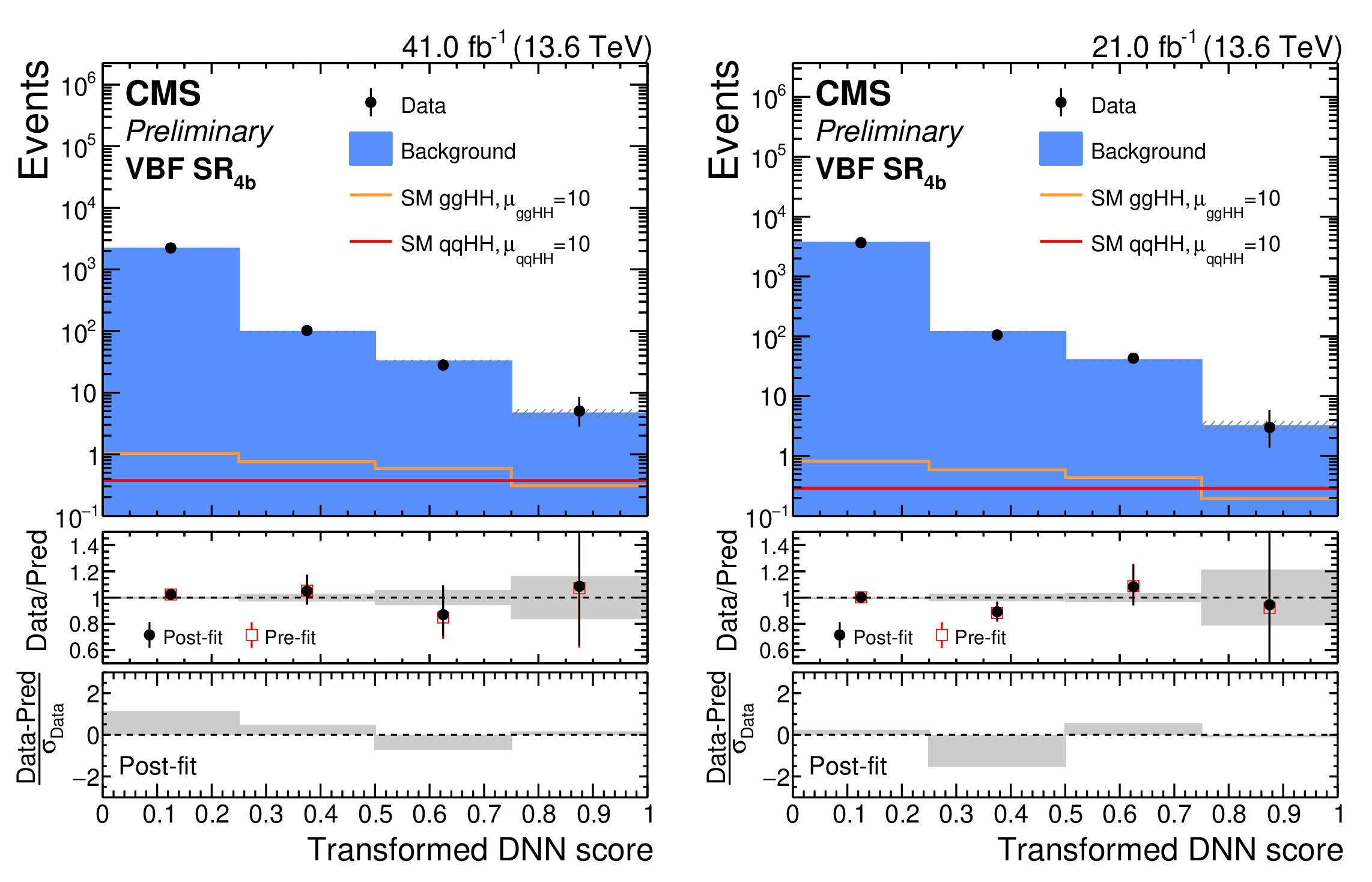 Post-fit distributions of the SvsB output score in the $ \mathrm{SR_{4\mathrm{b}}} $ of the $ \text{qq}\mathrm{H}\mathrm{H} $ resolved analysis reported for data (black points) and the predicted background (blue filled histograms) for pre-ParkingHH (left) and post-ParkingHH (right) data. The distributions of the SM $ \mathrm{g}\mathrm{g}\mathrm{H}\mathrm{H} $ (orange line) and $ \text{qq}\mathrm{H}\mathrm{H} $(red line) signals, scaled to improve their visibility, are overlaid. |