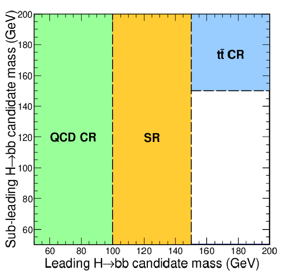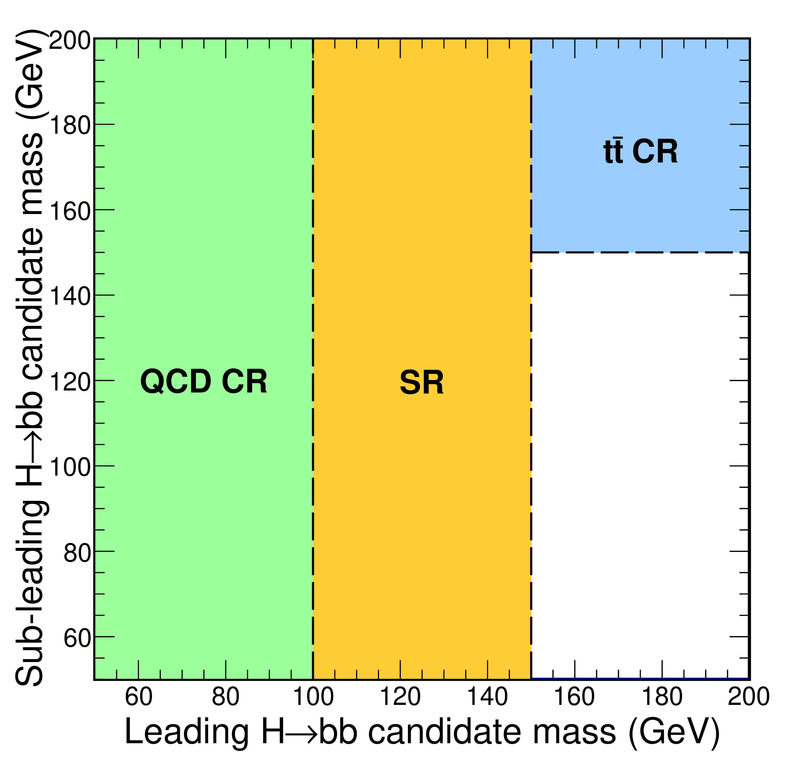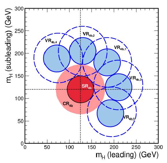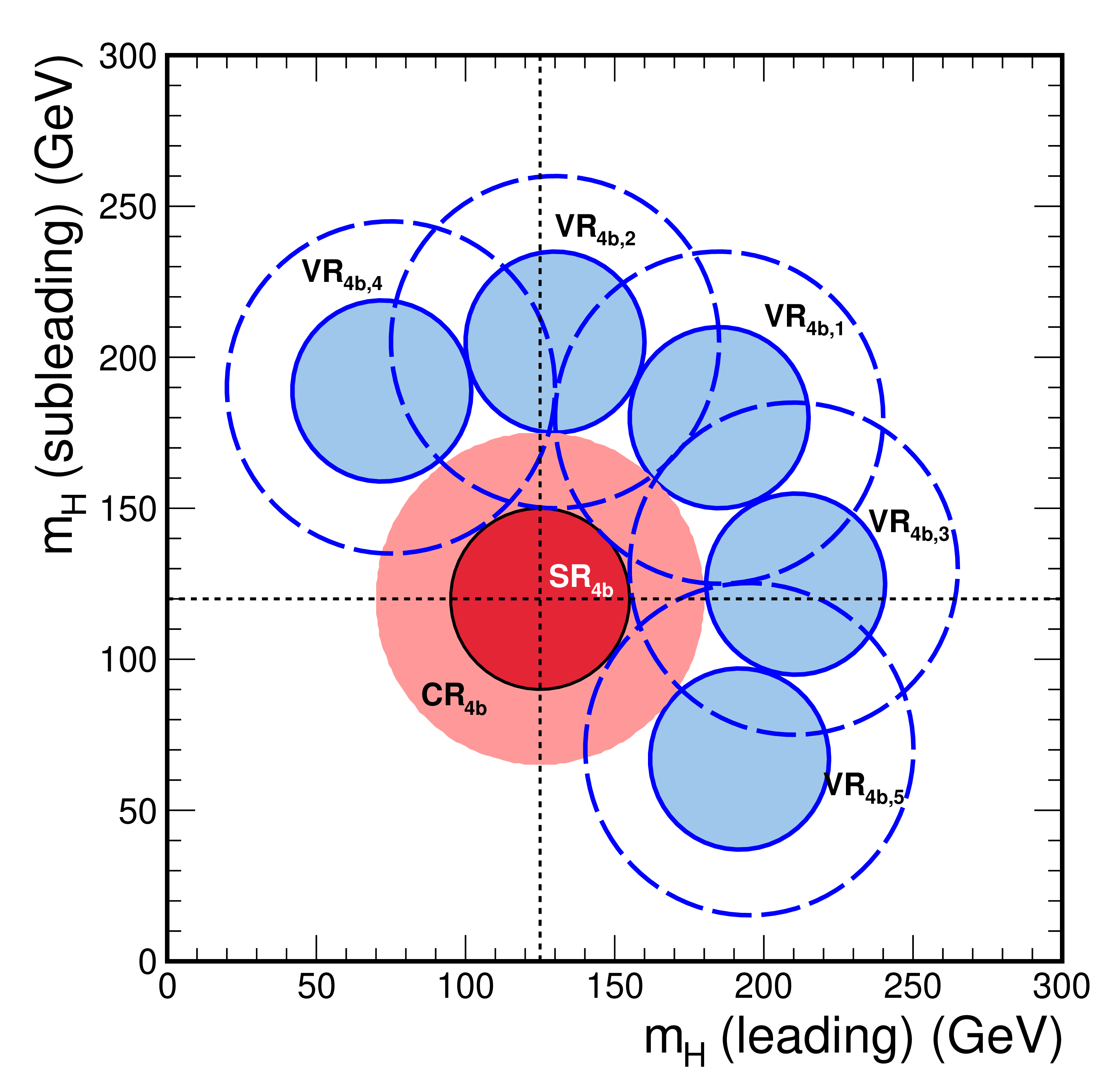 A schematic diagram of the 4b validation regions defined in the $ m_{\mathrm{H}_1} $--$ m_{\mathrm{H}_2} $ mass plane and orthogonal to the $ \mathrm{SR_{4\mathrm{b}}} $. In each validation region, the solid blue area identifies the signal region, while the dashed blue lines indicate the corresponding control region. The ``leading'' H candidate is the one with largest $ p_{\mathrm{T}} $(H). |