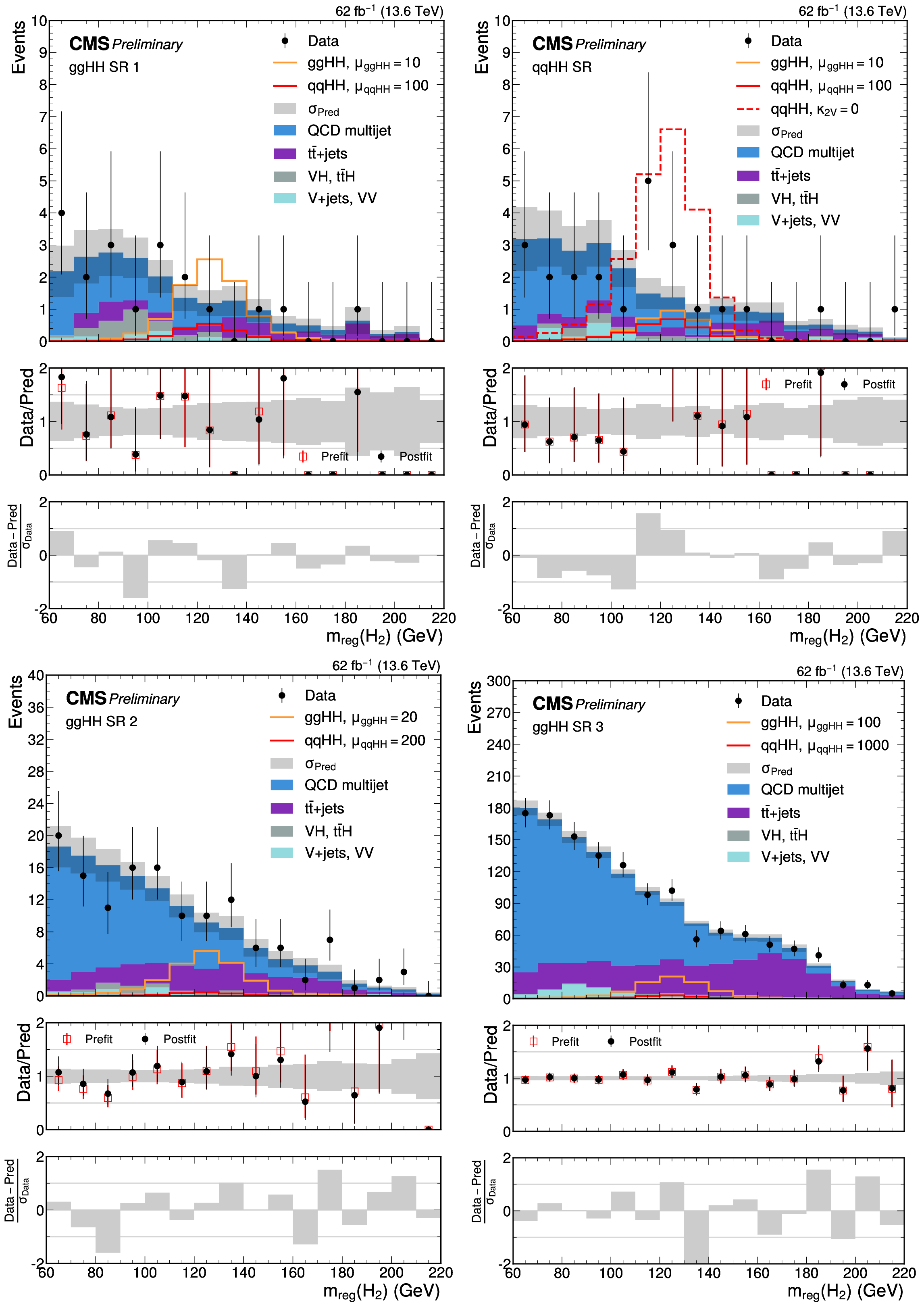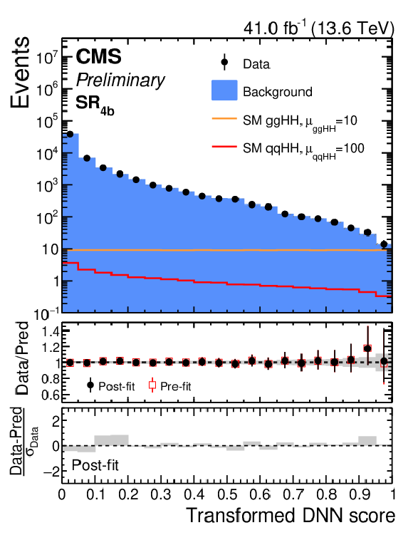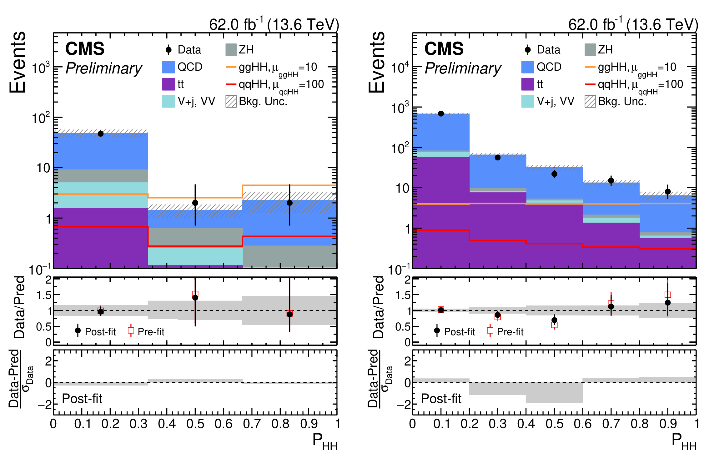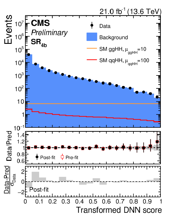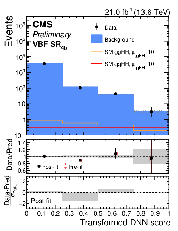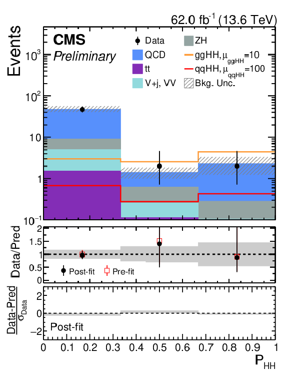 Pre-fit and post-fit distributions of the fitted observables for the $ \mathrm{g}\mathrm{g}\mathrm{H}\mathrm{H} $-inclusive HPSR (left) and LPSR (right) categories of the merged analysis following the DNN-fit method. Distributions are shown for data (black points) and the different background contributions from QCD multijet, $ \mathrm{t} \overline{\mathrm{t}} $, $ \mathrm{V}+\text{jets} $, dibosons, and ZH productions. The expected distributions for SM $ \mathrm{g}\mathrm{g}\mathrm{H}\mathrm{H} $ (orange) and $ \text{qq}\mathrm{H}\mathrm{H} $ (red) signals are overlaid and scaled by a multiplicative factor to improve their visibility. |
