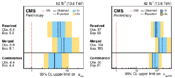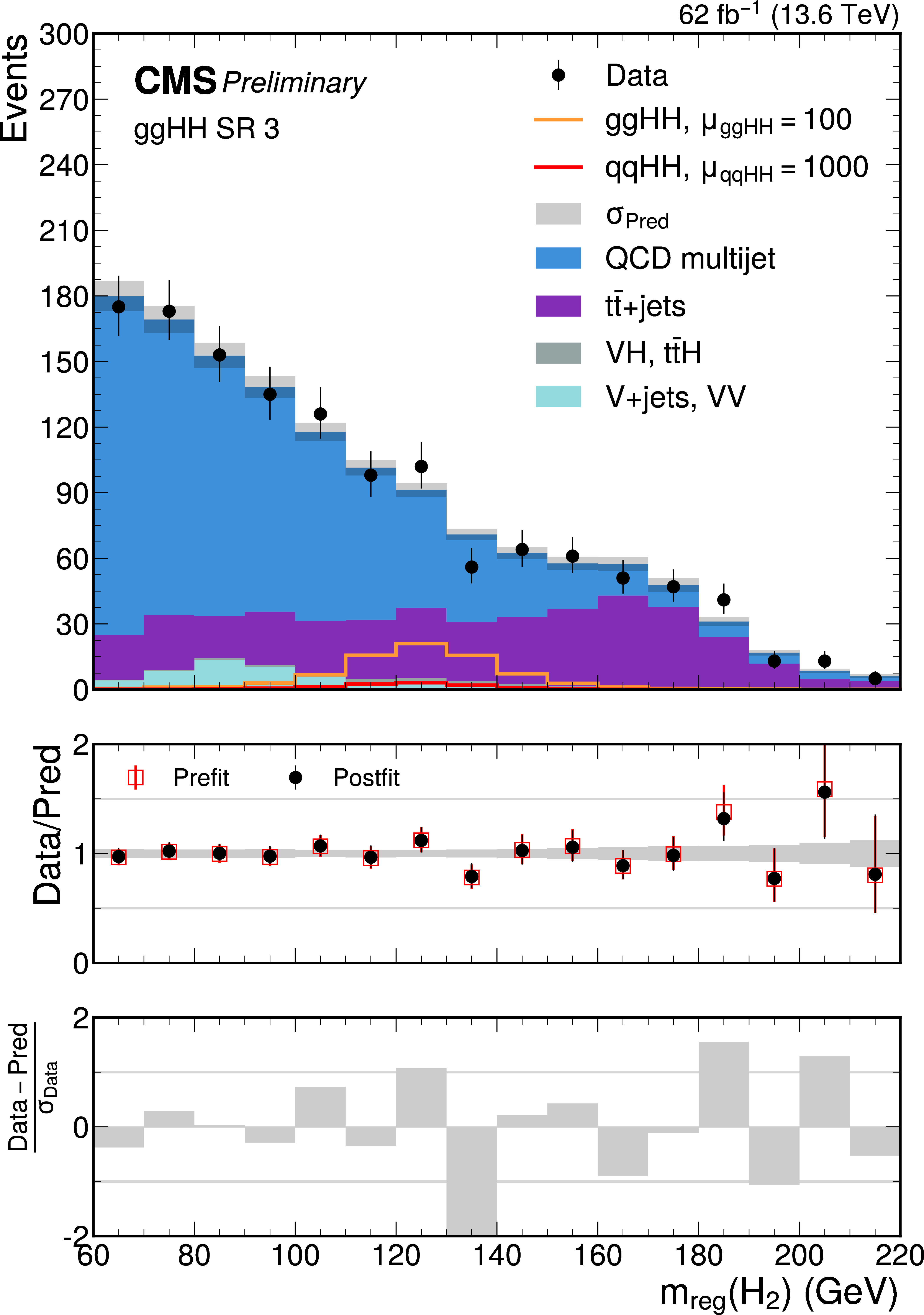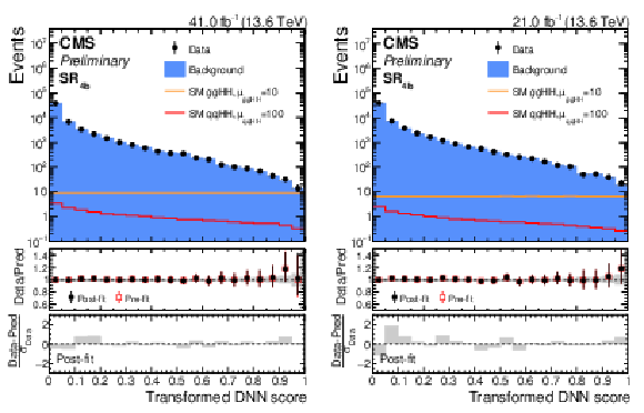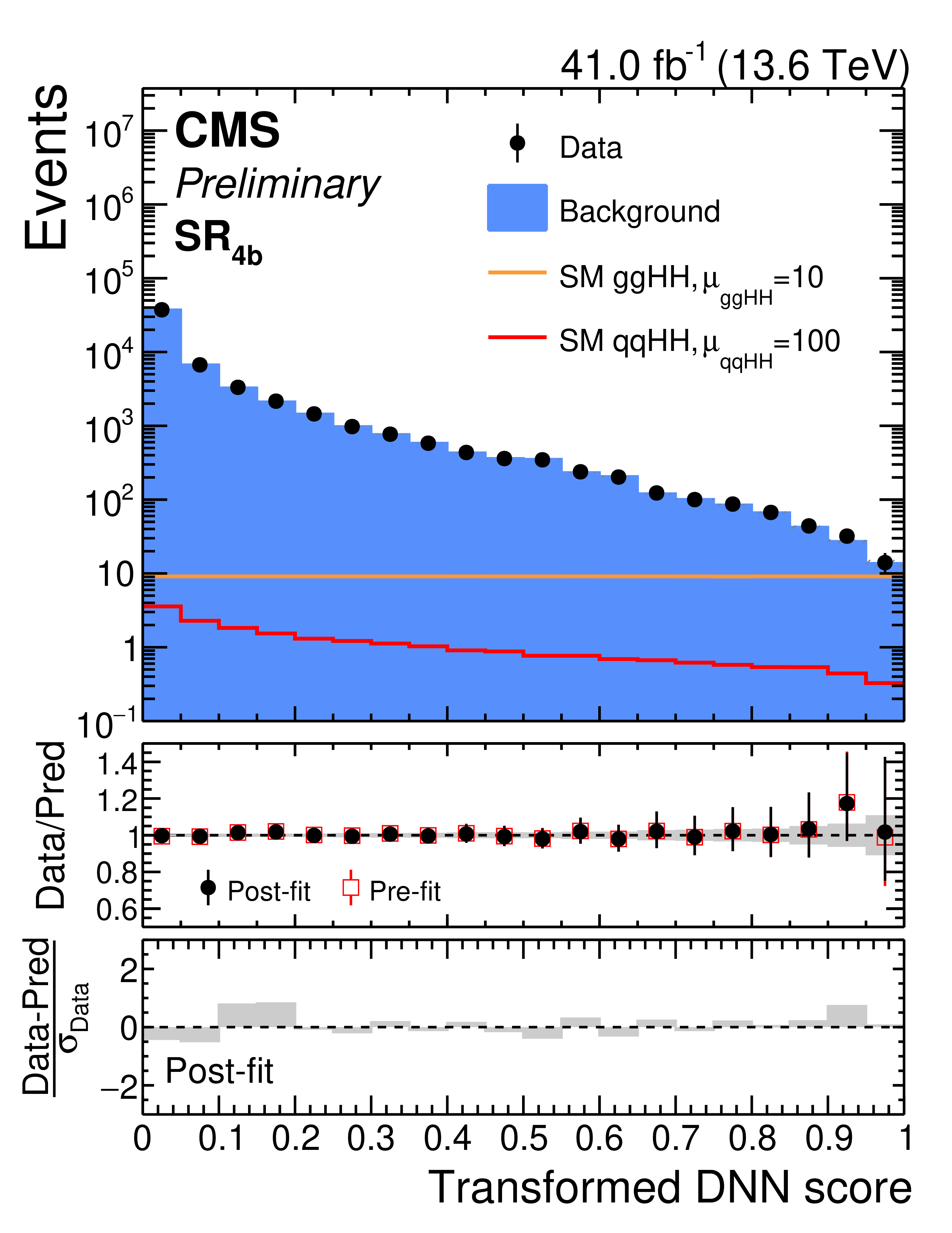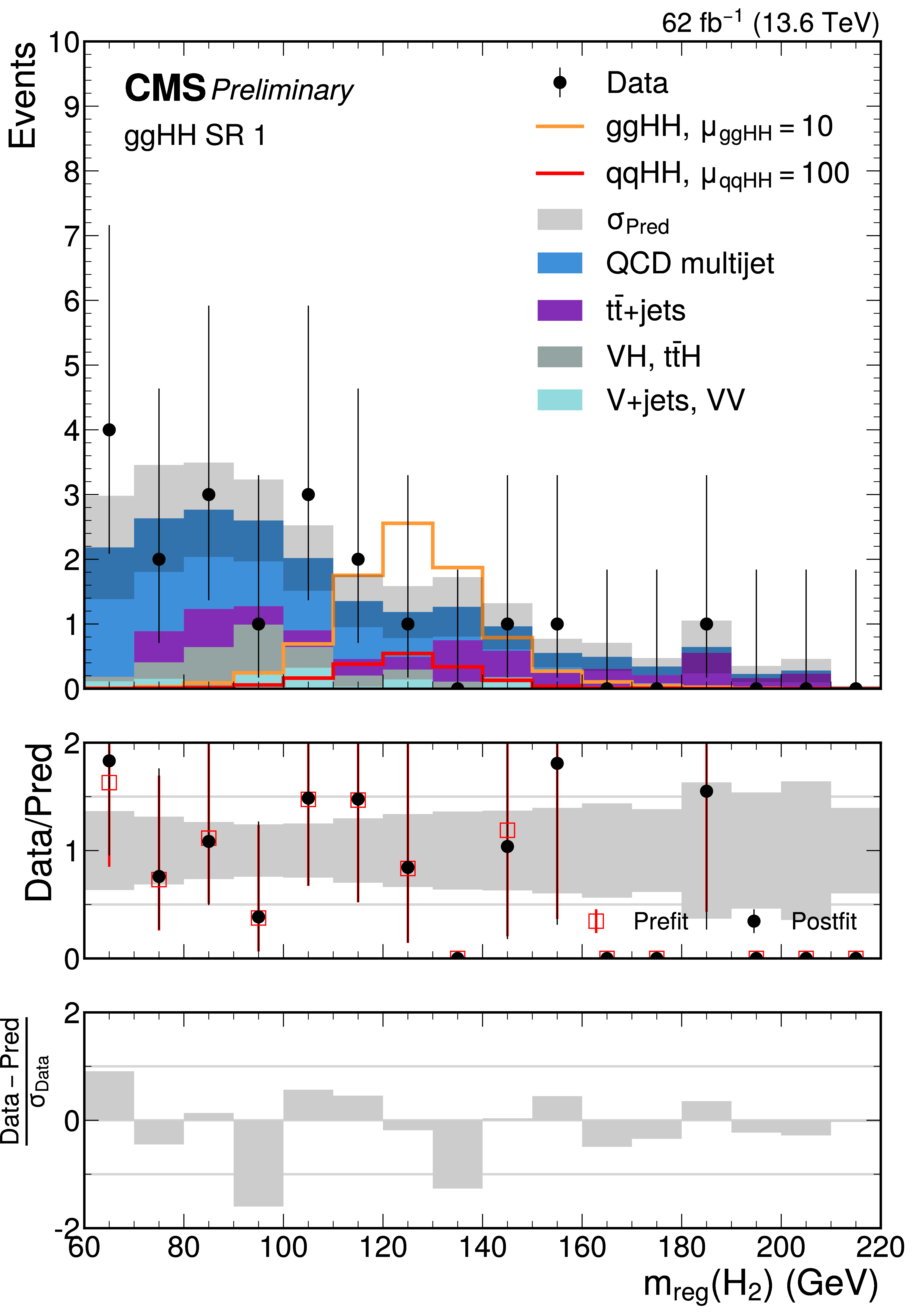 Pre-fit and post-fit distributions of the fitted observables for the $ \mathrm{g}\mathrm{g}\mathrm{H}\mathrm{H} $-inclusive HPSR (left) and LPSR (right) categories of the merged analysis following the DNN-fit method. Distributions are shown for data (black points) and the different background contributions from QCD multijet, $ \mathrm{t} \overline{\mathrm{t}} $, $ \mathrm{V}+\text{jets} $, dibosons, and ZH productions. The expected distributions for SM $ \mathrm{g}\mathrm{g}\mathrm{H}\mathrm{H} $ (orange) and $ \text{qq}\mathrm{H}\mathrm{H} $ (red) signals are overlaid and scaled by a multiplicative factor to improve their visibility. |