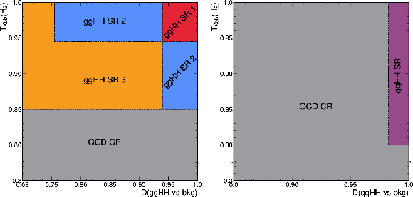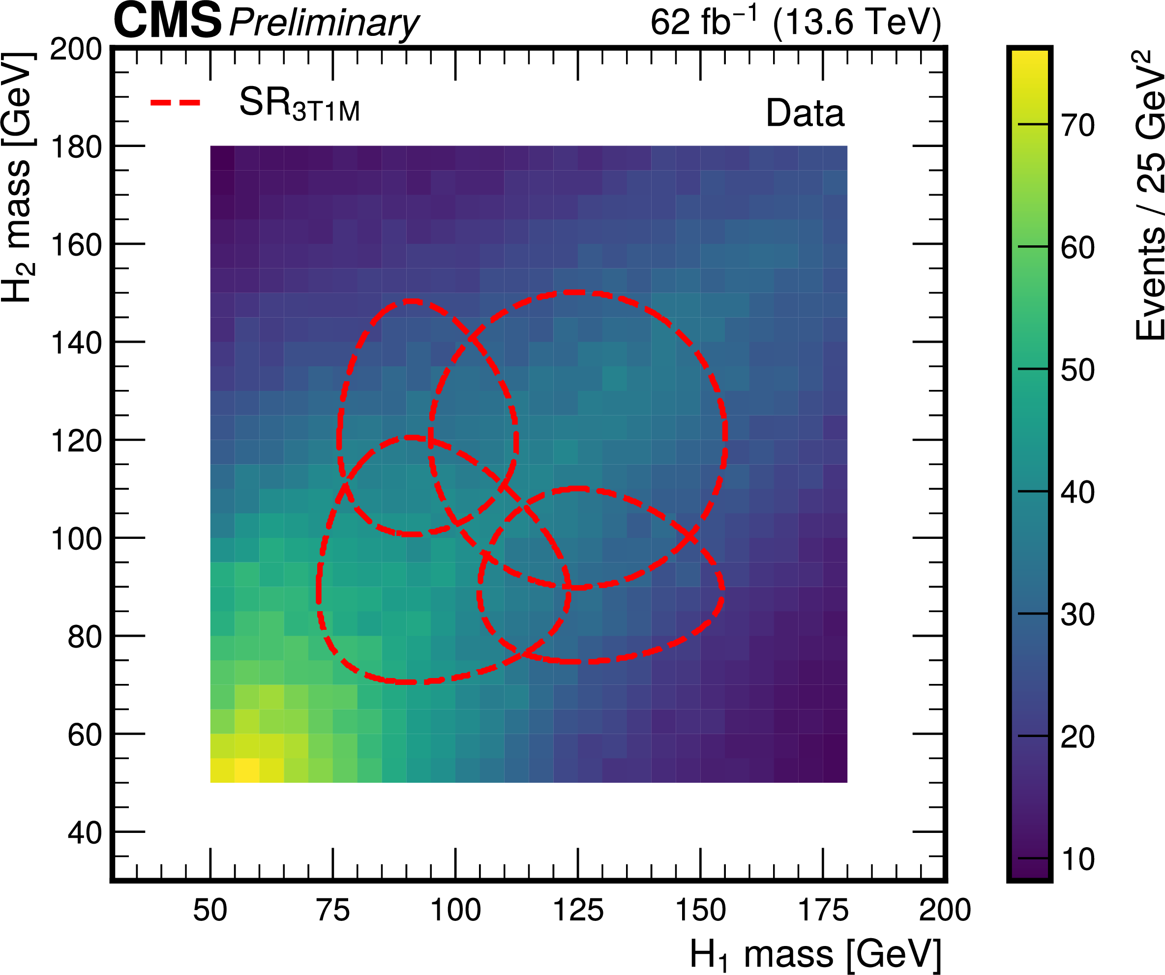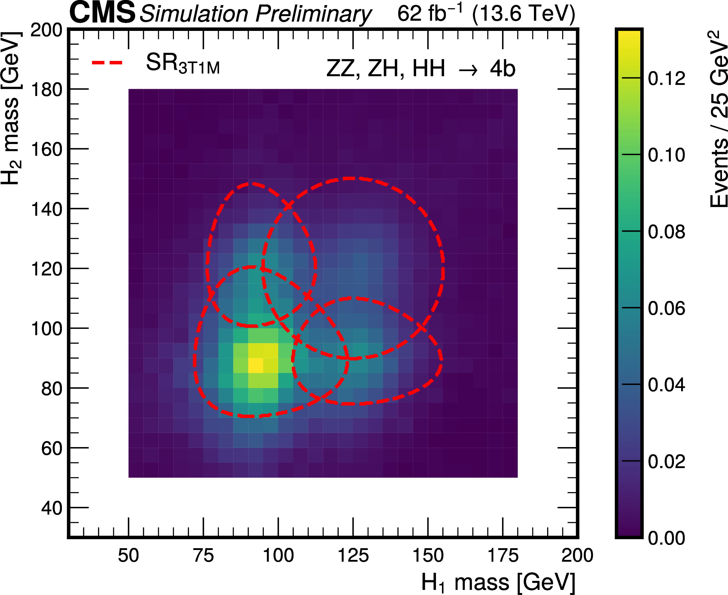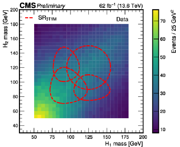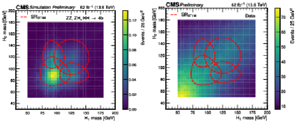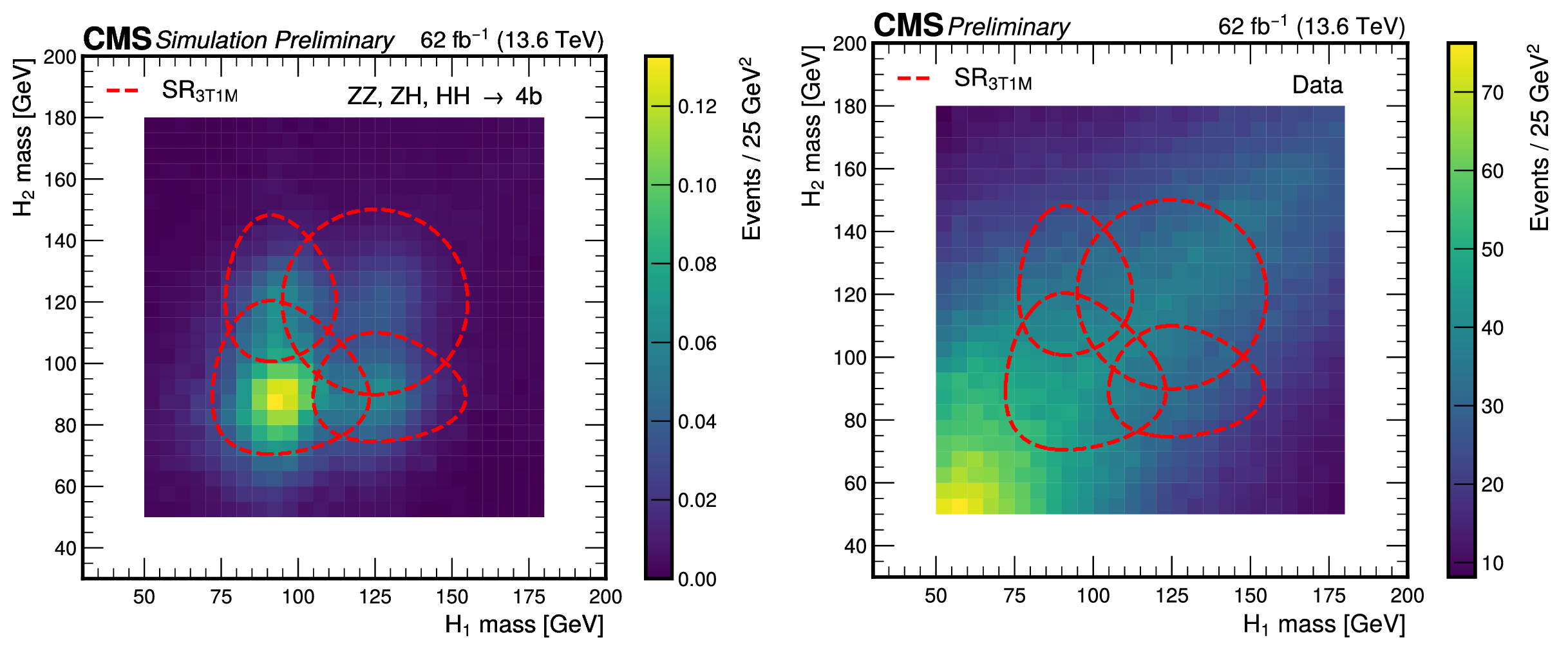 The expected HH, ZH, and ZZ signal yields as estimated from simulation (left) and the observed data (right) for the Run 3 dataset, in the 3T1M region, as a function of the reconstructed masses of the leading and subleading in $ p_{\mathrm{T}} \mathrm{H} $ candidates. The signal region is defined by the union of the regions enclosed by the dashed red lines. |