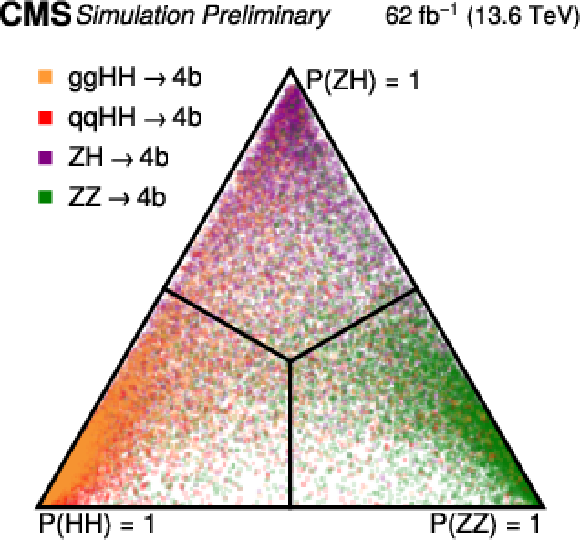 Distribution of the $ \mathrm{g}\mathrm{g}\mathrm{H}\mathrm{H} $, $ \mathrm{q}\mathrm{q}\mathrm{H}\mathrm{H} $, ZZ, and ZH signal processes, normalized to unity, as a function of the three FEYNNET probability scores. |