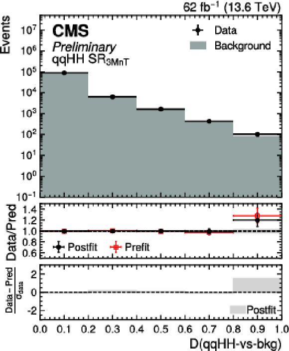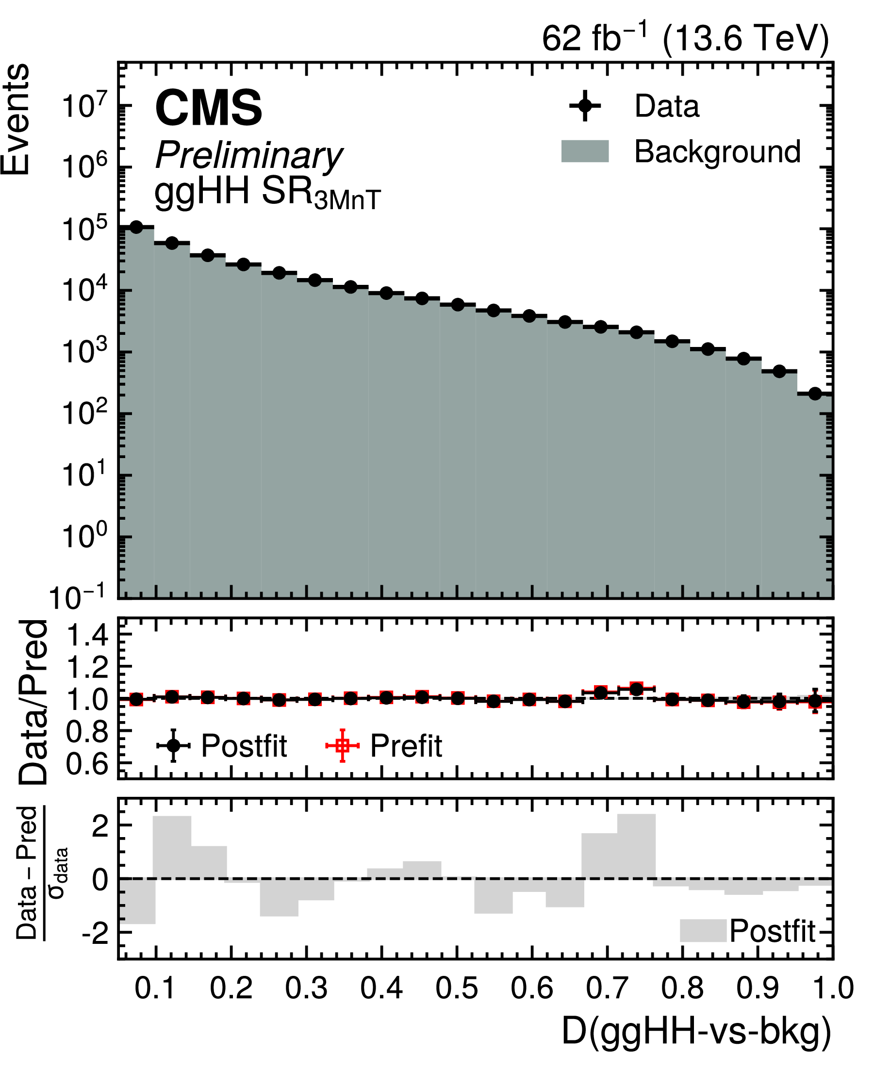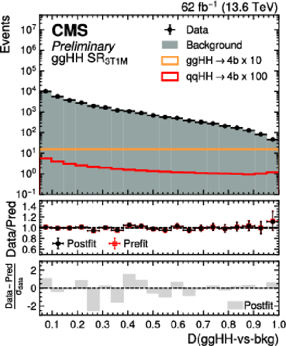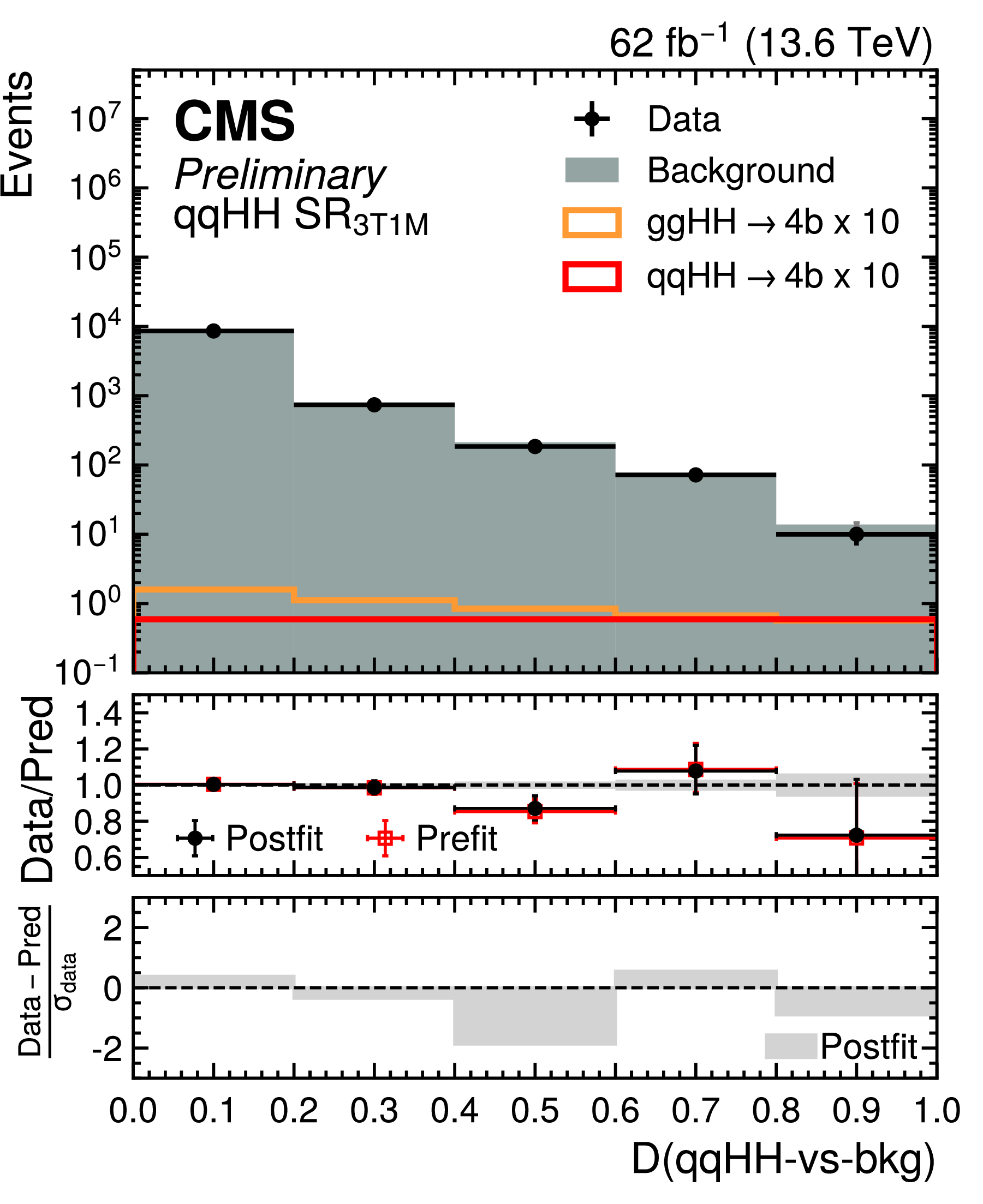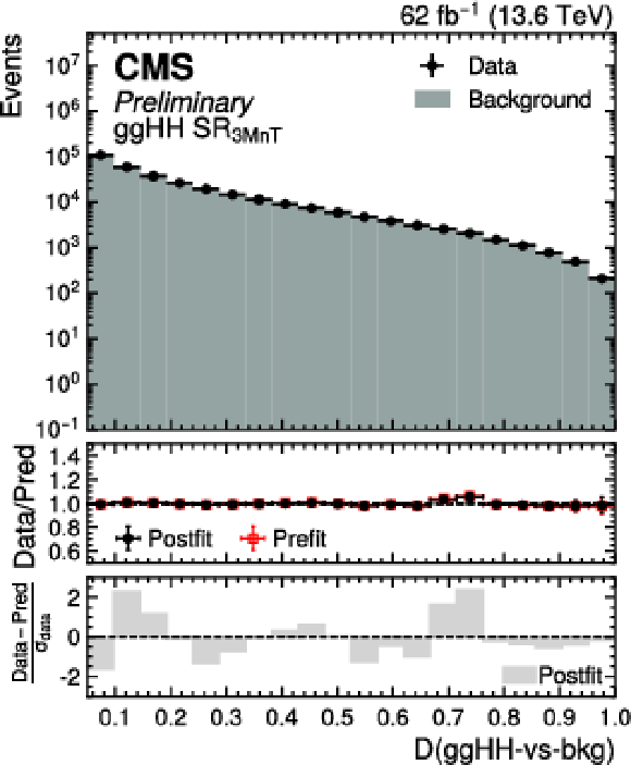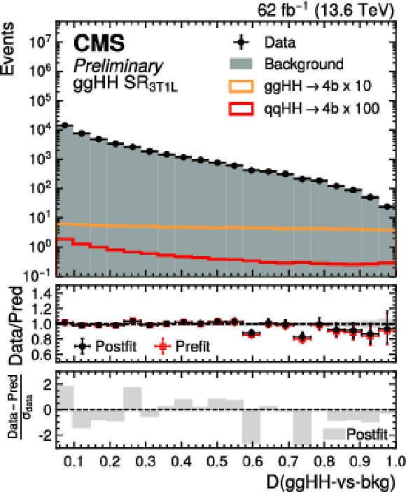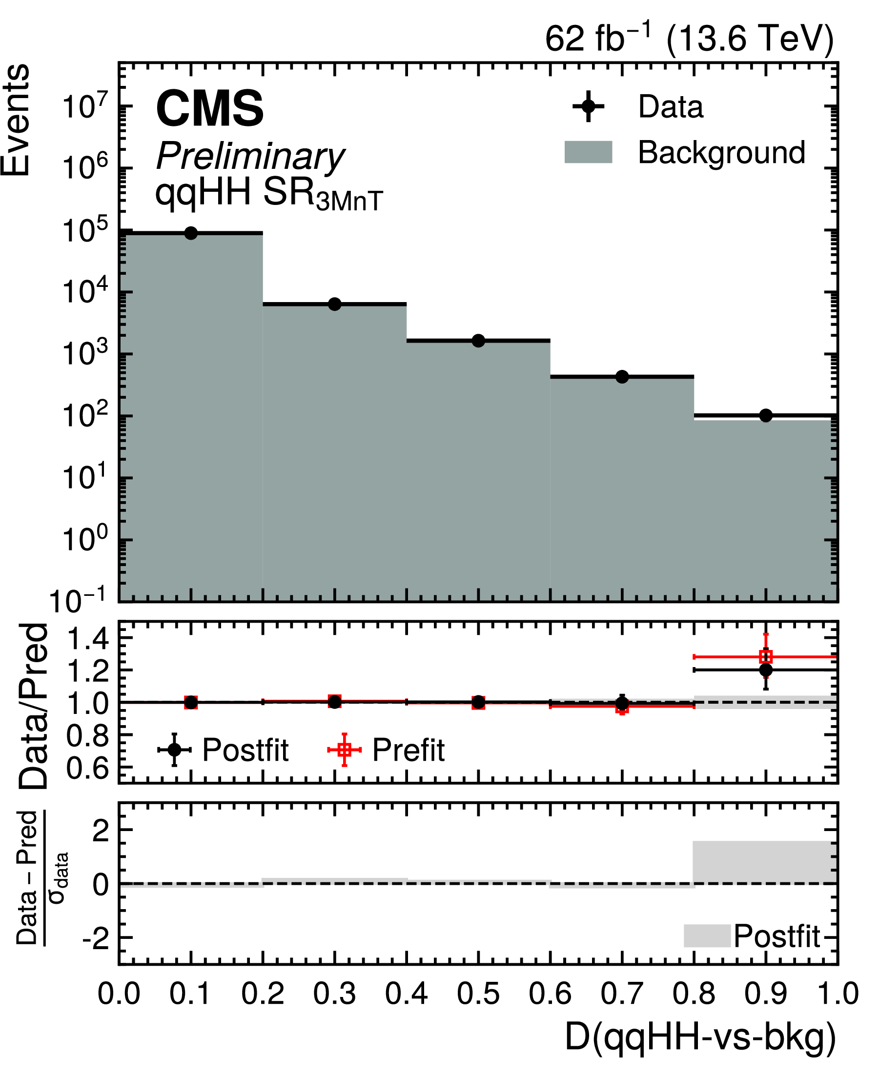 Postfit distributions of the transformed $ D $ ($\mathrm{g}\mathrm{g}\mathrm{H}\mathrm{H}$-vs-bkg) score in the $ \mathrm{g}\mathrm{g}\mathrm{H}\mathrm{H} \text{SR}_{\text{3T1M}} $ (left) and $ \mathrm{g}\mathrm{g}\mathrm{H}\mathrm{H} \text{SR}_{\text{3T1L}} $ (middle) categories, and $ D $ ($\mathrm{q}\mathrm{q}\mathrm{H}\mathrm{H}$-vs-bkg) score in the $ \mathrm{q}\mathrm{q}\mathrm{H}\mathrm{H} \text{SR}_{\text{3T1M}} $ (right) category for data (black points) and the predicted background (cyan filled histograms) for the Run 3 dataset. The distributions of the SM $ \mathrm{q}\mathrm{q}\mathrm{H}\mathrm{H} $ (orange line) and $ \mathrm{q}\mathrm{q}\mathrm{H}\mathrm{H} $ (red line) signal processes, scaled to improve their visibility, are also overlaid. |