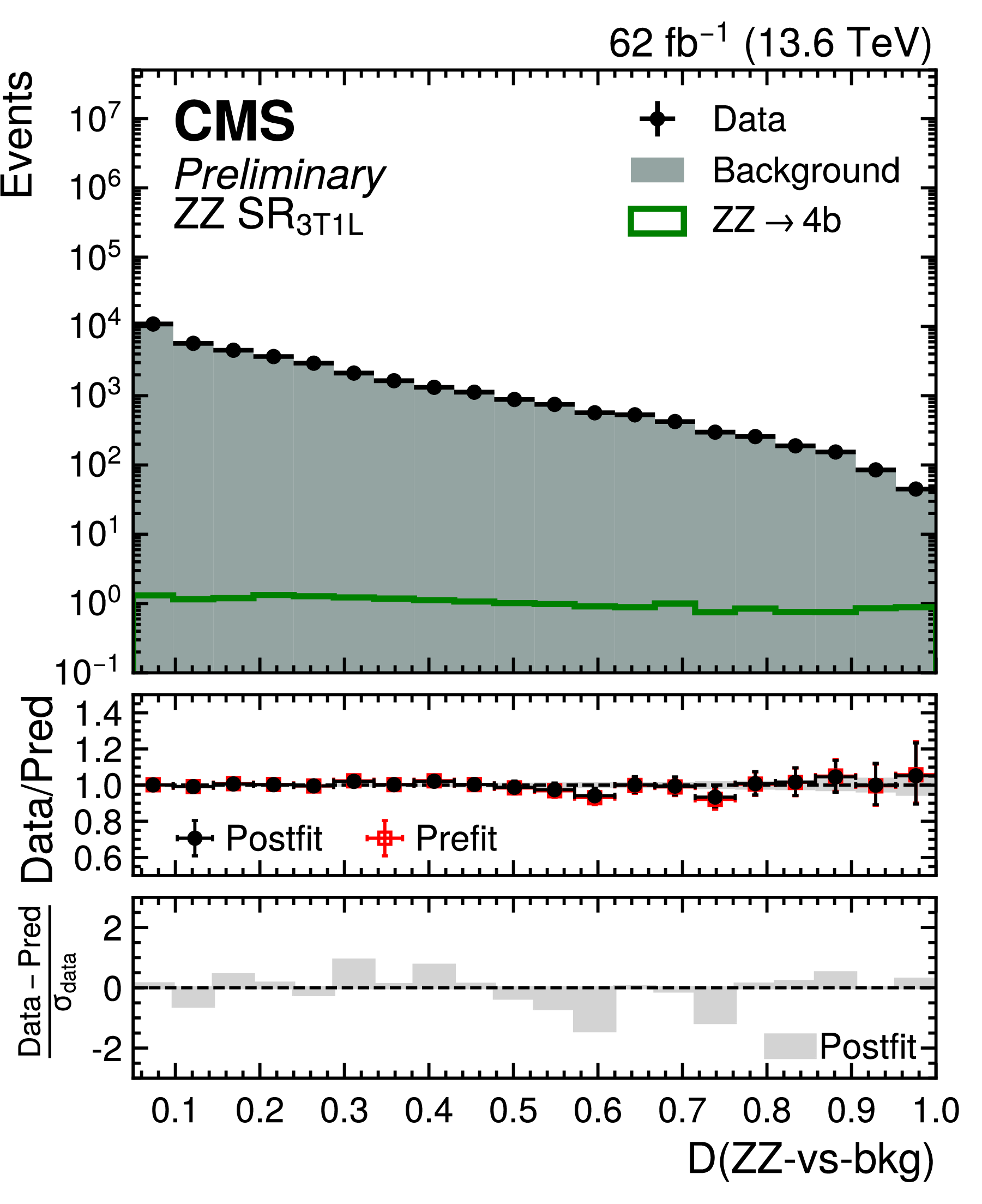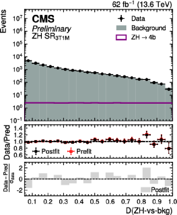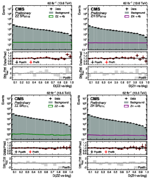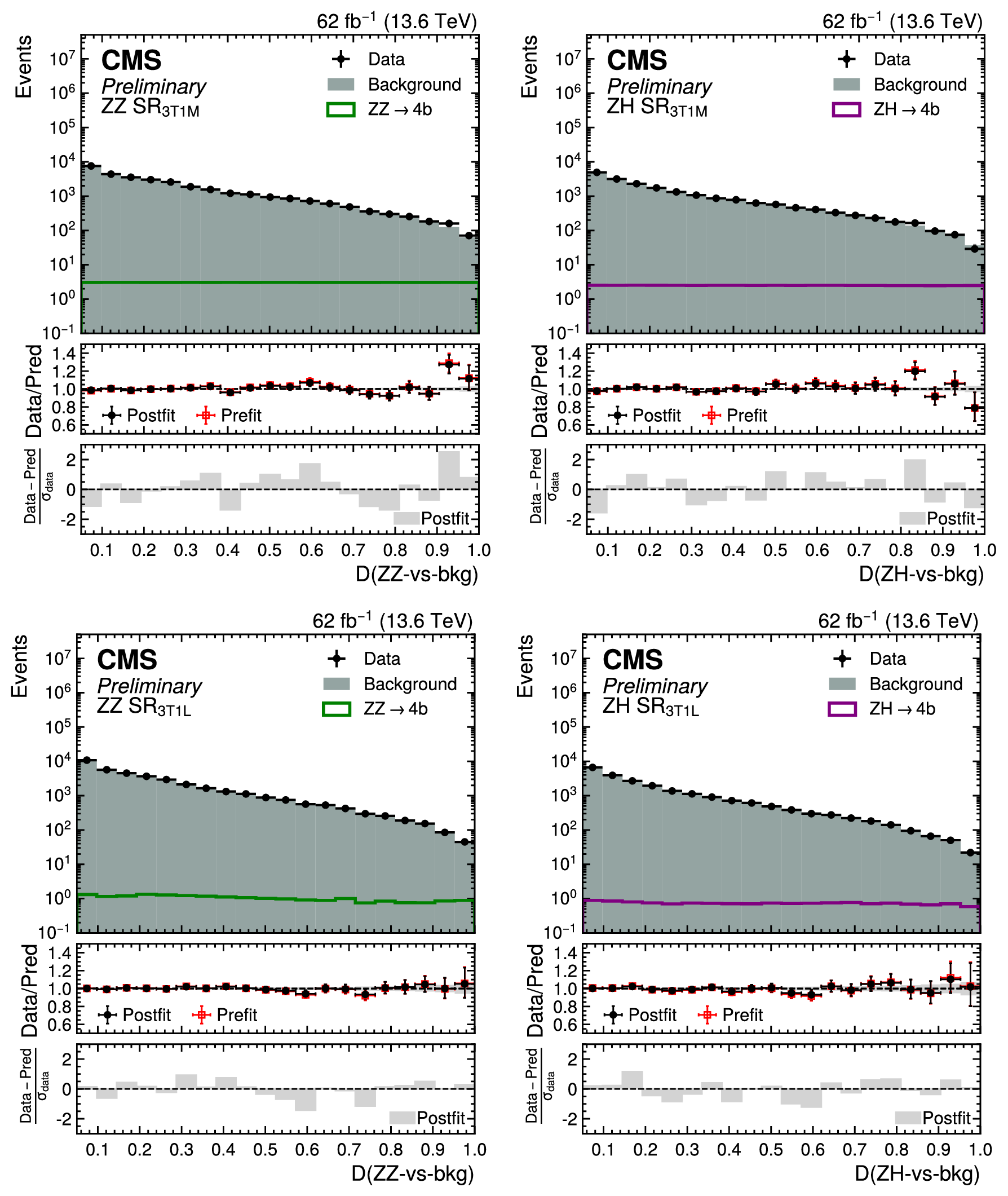 Postfit distribution of the transformed $ D $ ($\mathrm{Z}\mathrm{Z}$-vs-bkg) score in the $ \mathrm{Z}\mathrm{Z} \text{SR}_{\text{3T1M}} $ (upper left) and $ \mathrm{Z}\mathrm{Z} \text{SR}_{\text{3T1L}} $ (upper right) categories, and $ D $ ($\mathrm{Z}\mathrm{H}$-vs-bkg) score in the $ \mathrm{Z}\mathrm{H} \text{SR}_{\text{3T1M}} $ (lower left) and $ \mathrm{Z}\mathrm{H} \text{SR}_{\text{3T1L}} $ (lower right) SR for data (black points) and the predicted background (cyan filled histograms) for the Run 3 dataset. The distributions of the SM ZZ (green line) and ZH (purple line) processes are also overlaid. |