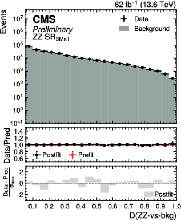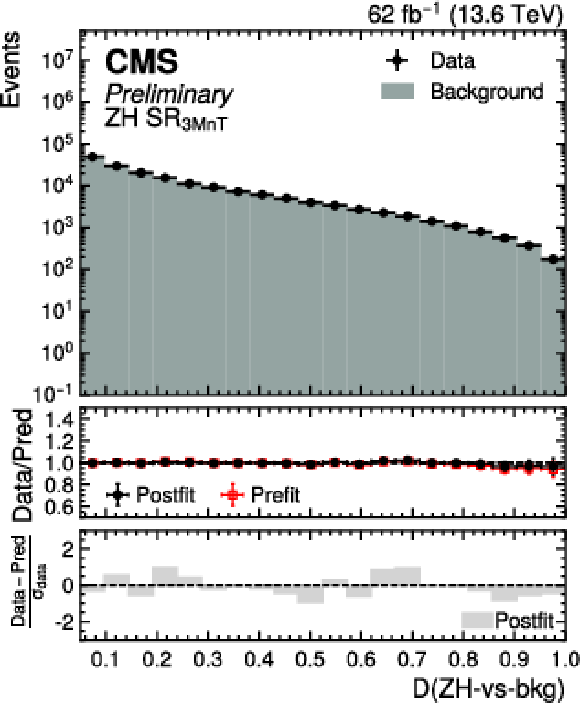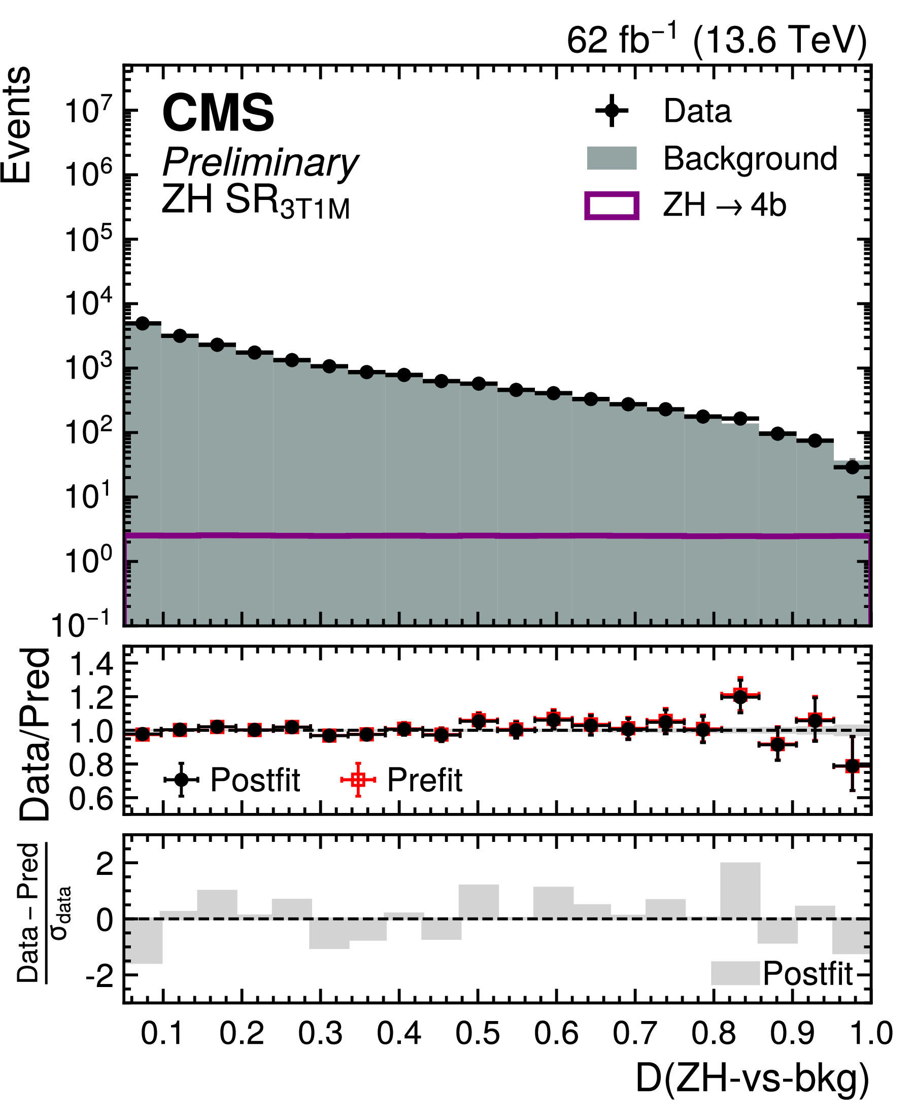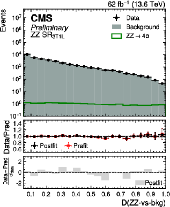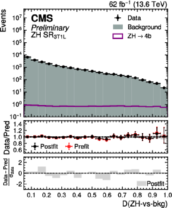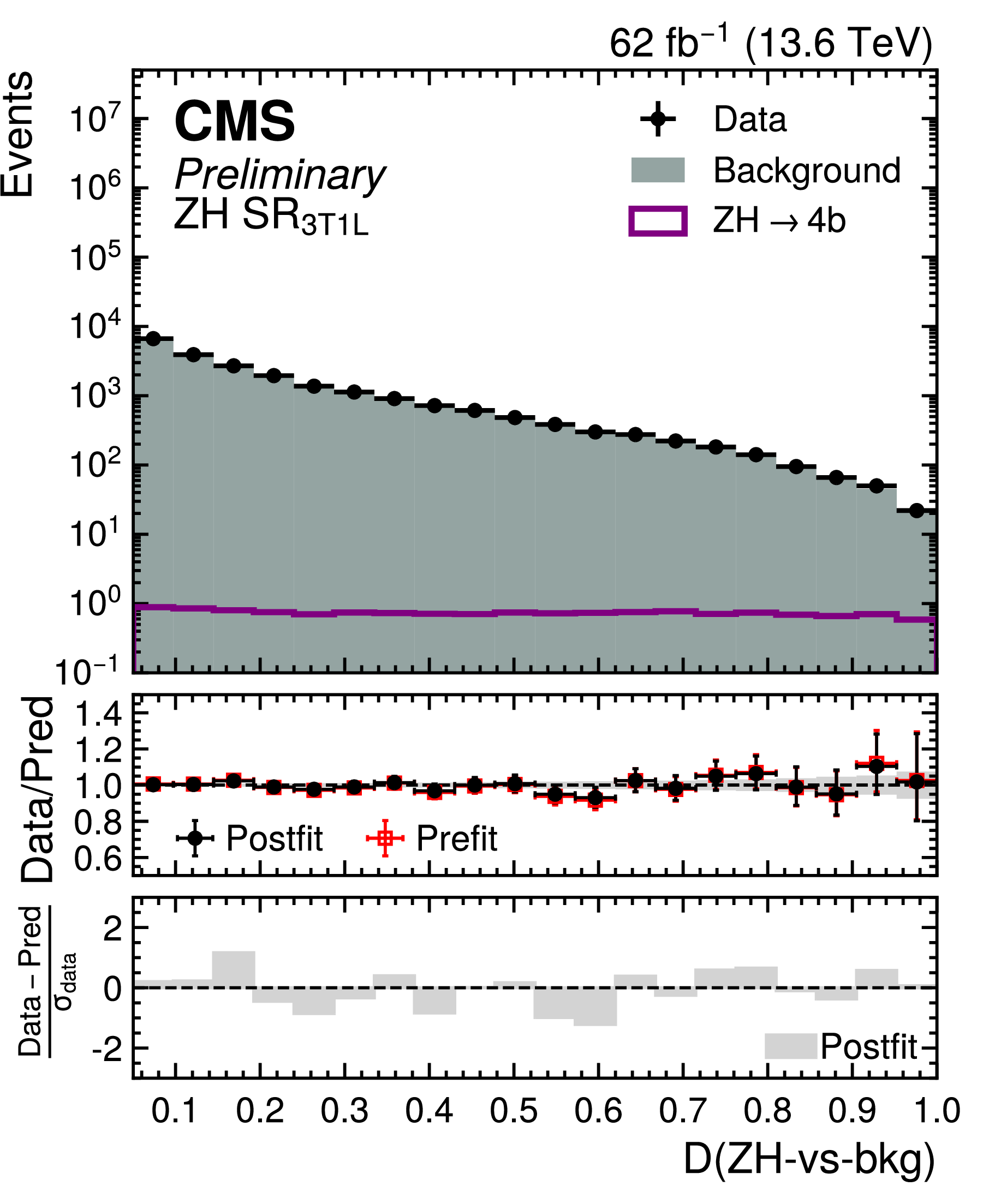 Postfit distribution of the transformed $ D $ ($\mathrm{Z}\mathrm{Z}$-vs-bkg) score in the $ \mathrm{Z}\mathrm{Z} \text{SR}_{\text{3T1M}} $ (upper left) and $ \mathrm{Z}\mathrm{Z} \text{SR}_{\text{3T1L}} $ (upper right) categories, and $ D $ ($\mathrm{Z}\mathrm{H}$-vs-bkg) score in the $ \mathrm{Z}\mathrm{H} \text{SR}_{\text{3T1M}} $ (lower left) and $ \mathrm{Z}\mathrm{H} \text{SR}_{\text{3T1L}} $ (lower right) SR for data (black points) and the predicted background (cyan filled histograms) for the Run 3 dataset. The distributions of the SM ZZ (green line) and ZH (purple line) processes are also overlaid. |