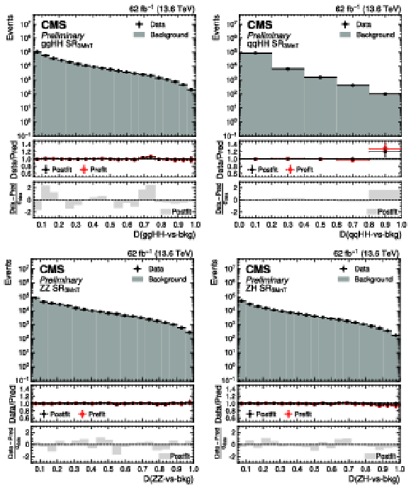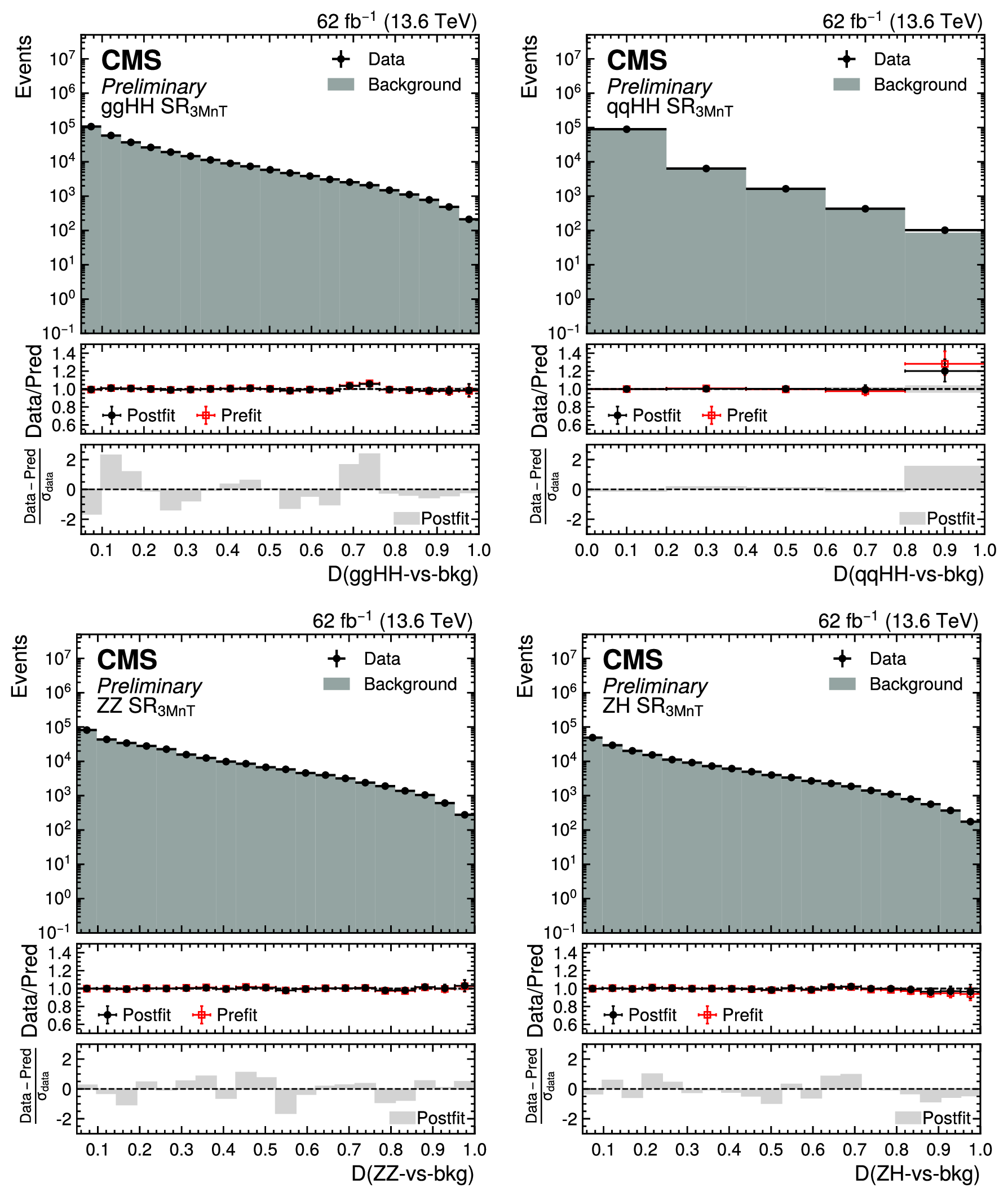 Postfit distribution of the $ D $ ($\mathrm{g}\mathrm{g}\mathrm{H}\mathrm{H}$-vs-bkg) (upper left), $ D $ ($\mathrm{q}\mathrm{q}\mathrm{H}\mathrm{H}$-vs-bkg) (upper right), $ D $ ($\mathrm{Z}\mathrm{Z}$-vs-bkg) (lower left), and $ D $ ($\mathrm{Z}\mathrm{H}$-vs-bkg) (lower right) scores in the validation region $ \text{SR}_{\text{3MnT}} $ for data (black points) and the predicted background (cyan filled histograms) with the Run 3 dataset. |