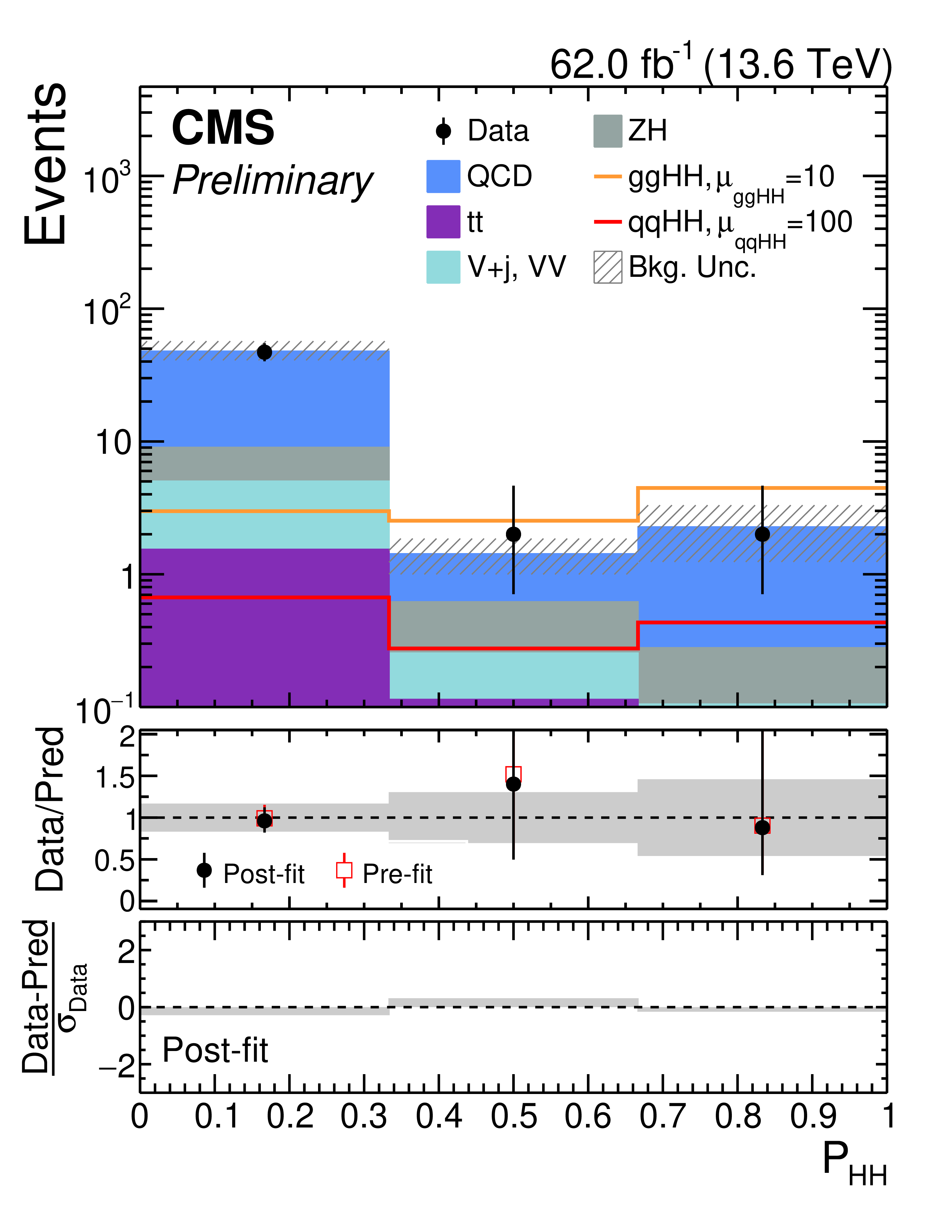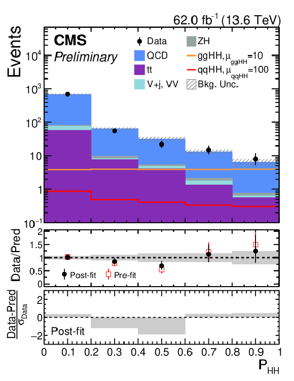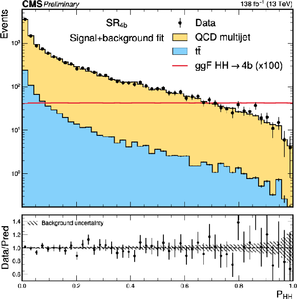 The fitted signal+background distribution of the signal probability, $ \mathcal{P_{\mathrm{H}\mathrm{H}}} $, in the $ \mathrm{H}\mathrm{H} \mathrm{SR_{4\mathrm{b}}} $. The black points show the 4b events from data. The yellow and blue regions show the predictions from the QCD multijet model and the $ \mathrm{t} \overline{\mathrm{t}} $ simulation, respectively. The prediction for the SM $ \mathrm{g}\mathrm{g}\mathrm{H}\mathrm{H} $ signal distribution is given by the red histogram, multiplied by 100. The lower panel shows the data-to-background ratio, with the hatched area representing the background uncertainty. |