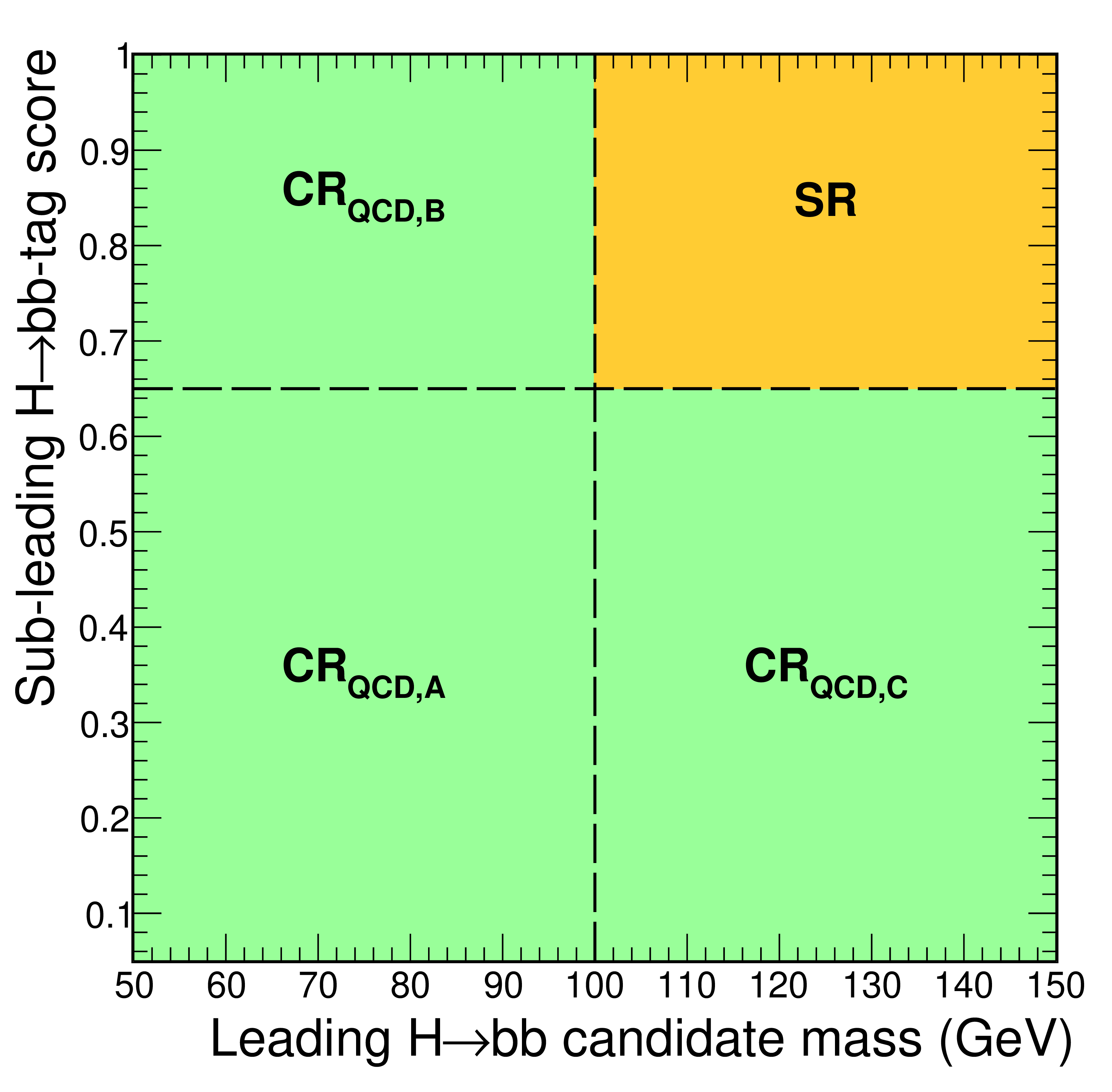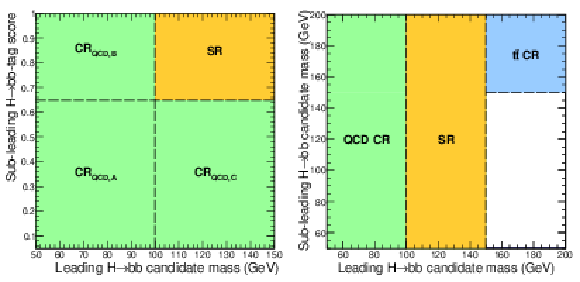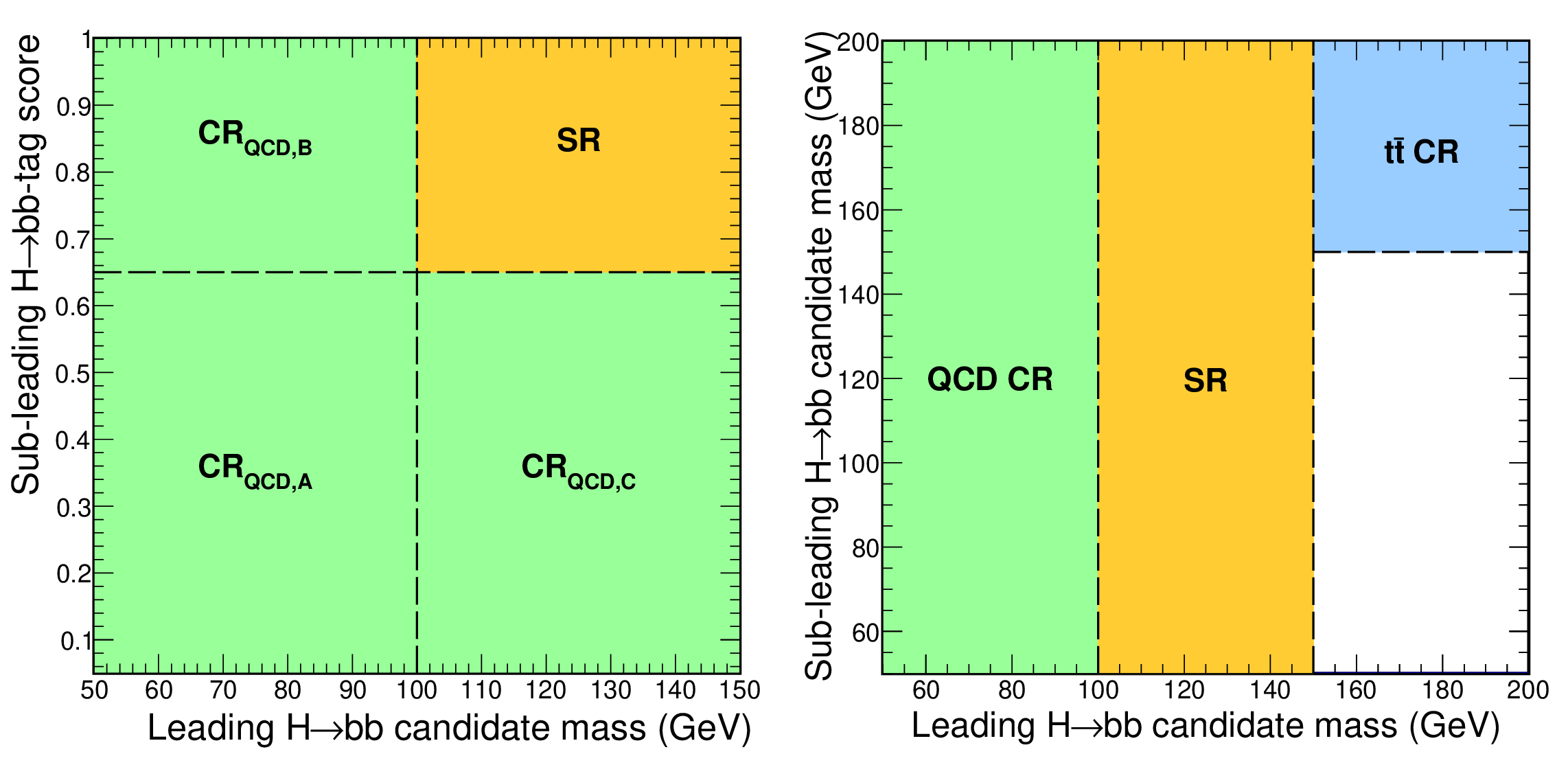 Left: schematic diagram showing the regions used for the data-driven background estimation strategy used in the merged channel. The purity in QCD multijet events is reported in each of the background-enriched regions ($ \mathrm{CR_{QCD,A}} $, $ \mathrm{CR_{QCD,B}} $, and $ \mathrm{CR_{QCD,C}} $). Right: schematic diagram of the signal (orange area) and control regions (QCD in green, $ \mathrm{t} \overline{\mathrm{t}} $ in azure) in the plane defined by the $ m_\text{reg}({\mathrm{H}_1}) $ and $ m_\text{reg}({\mathrm{H}_2}) $. |