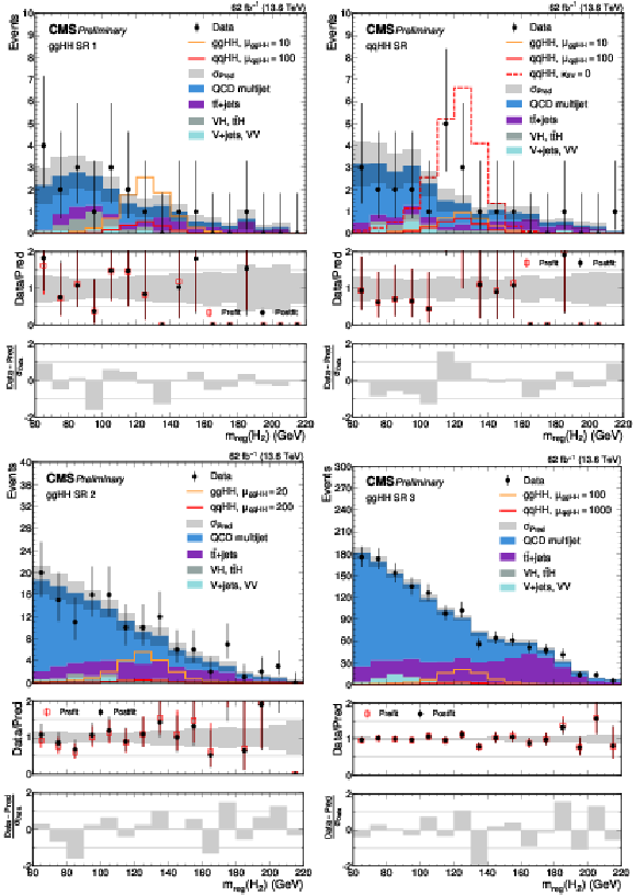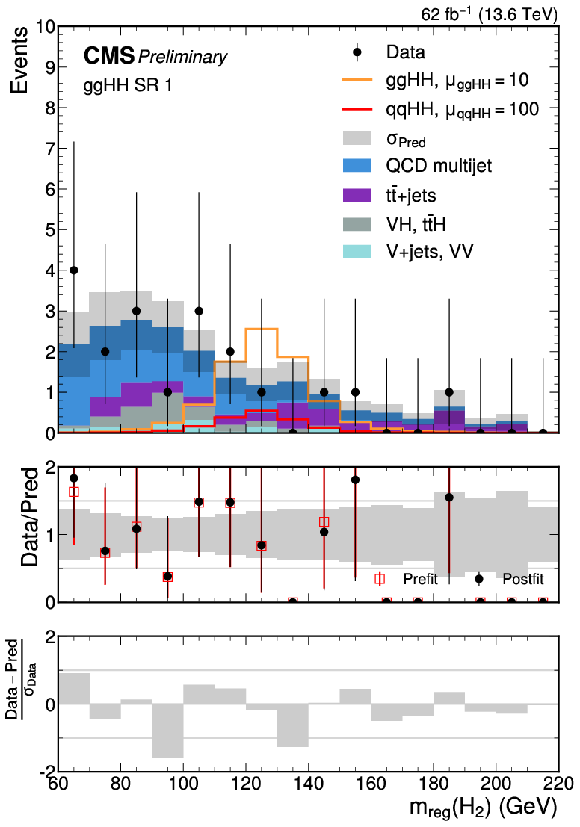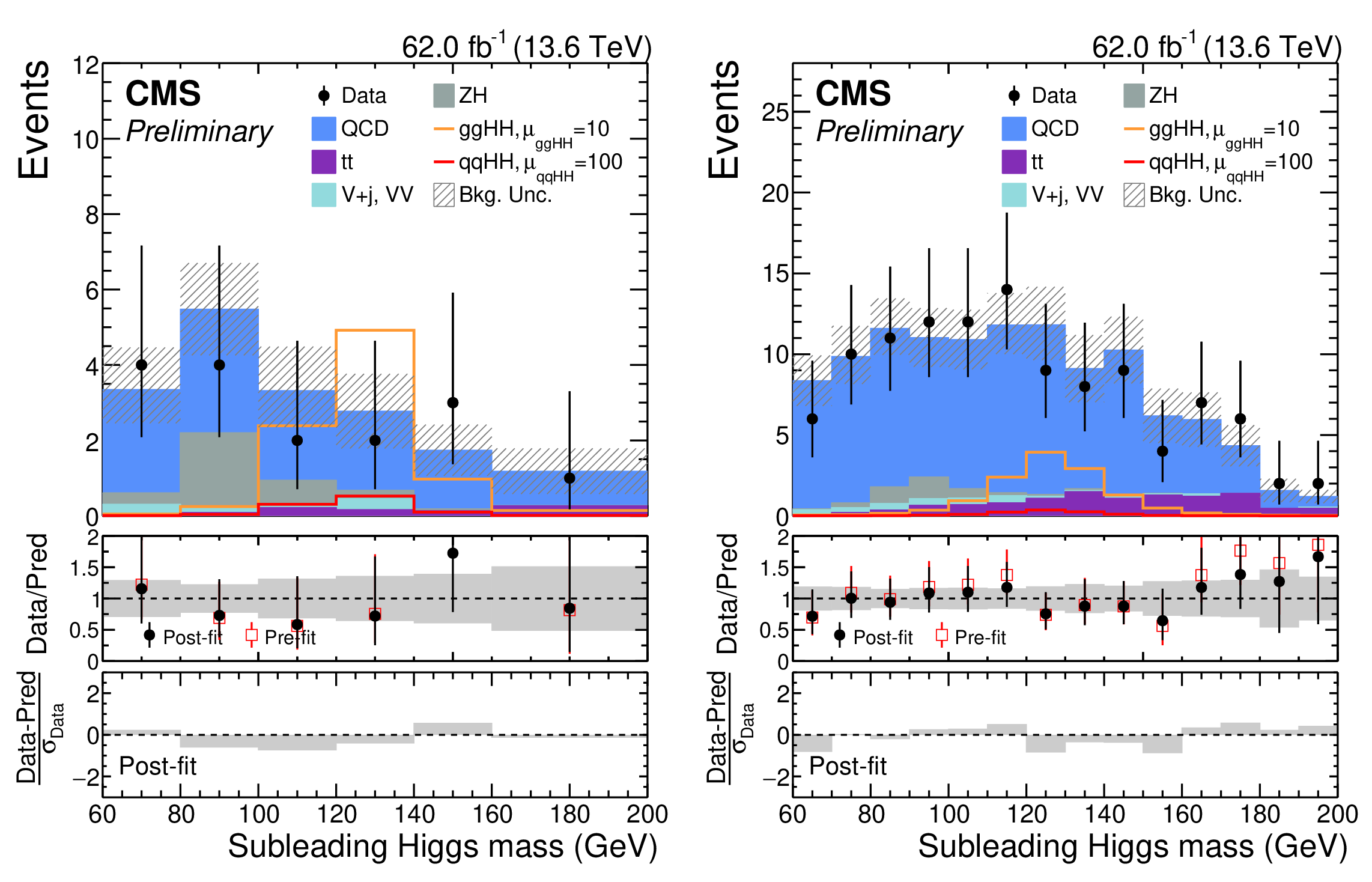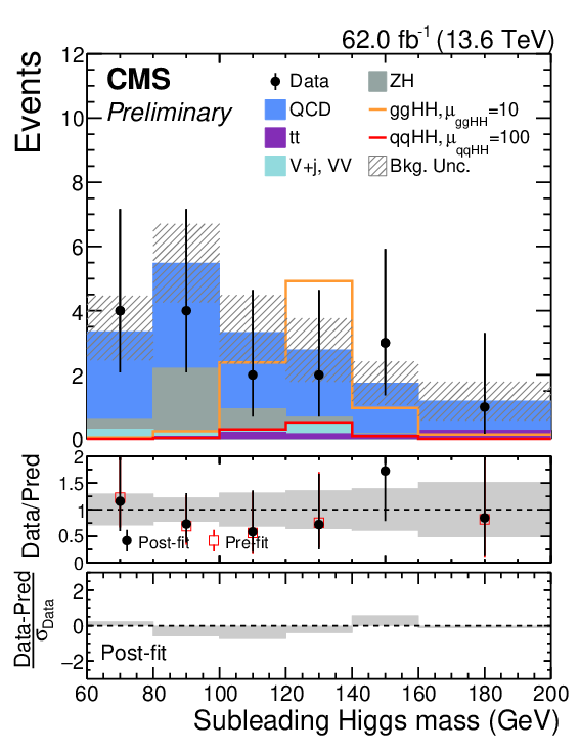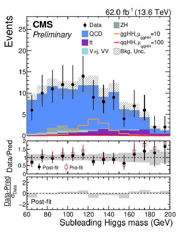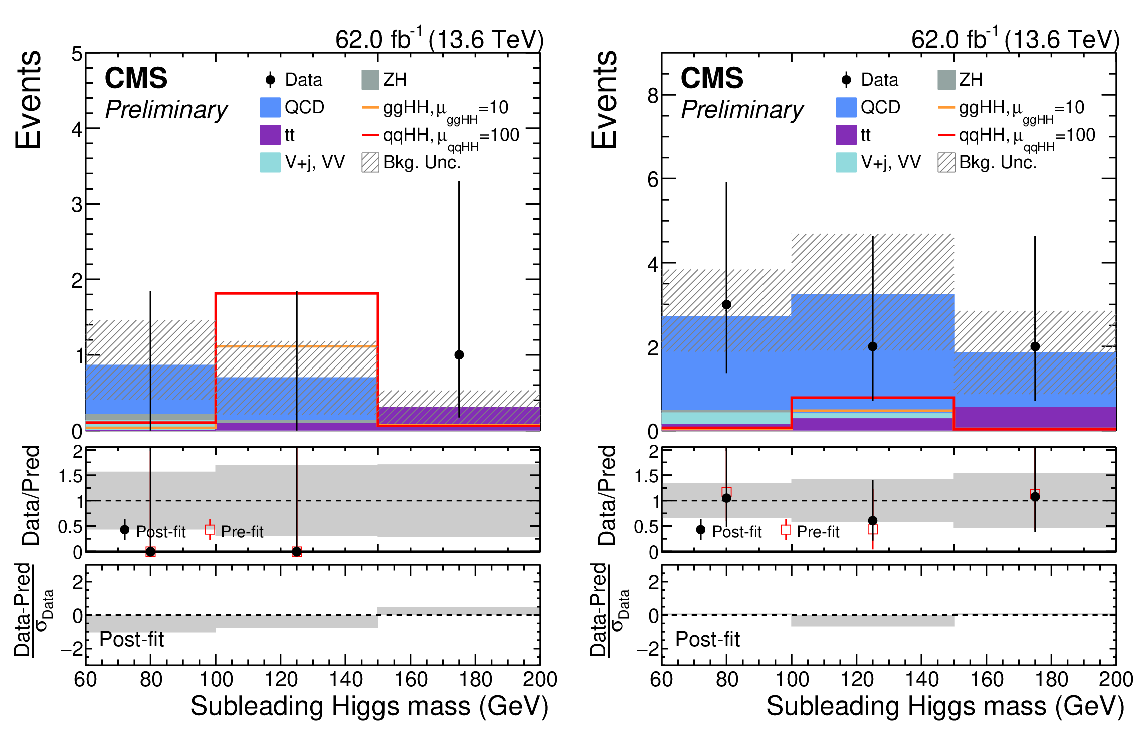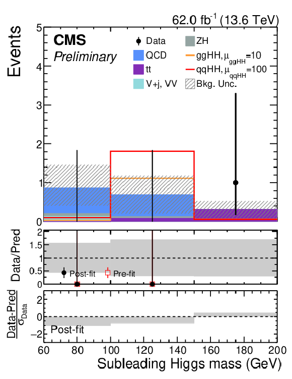 Pre-fit and post-fit distributions of the fitted observables for the $ \mathrm{g}\mathrm{g}\mathrm{H}\mathrm{H} $-inclusive HPSR (left) and LPSR (right) categories of the merged analysis following the mass-fit method. Distributions are shown for data (black points) and the different background contributions from QCD multijet, $ \mathrm{t} \overline{\mathrm{t}} $, $ \mathrm{V}+\text{jets} $, dibosons, and ZH productions. The expected distributions for SM $ \mathrm{g}\mathrm{g}\mathrm{H}\mathrm{H} $ (orange) and $ \text{qq}\mathrm{H}\mathrm{H} $ (red) signals are overlaid and scaled by a multiplicative factor to improve their visibility. |