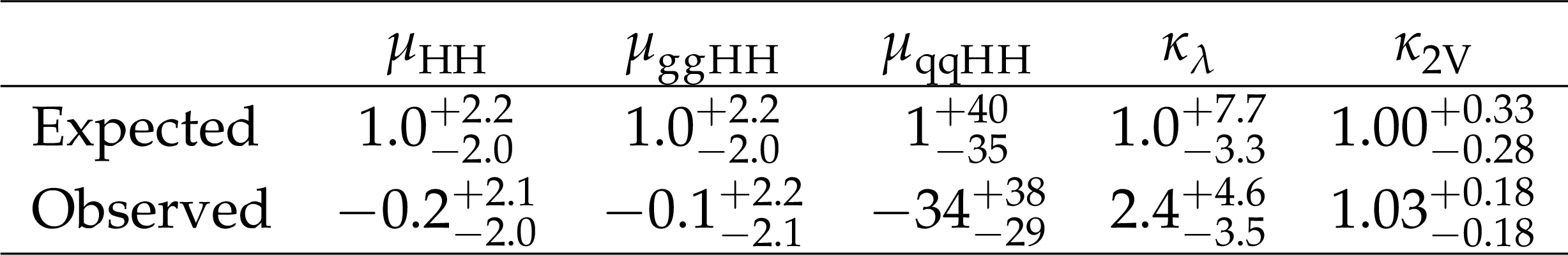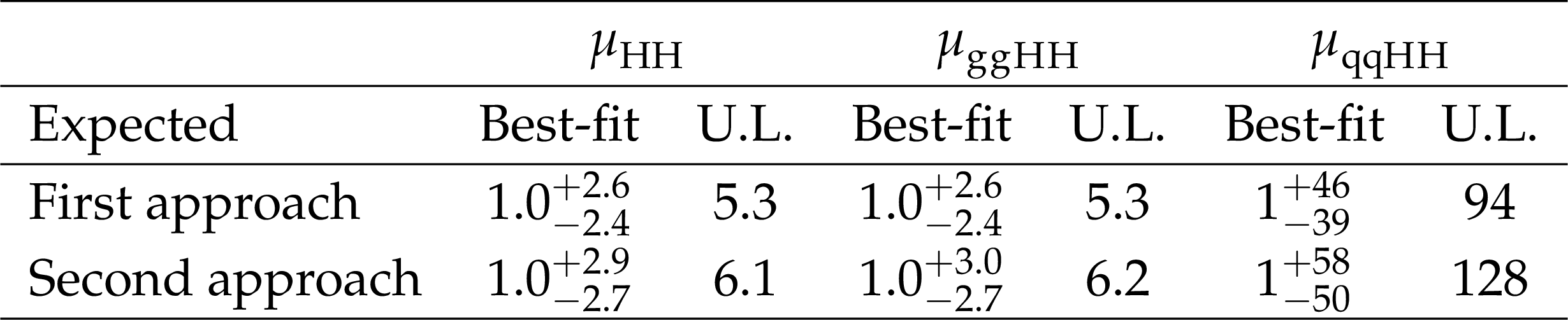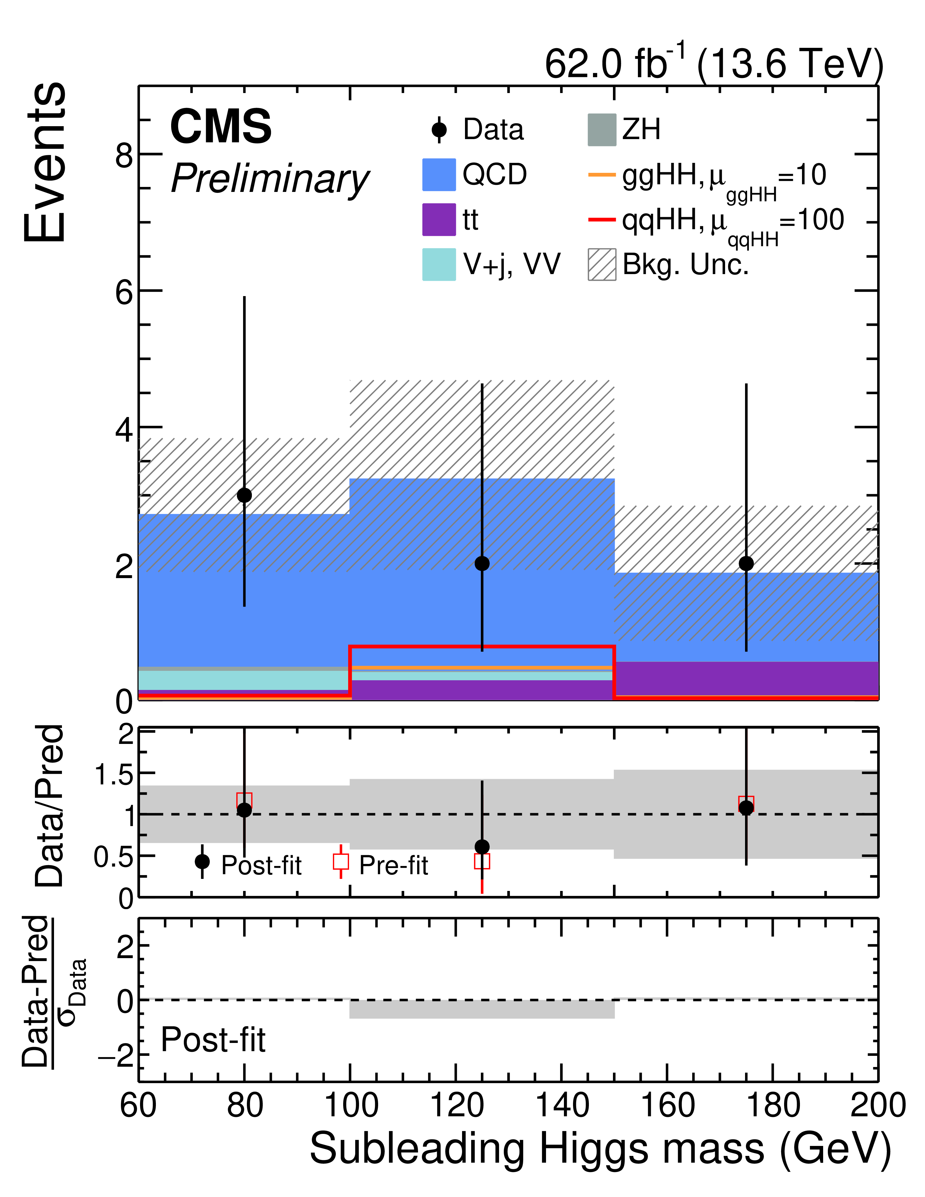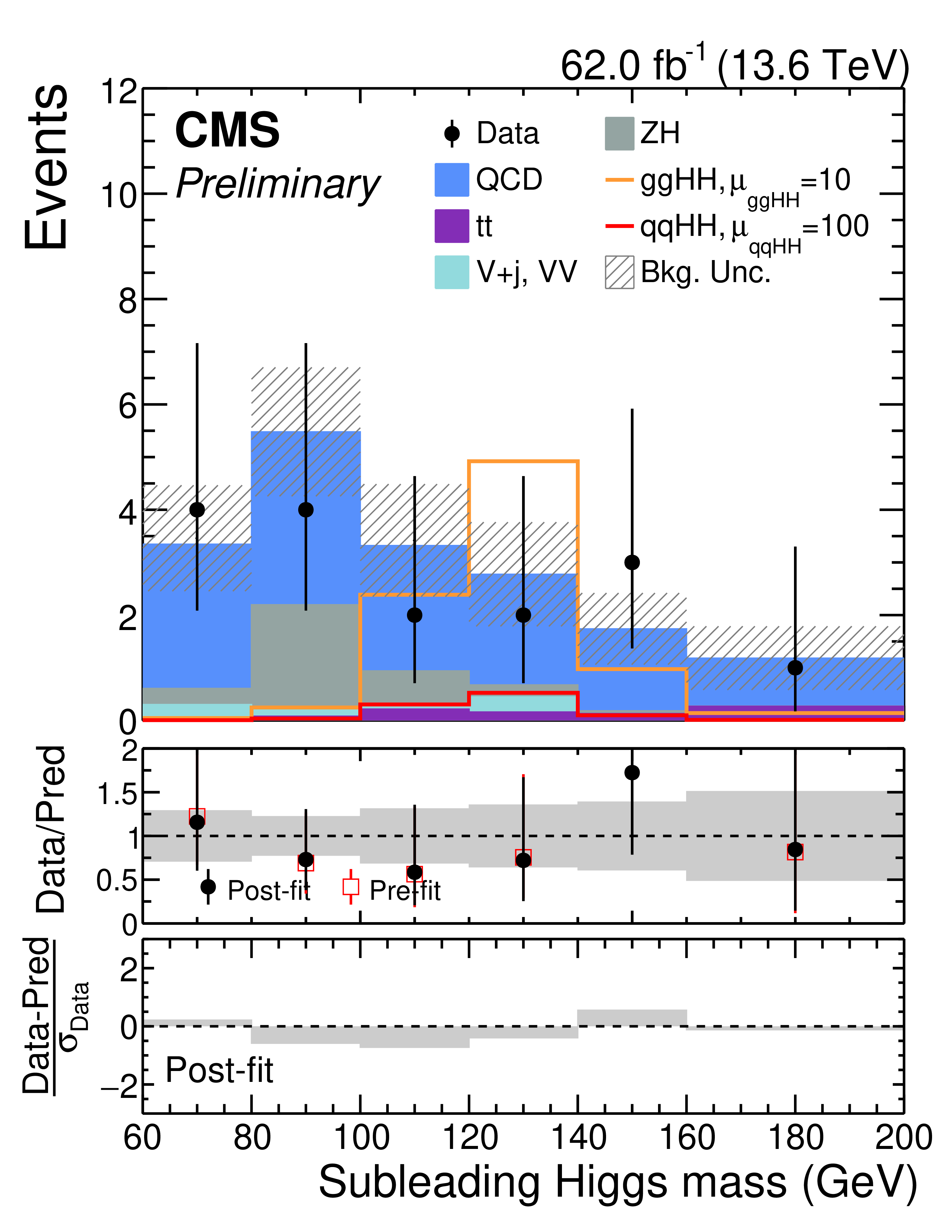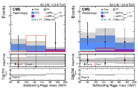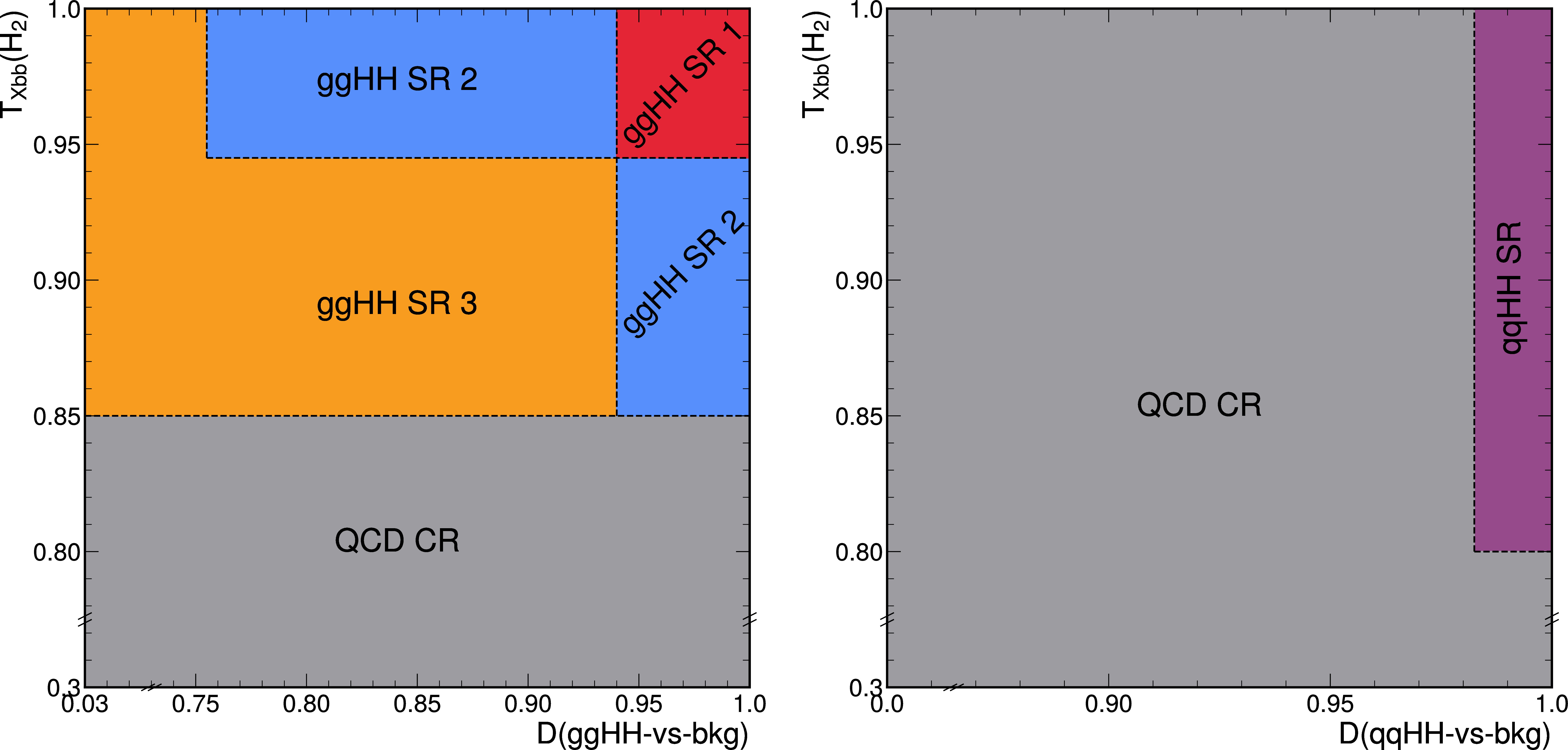 Pre-fit and post-fit distributions of the fitted observables for the $ \mathrm{g}\mathrm{g}\mathrm{H}\mathrm{H} $-inclusive HPSR (left) and LPSR (right) categories of the merged analysis following the mass-fit method. Distributions are shown for data (black points) and the different background contributions from QCD multijet, $ \mathrm{t} \overline{\mathrm{t}} $, $ \mathrm{V}+\text{jets} $, dibosons, and ZH productions. The expected distributions for SM $ \mathrm{g}\mathrm{g}\mathrm{H}\mathrm{H} $ (orange) and $ \text{qq}\mathrm{H}\mathrm{H} $ (red) signals are overlaid and scaled by a multiplicative factor to improve their visibility. |