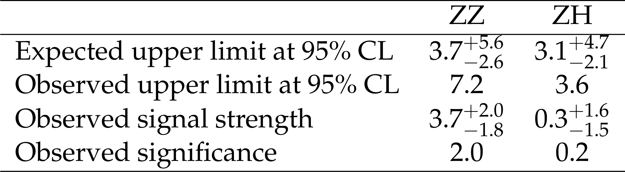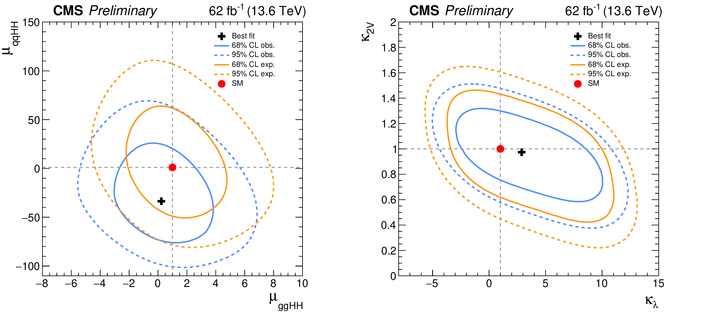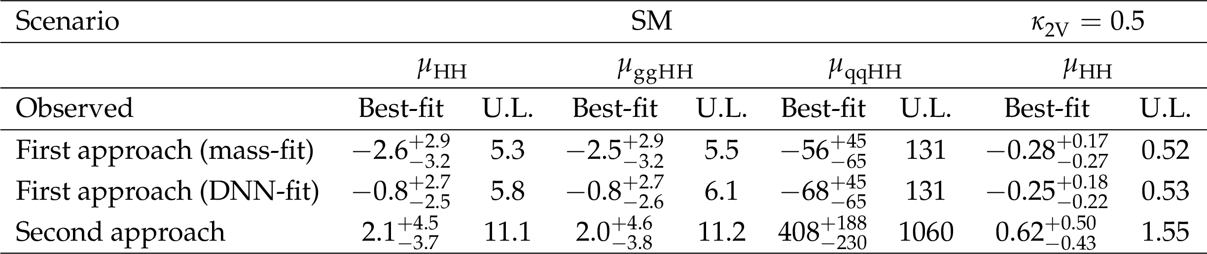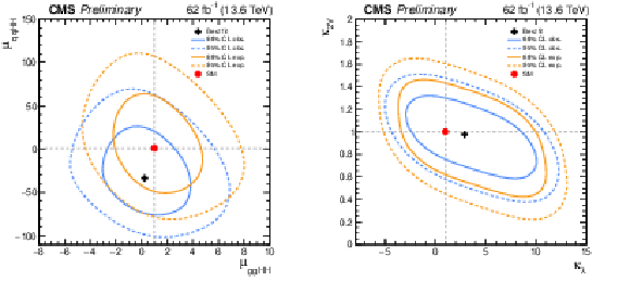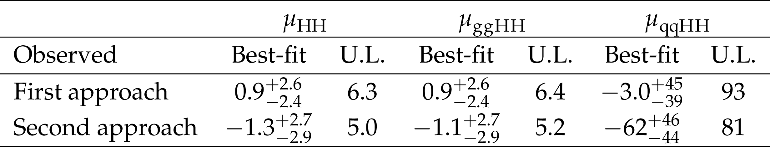 Pre-fit and post-fit distributions of the fitted observables for the $ \mathrm{g}\mathrm{g}\mathrm{H}\mathrm{H} $-inclusive HPSR (left) and LPSR (right) categories of the merged analysis following the mass-fit method. Distributions are shown for data (black points) and the different background contributions from QCD multijet, $ \mathrm{t} \overline{\mathrm{t}} $, $ \mathrm{V}+\text{jets} $, dibosons, and ZH productions. The expected distributions for SM $ \mathrm{g}\mathrm{g}\mathrm{H}\mathrm{H} $ (orange) and $ \text{qq}\mathrm{H}\mathrm{H} $ (red) signals are overlaid and scaled by a multiplicative factor to improve their visibility. |