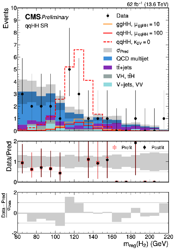 Pre-fit and post-fit distributions of the fitted observables for the $ \text{qq}\mathrm{H}\mathrm{H} $ HPSR (left) and LPSR (right) categories of the merged analysis. Distributions are shown for data (black points) and the different background contributions from QCD multijet, $ \mathrm{t} \overline{\mathrm{t}} $, $ \mathrm{V}+\text{jets} $, dibosons, and ZH productions. The expected distributions for SM $ \mathrm{g}\mathrm{g}\mathrm{H}\mathrm{H} $ (orange) and $ \text{qq}\mathrm{H}\mathrm{H} $ (red) signals are overlaid and scaled by a multiplicative factor to improve their visibility. |