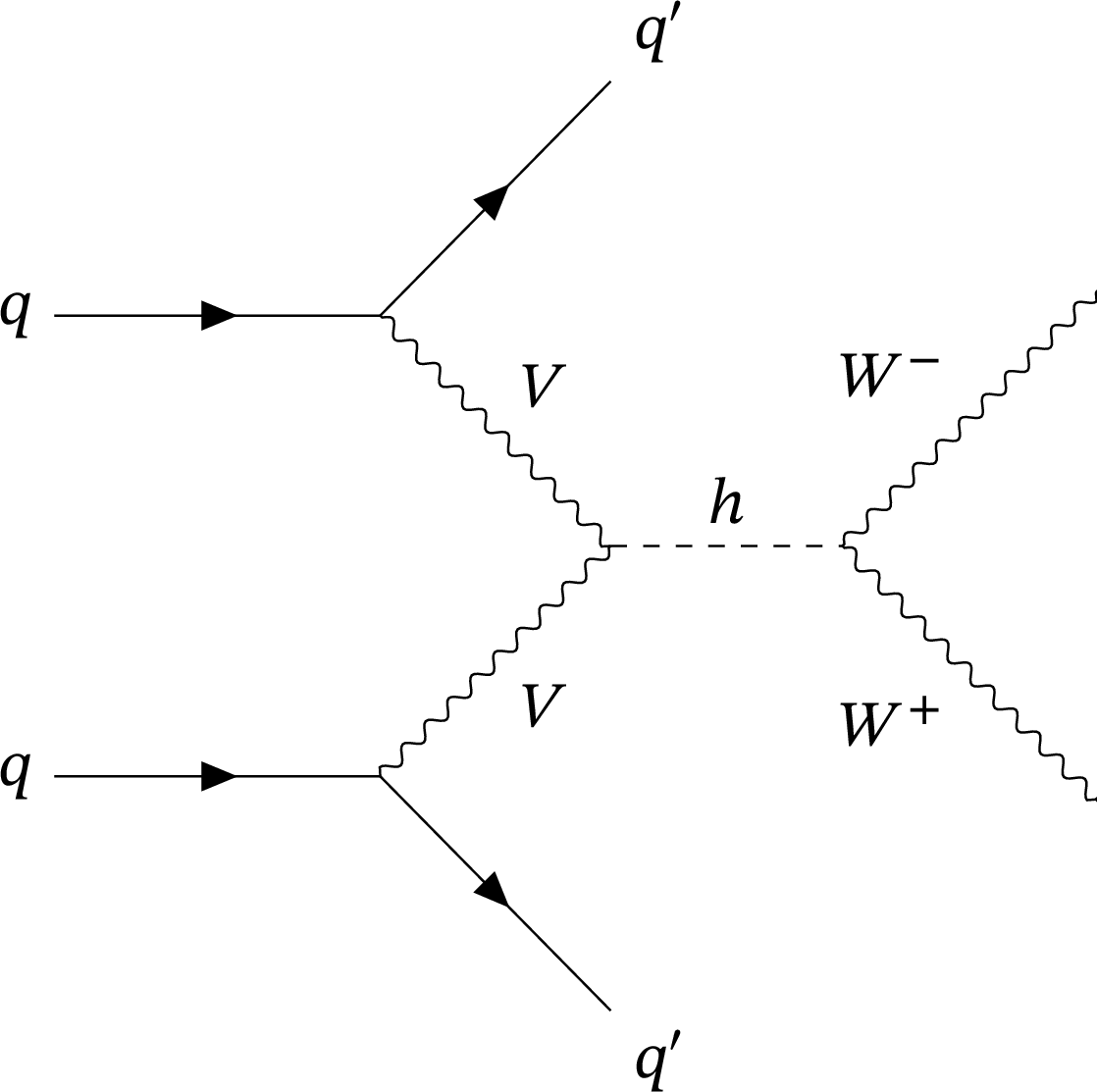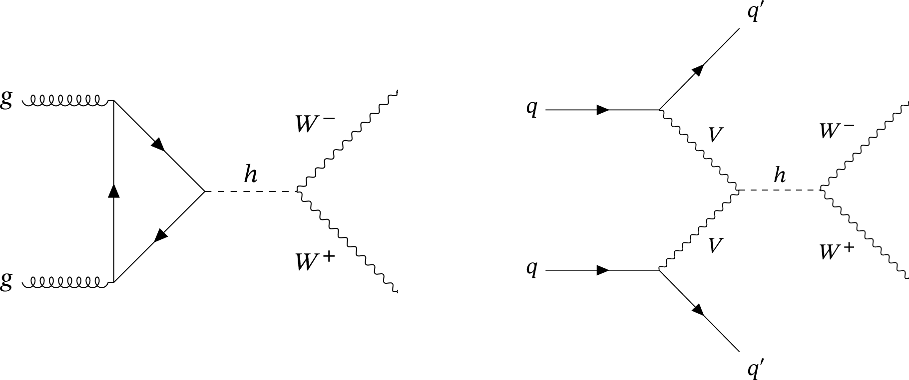 Example of feynman diagrams for Higgs boson production and decays to WW in ggF (left) and VBF (right). |