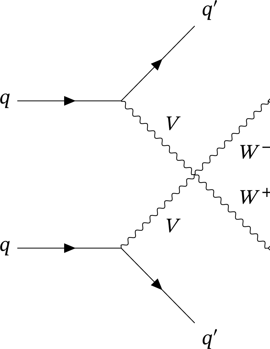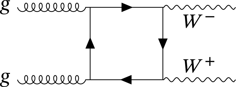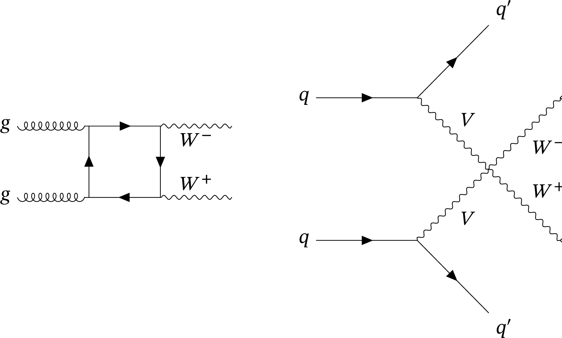 Feynman diagrams for continuum WW production: $ \mathrm{g}\mathrm{g} \to \mathrm{W}\mathrm{W} $ (left) and $ \mathrm{q}\mathrm{q} \to \mathrm{q}\mathrm{q}\mathrm{W}\mathrm{W} $ (right). |