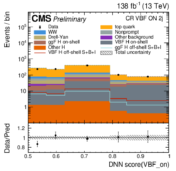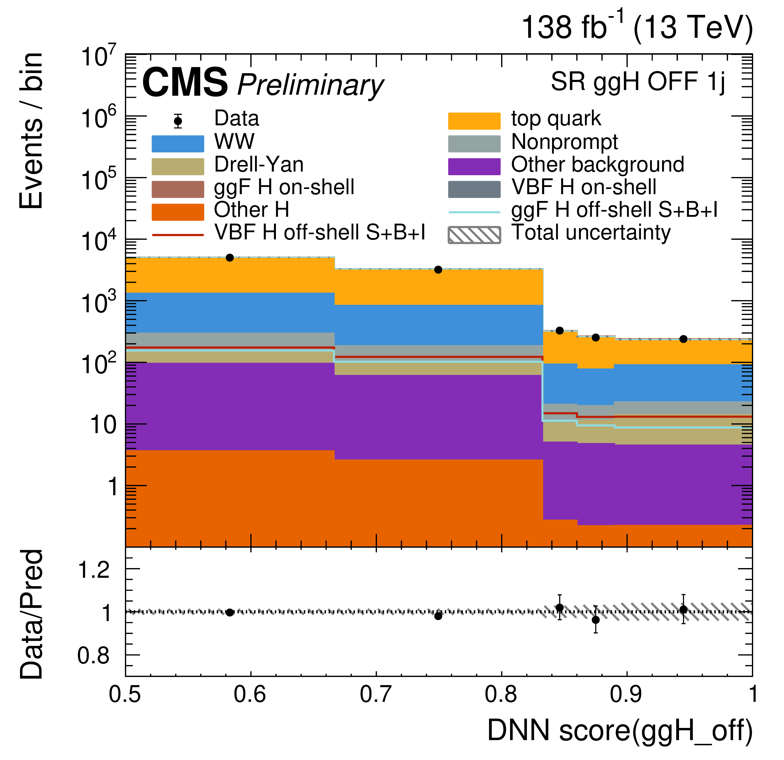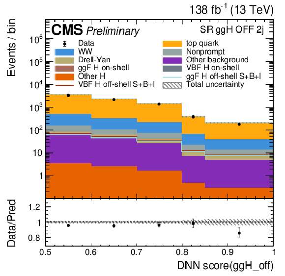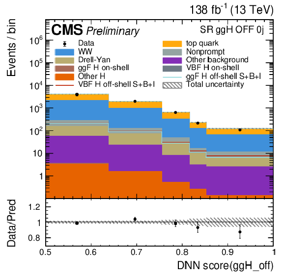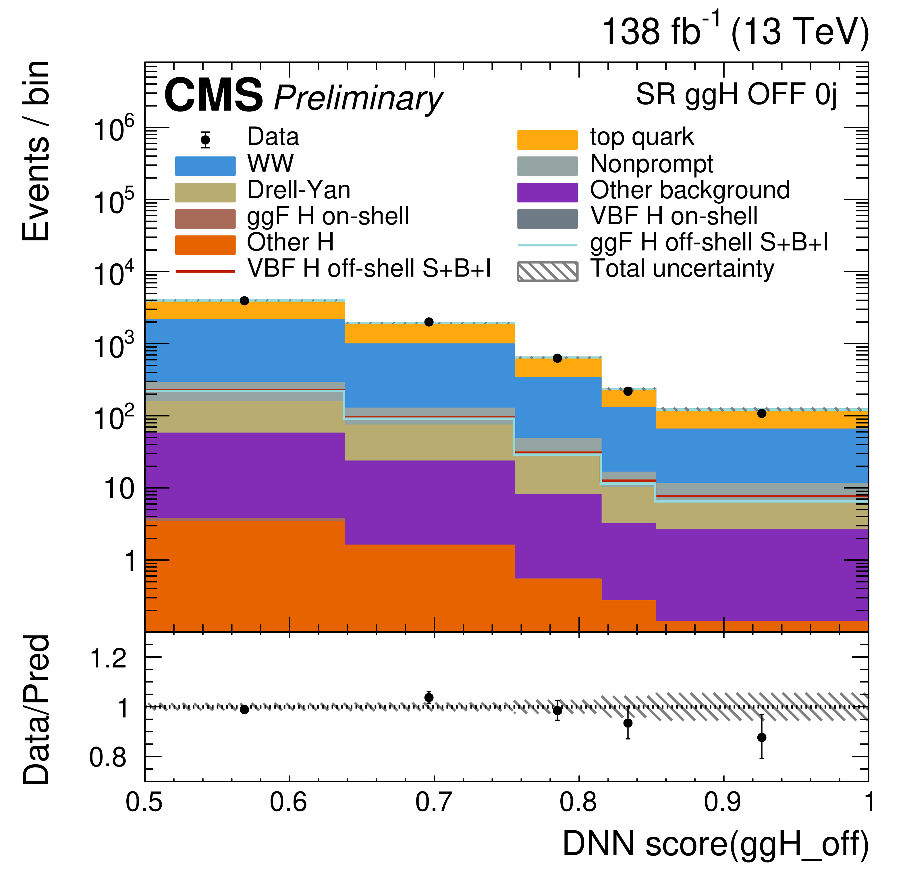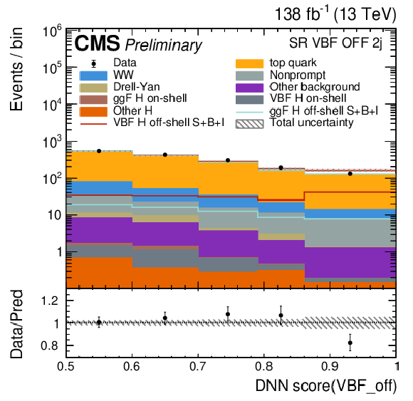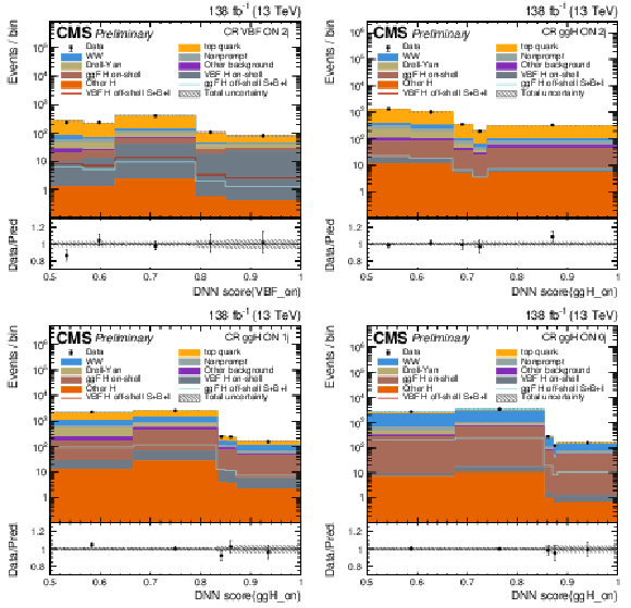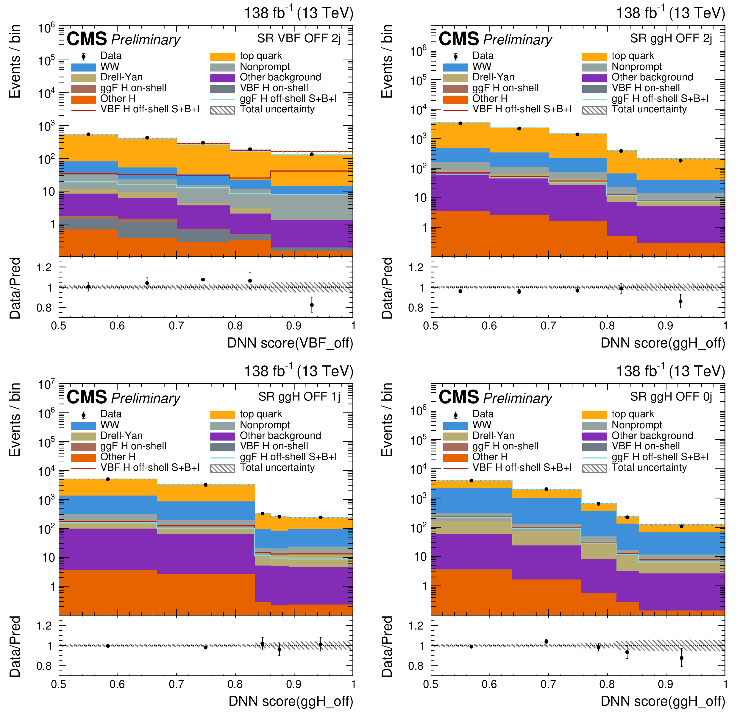 Post-fit DNN output distributions in each off-shell SR. From upper left to lower right: (upper left) 2-jet DNN score for VBF SR, (upper right) 2-jet DNN score for ggF SR, (lower left) 1-jet DNN score for ggF SR, and (lower right) 0-jet DNN score for ggF SR. The ggF H off-shell S+B+I and VBF H off-shell S+B+I contributions are displayed both as part of the total stacked prediction with all other processes in the legend, and again as separate lines that are stacked with respect to each other but unstacked from the other processes, overlaid on top of the stacked background for visibility. The Data/Pred ratio includes the post-fit signal. |