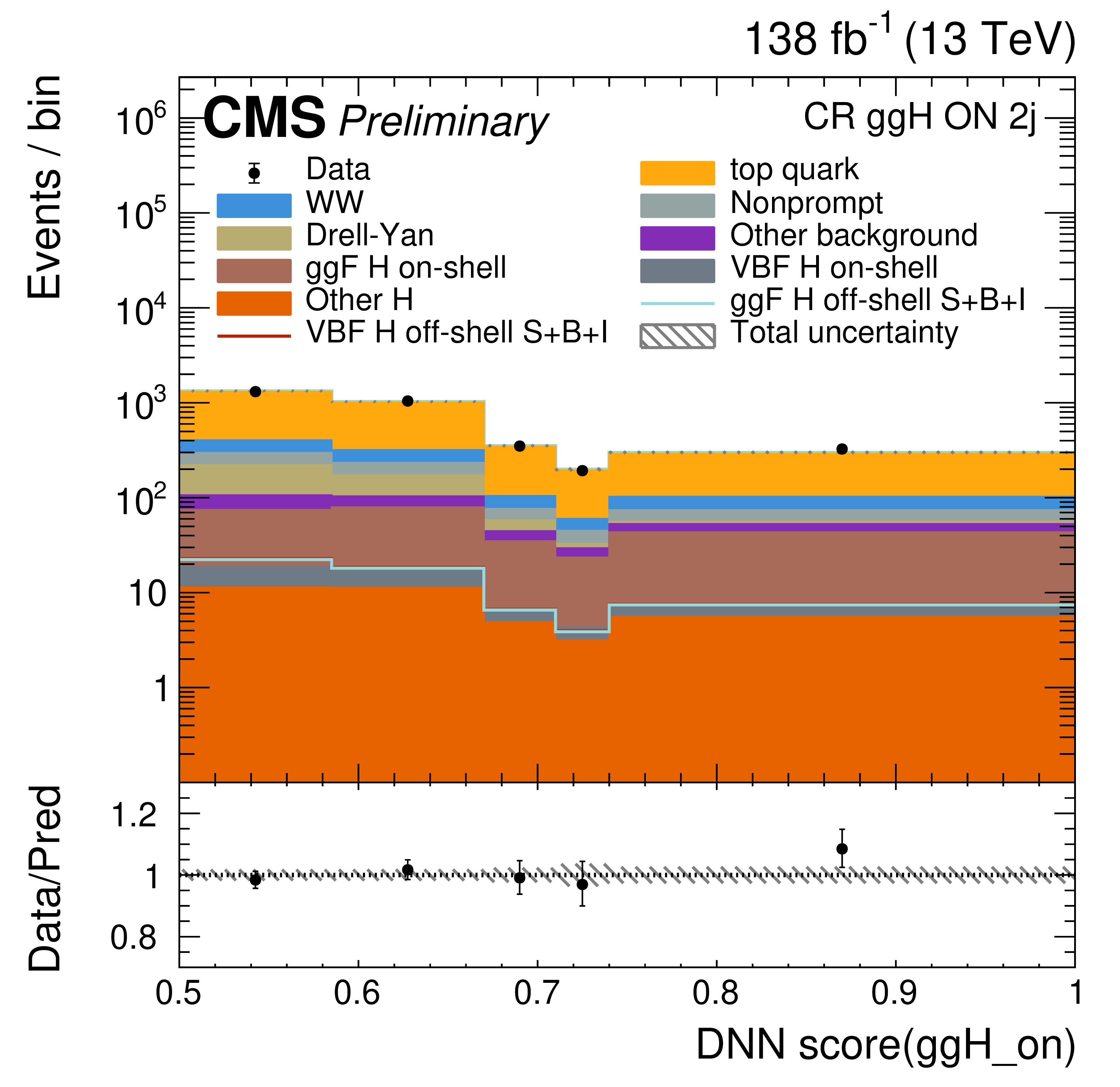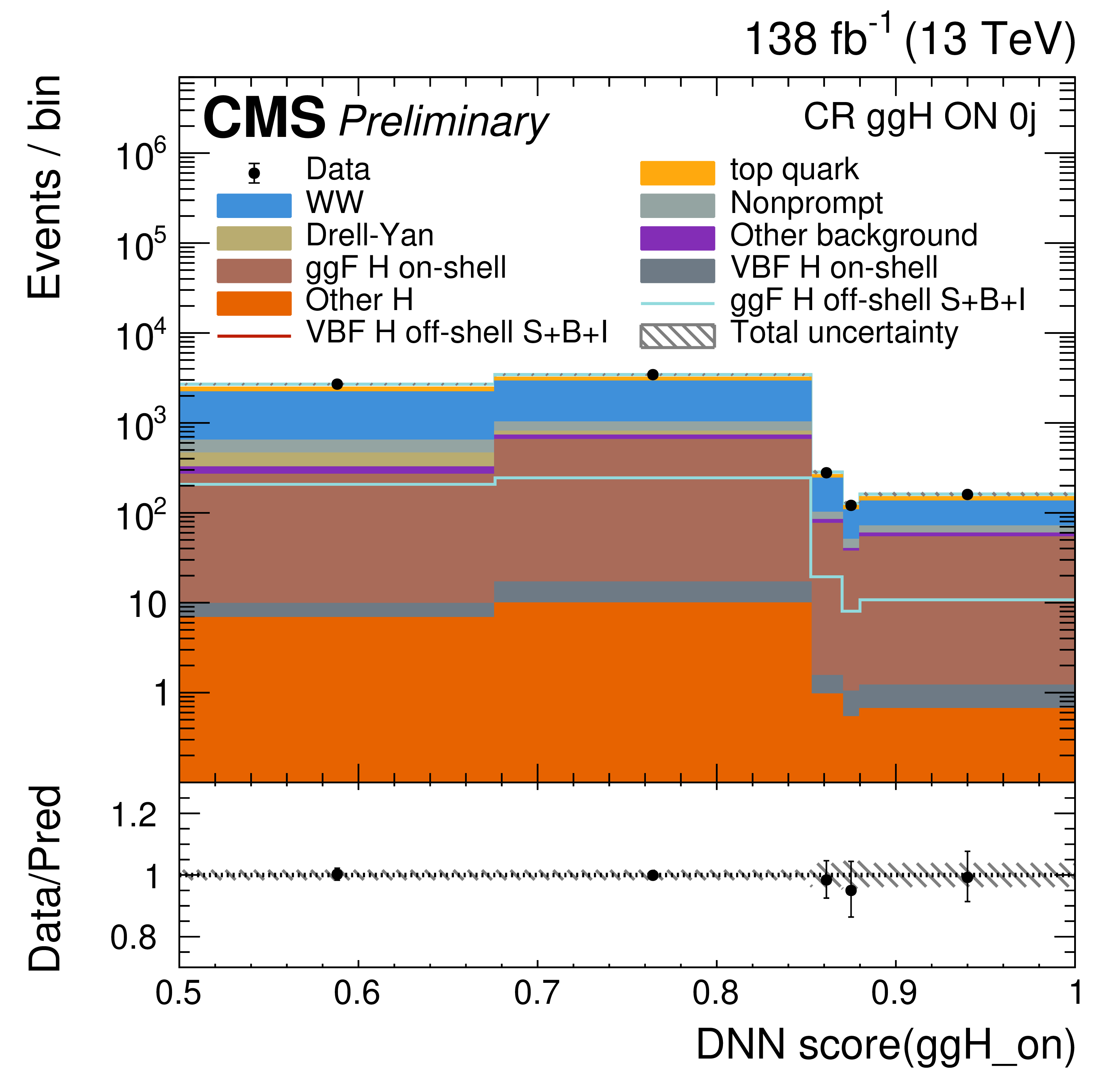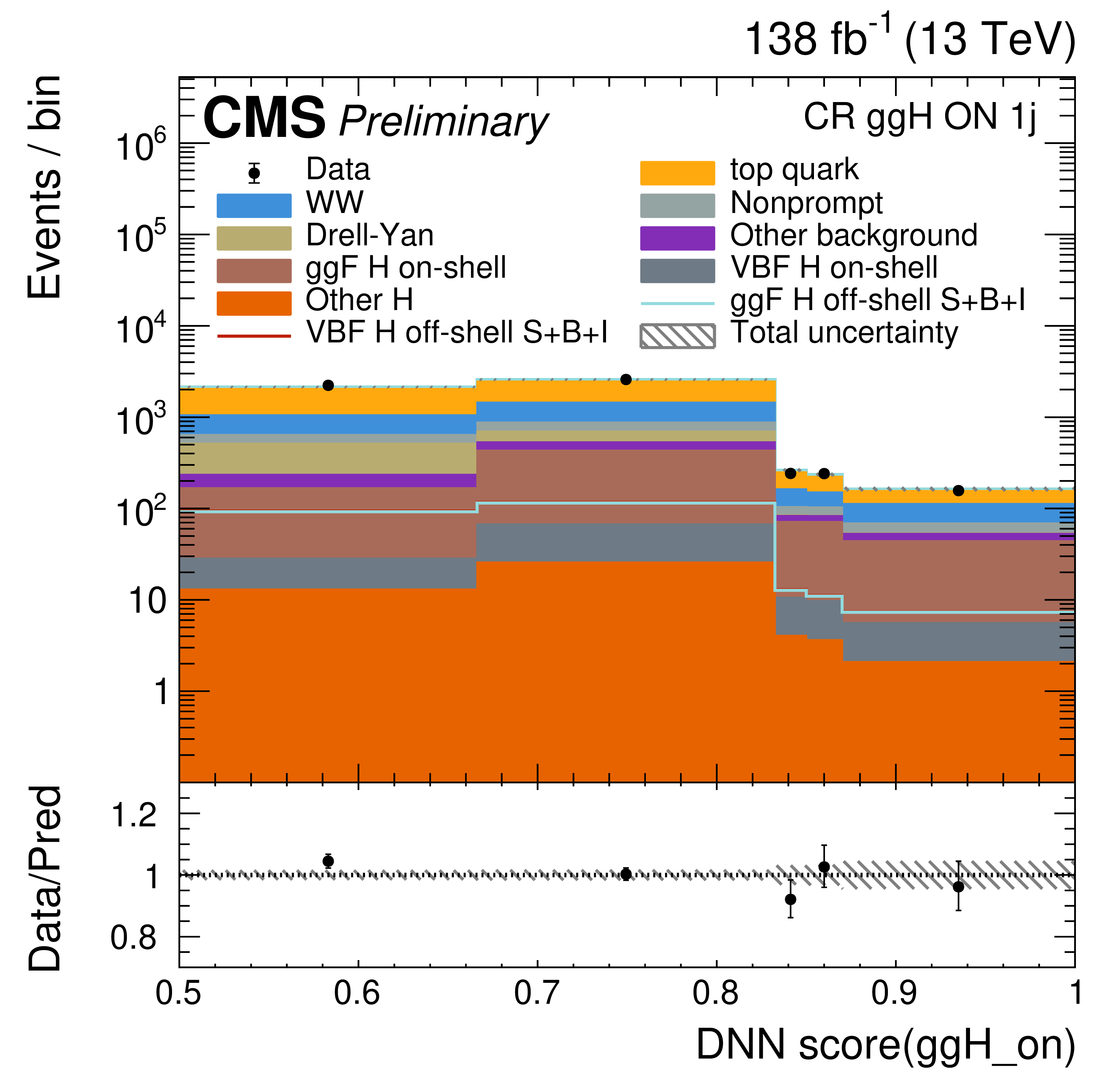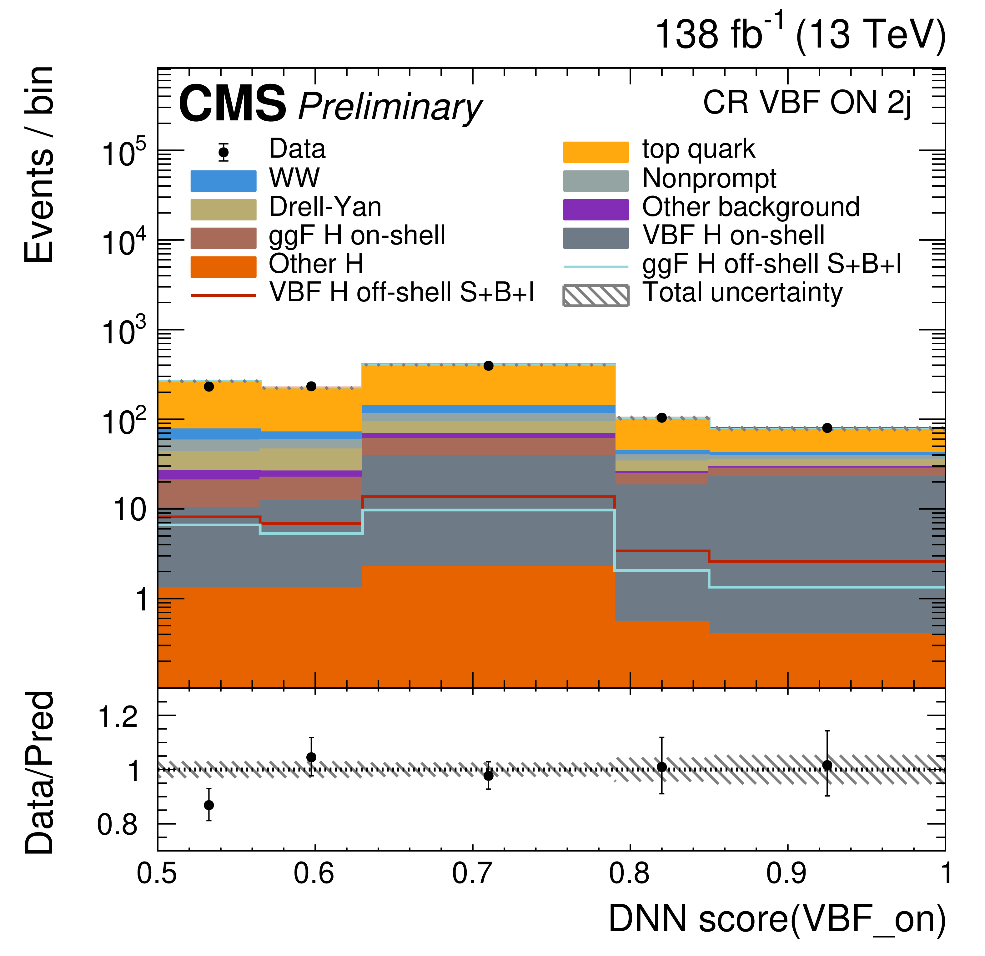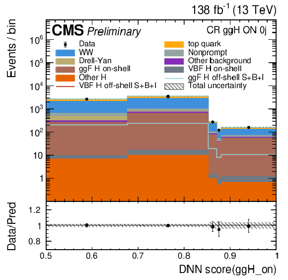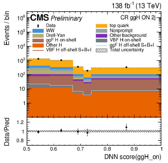 Post-fit DNN output distributions in each off-shell SR. From upper left to lower right: (upper left) 2-jet DNN score for VBF SR, (upper right) 2-jet DNN score for ggF SR, (lower left) 1-jet DNN score for ggF SR, and (lower right) 0-jet DNN score for ggF SR. The ggF H off-shell S+B+I and VBF H off-shell S+B+I contributions are displayed both as part of the total stacked prediction with all other processes in the legend, and again as separate lines that are stacked with respect to each other but unstacked from the other processes, overlaid on top of the stacked background for visibility. The Data/Pred ratio includes the post-fit signal. |