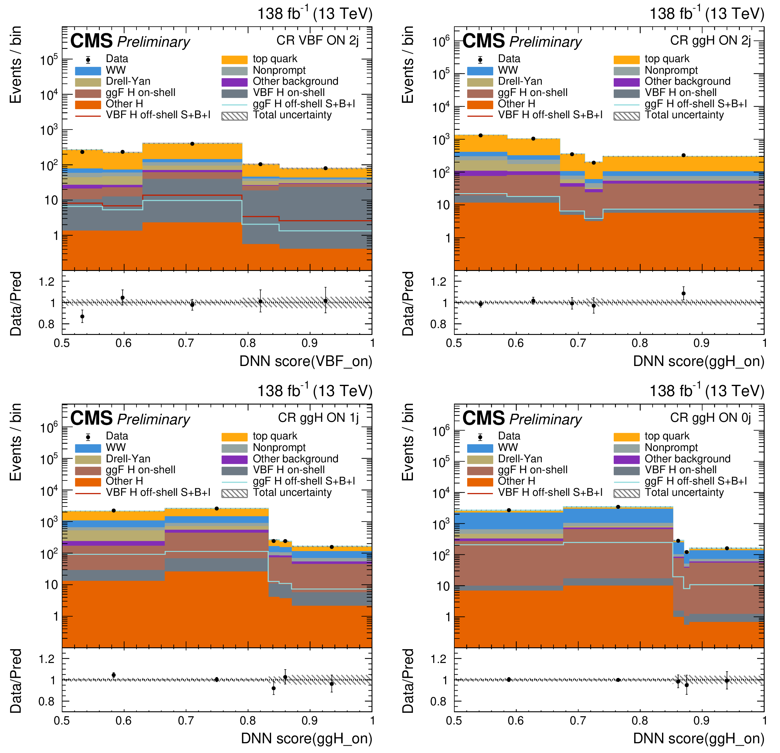 Post-fit DNN output distributions in each on-shell CR. From upper left to lower right: (upper left) 2-jet DNN score for VBF CR, (upper right) 2-jet DNN score for ggF CR, (lower left) 1-jet DNN score for ggF CR, and (lower right) 0-jet DNN score for ggF CR. The ggF H off-shell S+B+I and VBF H off-shell S+B+I contributions are displayed both as part of the total stacked prediction with all other processes in the legend, and again as separate lines that are stacked with respect to each other but unstacked from the other processes, overlaid on top of the stacked background for visibility. The Data/Pred ratio includes the post-fit signal. Note that in the ggF on-shell distributions, VBF off-shell events will most likely not populate these regions, which causes the lack of VBF off-shell S+B+I. |