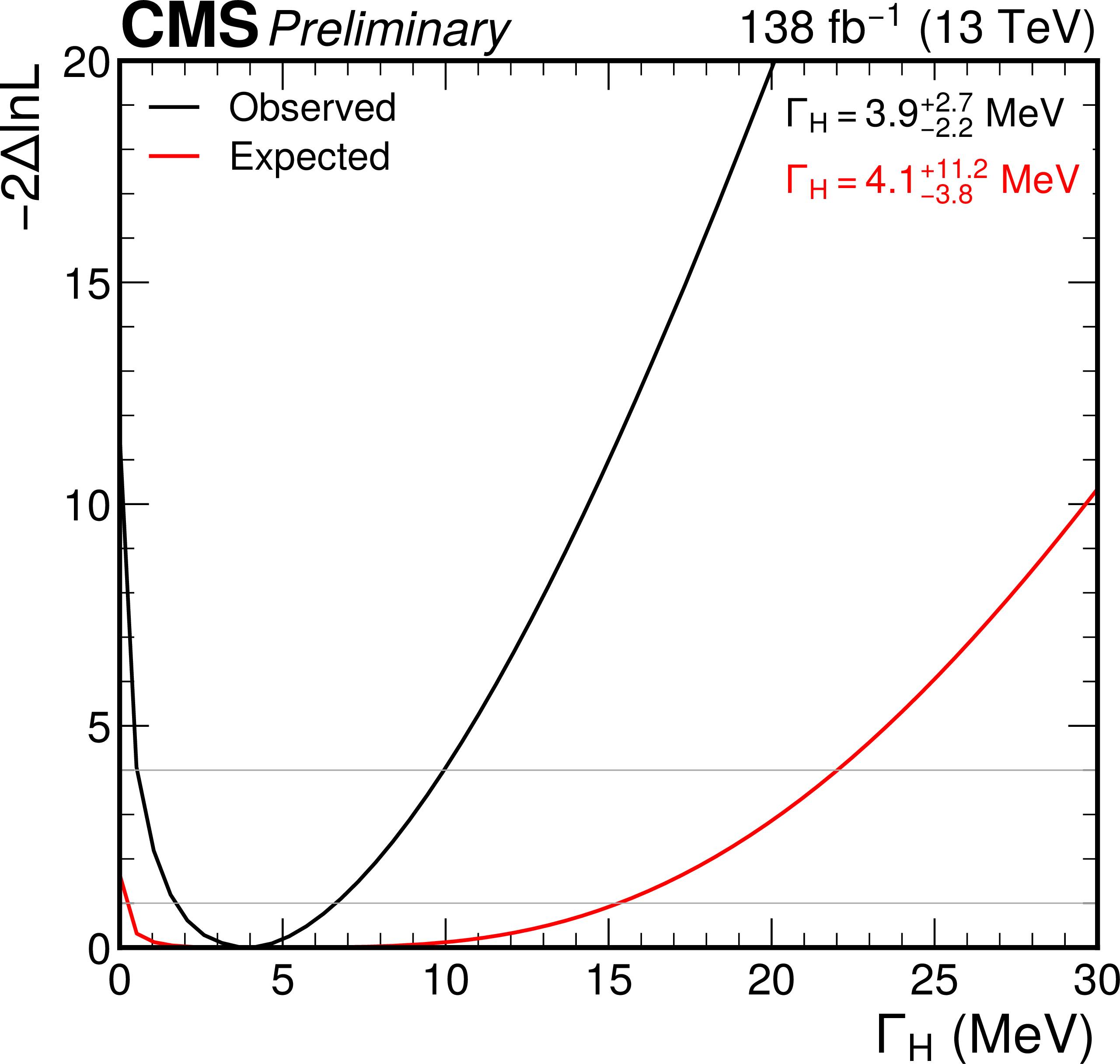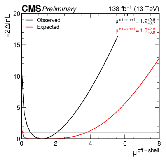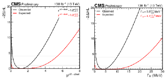 The likelihood scan corresponding for the off-shell signal strength (left) and $ \Gamma_\text{H} $ (right). The 68% and 95% confidence intervals are delineated as horizontal lines. |