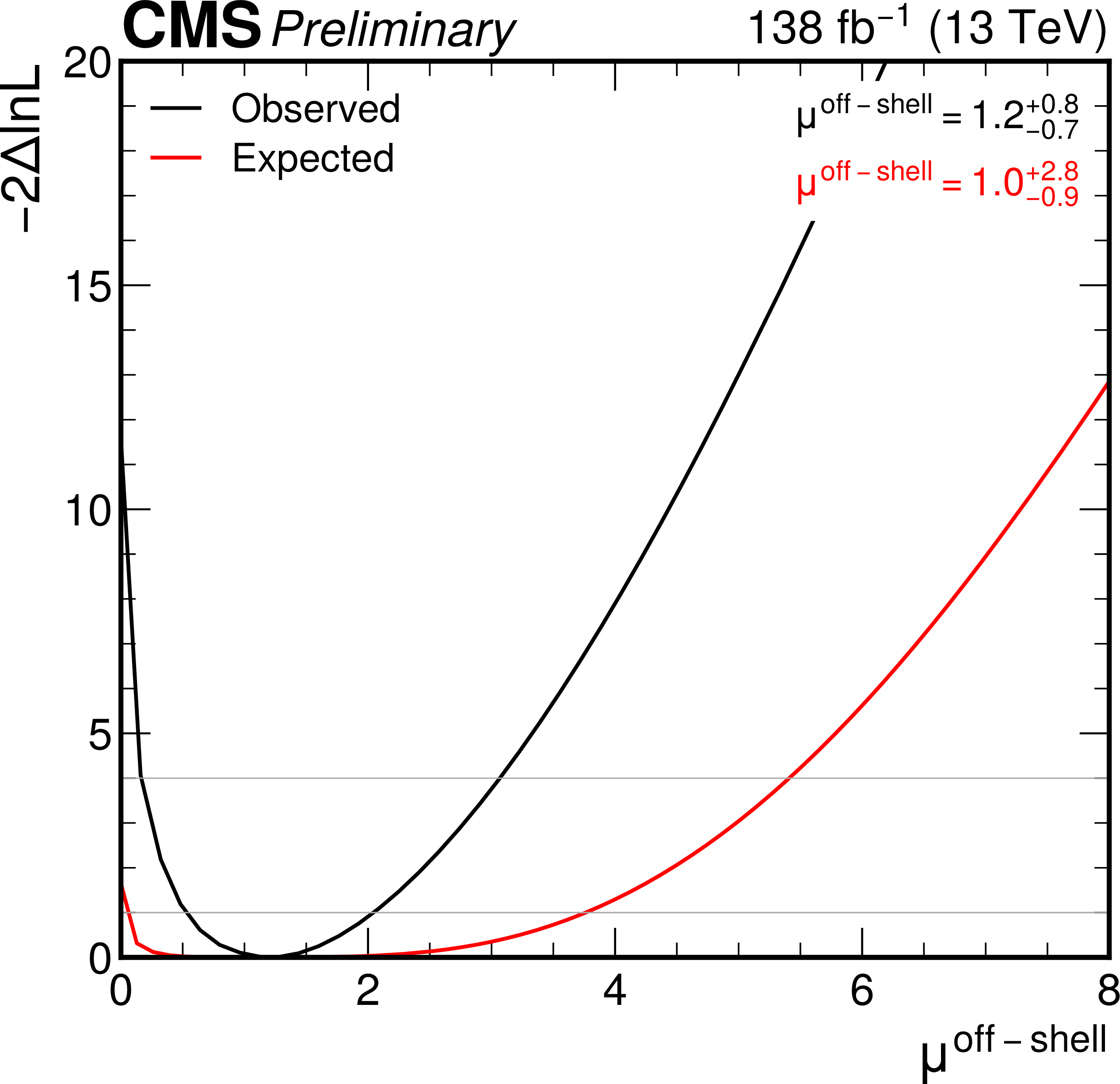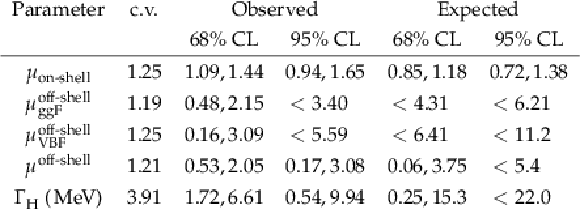 Measurements of off-shell signal strength $ \mu_{\text{off-shell}} $, on-shell signal strength $ \mu_{\text{on-shell}} $, and $ \Gamma_\text{H} $. Listed are the measurements of the $ \mathrm{H} \to \mathrm{W}\mathrm{W} $, $ \mu_{\text{off-shell}} $ and $ \Gamma_\text{H} $ in the 2 $ \ell 2\nu $ channel. The central value (c.v.) is reported together with the 68% and 95% confidence levels. |