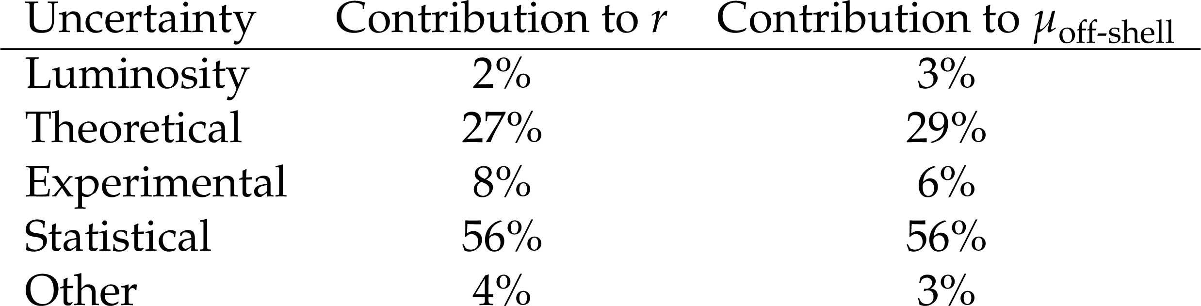 Uncertainties and their contribution to the parameter of interest $ r = \frac{\mu_\text{off-shell}}{\mu_\text{on-shell}} $. These contributions are the impact of each uncertainty group divided by the total uncertainty. ``Other" includes background normalization parameters and MC statistical uncertainties. The final column showcases the impact of each uncertainty group on $ \mu_\text{off-shell} $. |