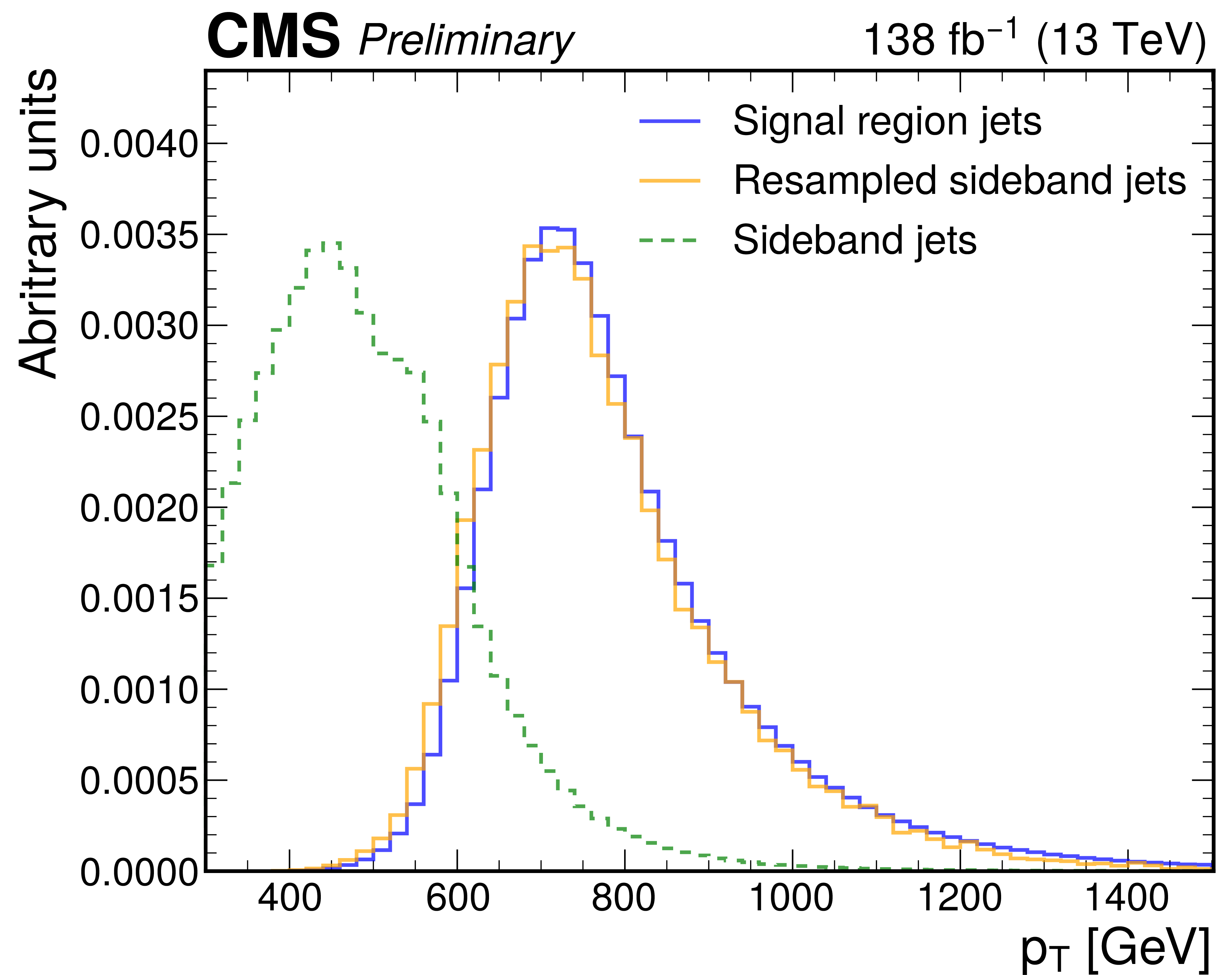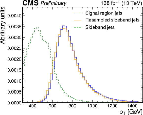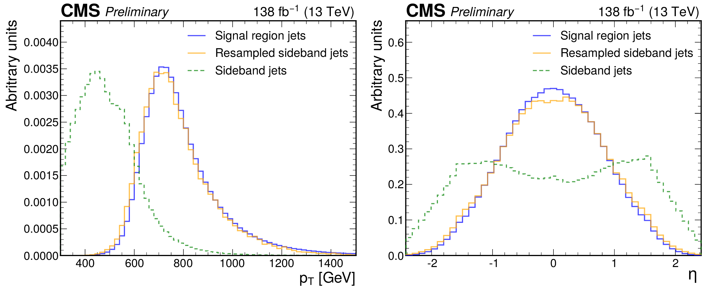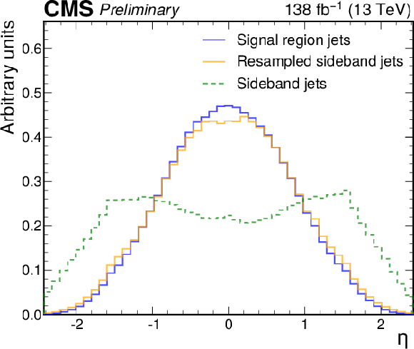Jet $ p_{\mathrm{T}} $ (left) and $ \eta $ (right) distributions before and after resampling jets from the 2 $ < |\Delta\eta_\text{jj}| < $ 2.5 sideband (green) to match the distribution in the signal region (blue). The distributions of reweighted jets are shown in orange. Histograms are normalized to unity; see text for details. |