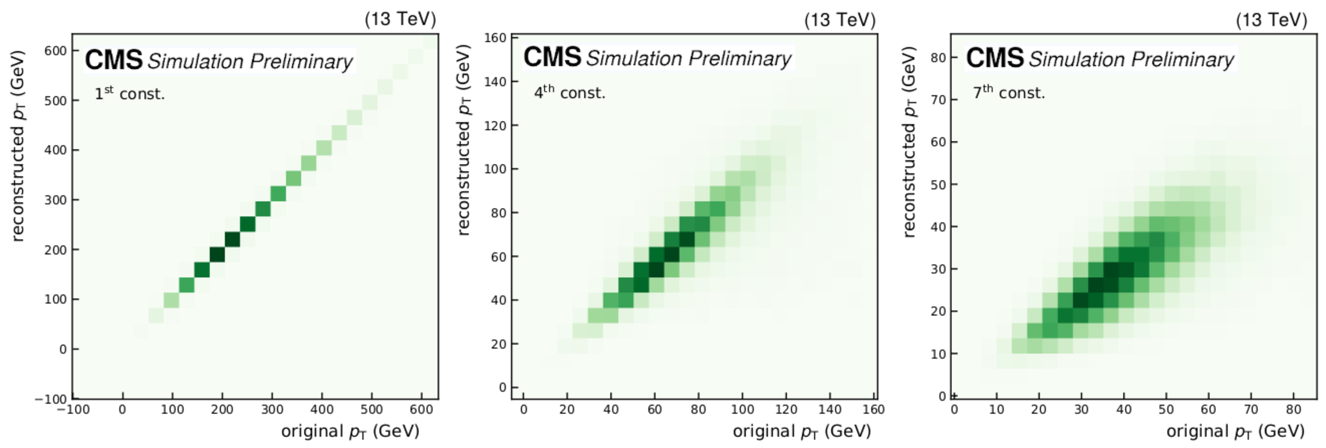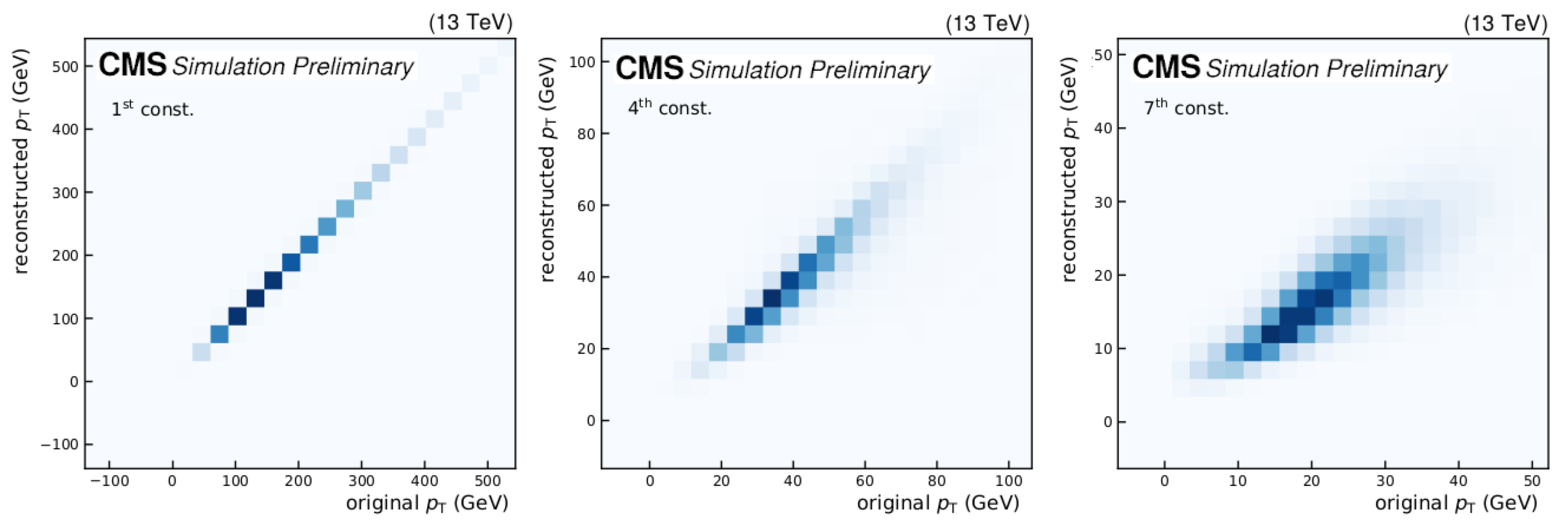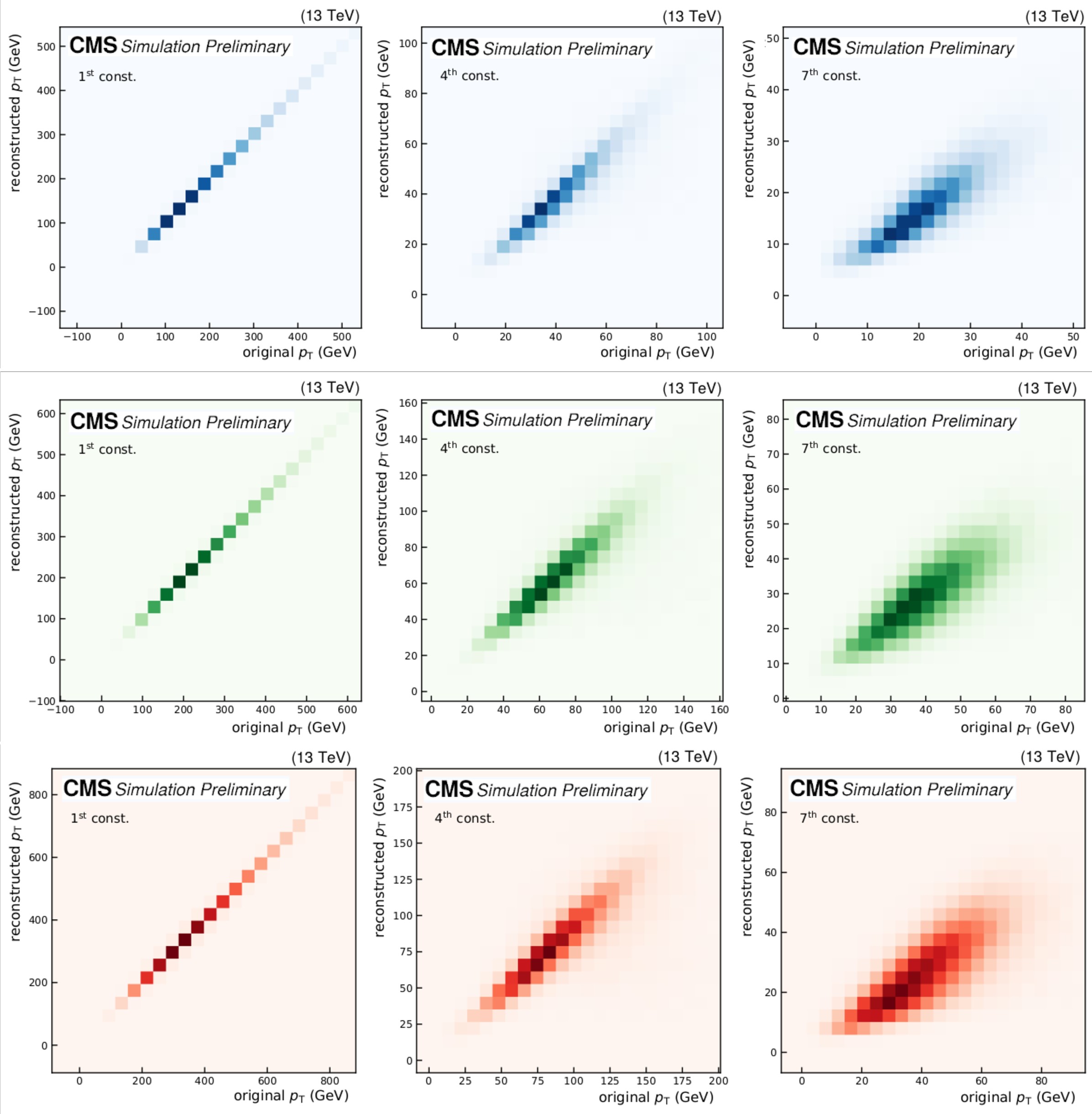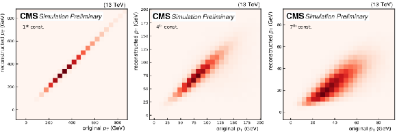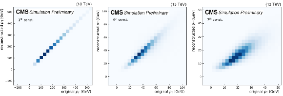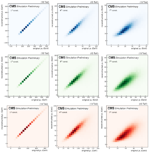 Upper row: $ p_{\mathrm{T}} $ reconstruction for SM backgournd jets. Middle row: $ p_{\mathrm{T}} $ reconstruction for jets from a $ \mathrm{W'} \to \mathrm{B'} \mathrm{t} \to \mathrm{b} \mathrm{Z} \mathrm{t} $ decay. Lower row: $ p_{\mathrm{T}} $ reconstruction for jets from a $ \mathrm{X}\to \mathrm{Y} \mathrm{Y'} \to 4 \mathrm{q} $ decay. |