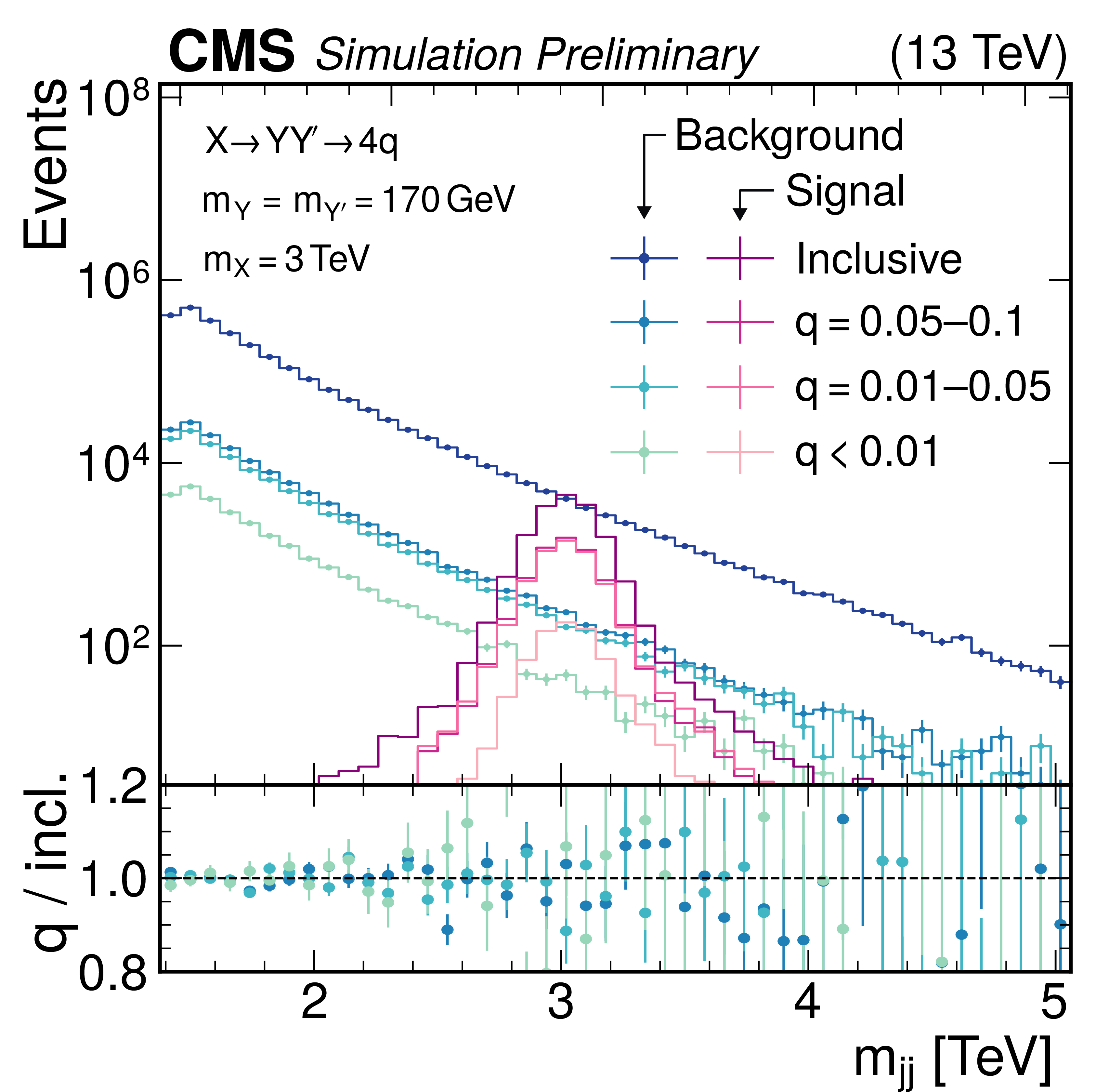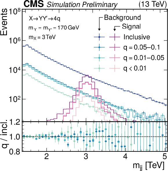 Simulated dijet invariant mass spectrum after selecting events based on the score of the \textit{VAE-QR} method. The distributions are shown in the upper panel for the SM background (blue) and the $ \mathrm{X}\to \mathrm{Y} \mathrm{Y'} \to 4 \mathrm{q} $ signal model with $ m_{\text{X}} = $ 3 TeV and $ m_{\text{Y}} =m_{\text{Y'}} = $ 170 GeV (red). The inclusive selection is compared to the three quantile ranges used in the statistical analysis. No significant difference is observed between the shapes, showing that the quantile regression performs as expected. The lower panel shows the ratio of the quantile ranges to the inclusive distribution for the SM background. |
