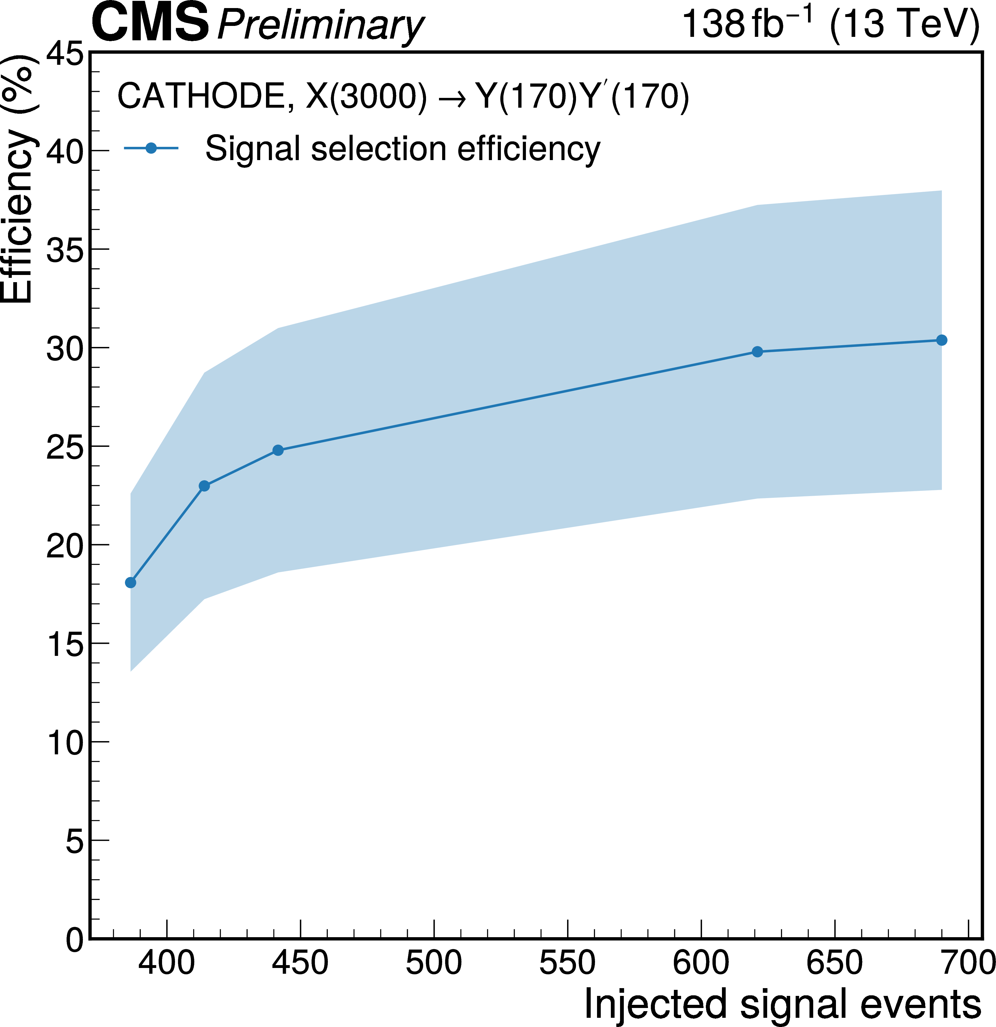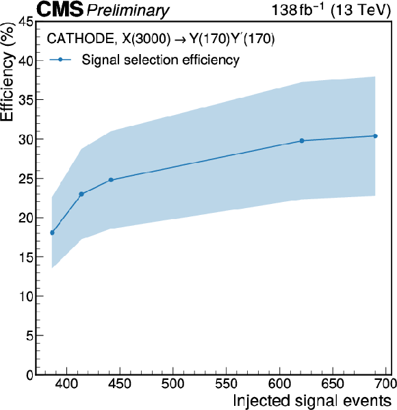 Signal selection efficiency of the weakly supervised classifier in the \textit{CATHODE} method, evaluated for the $ \mathrm{X}\to \mathrm{Y} \mathrm{Y'} \to 4 \mathrm{q} $ signal at 3 TeV. The shaded region represents the total statistical and systematic uncertainty evaluated as described in the text. |